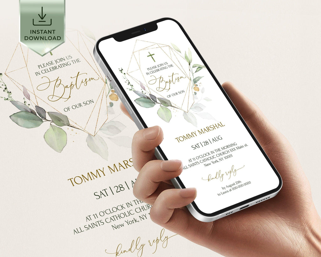 Greenery Baptism Sms Invitation | Personalized Eucalyptus Evites