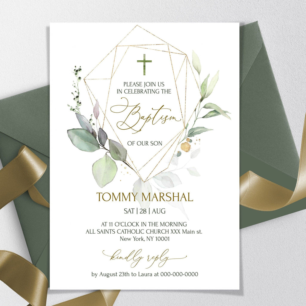 Greenery Gold Baptism Invitation Card | Personalized Christening Inspo