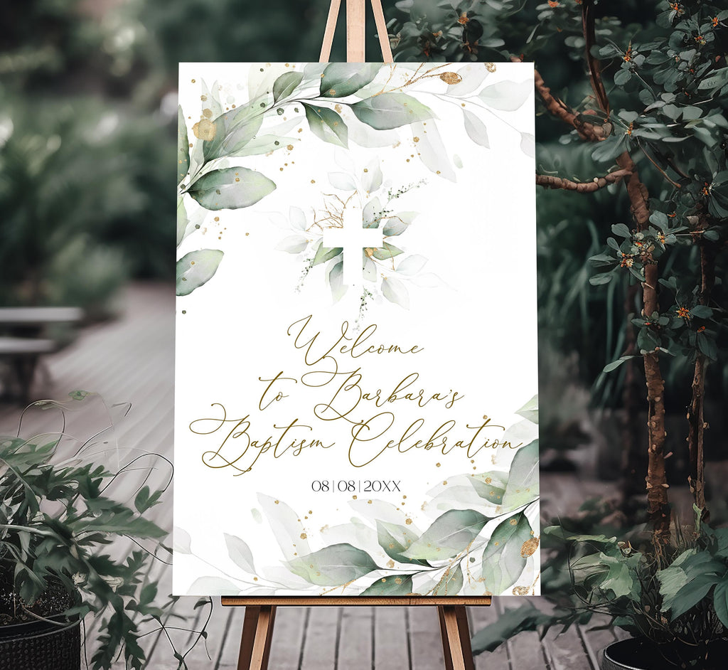 Greenery Gold Christening Welcome Poster | 6 Sizes | DIY Welcome Board