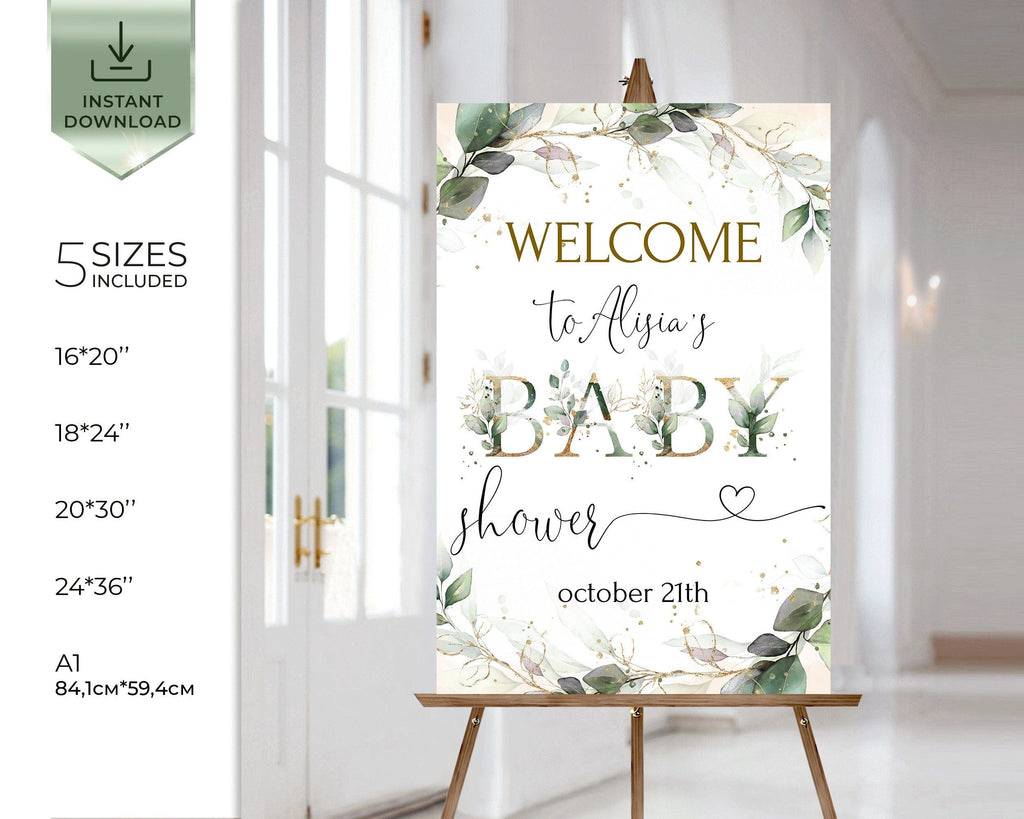 Eucalyptus Baby Shower Welcome Sign | 7 sizes | Greenery & Gold Poster