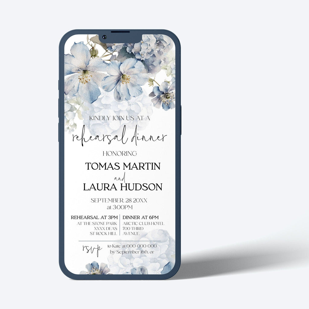 Modern Blue Rehearsal Dinner Evite, Bloom flower Rehearsal Dinner