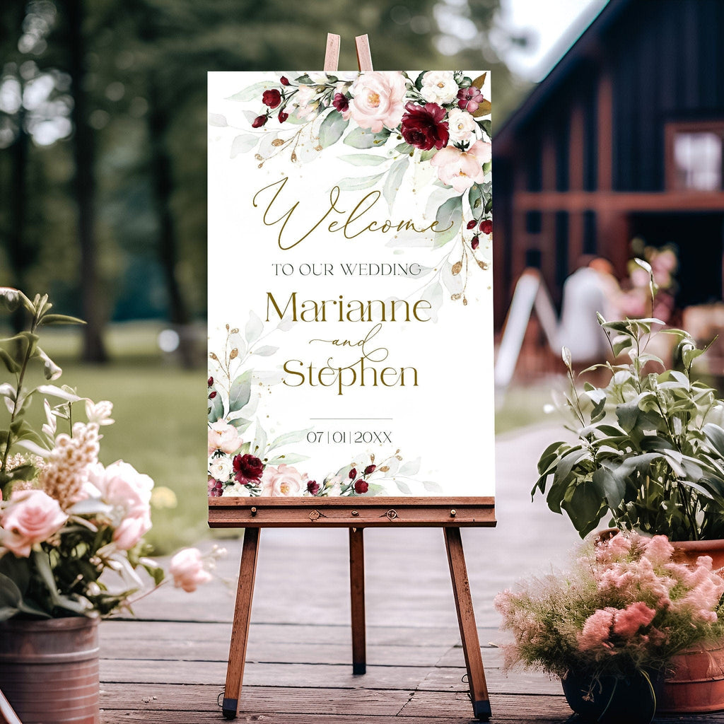 Burgundy & Plum Wedding Welcome Sign | 6 Sizes | Printable Elegant Template