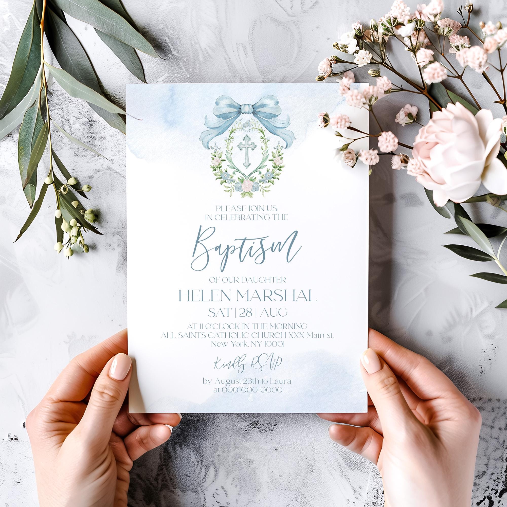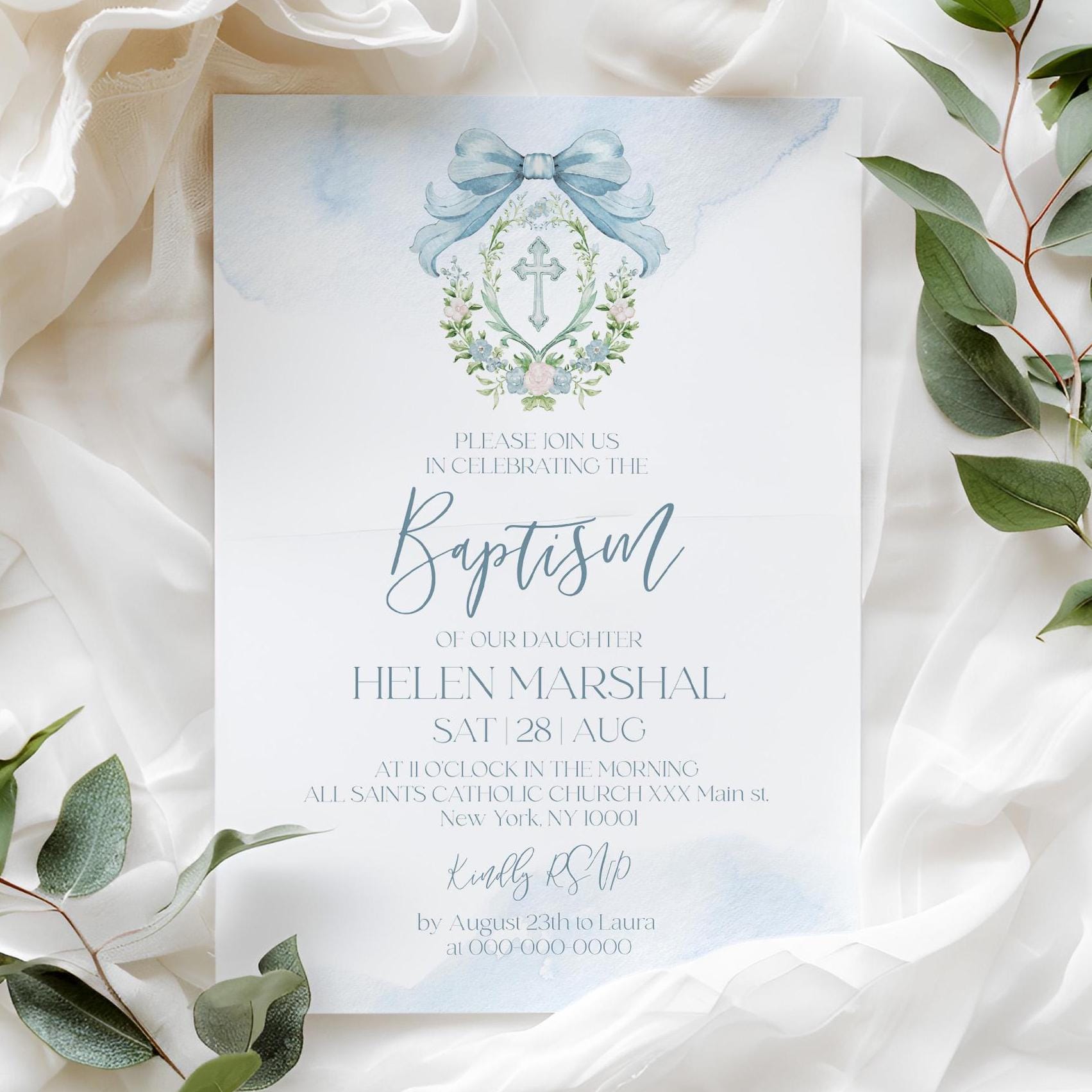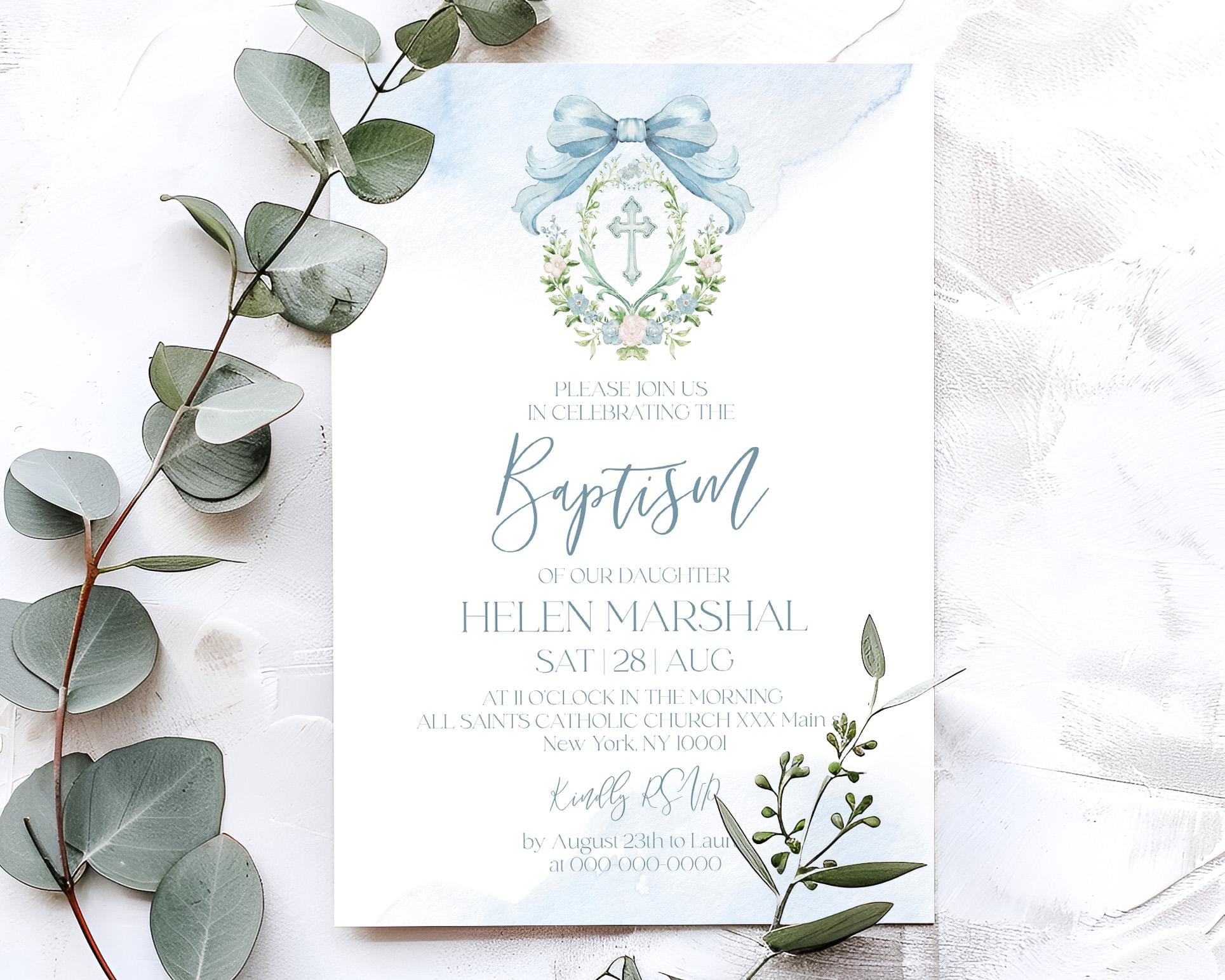 Christening Invitation Printable | 3 Sizes | Blue Watercolor Floral Crest
