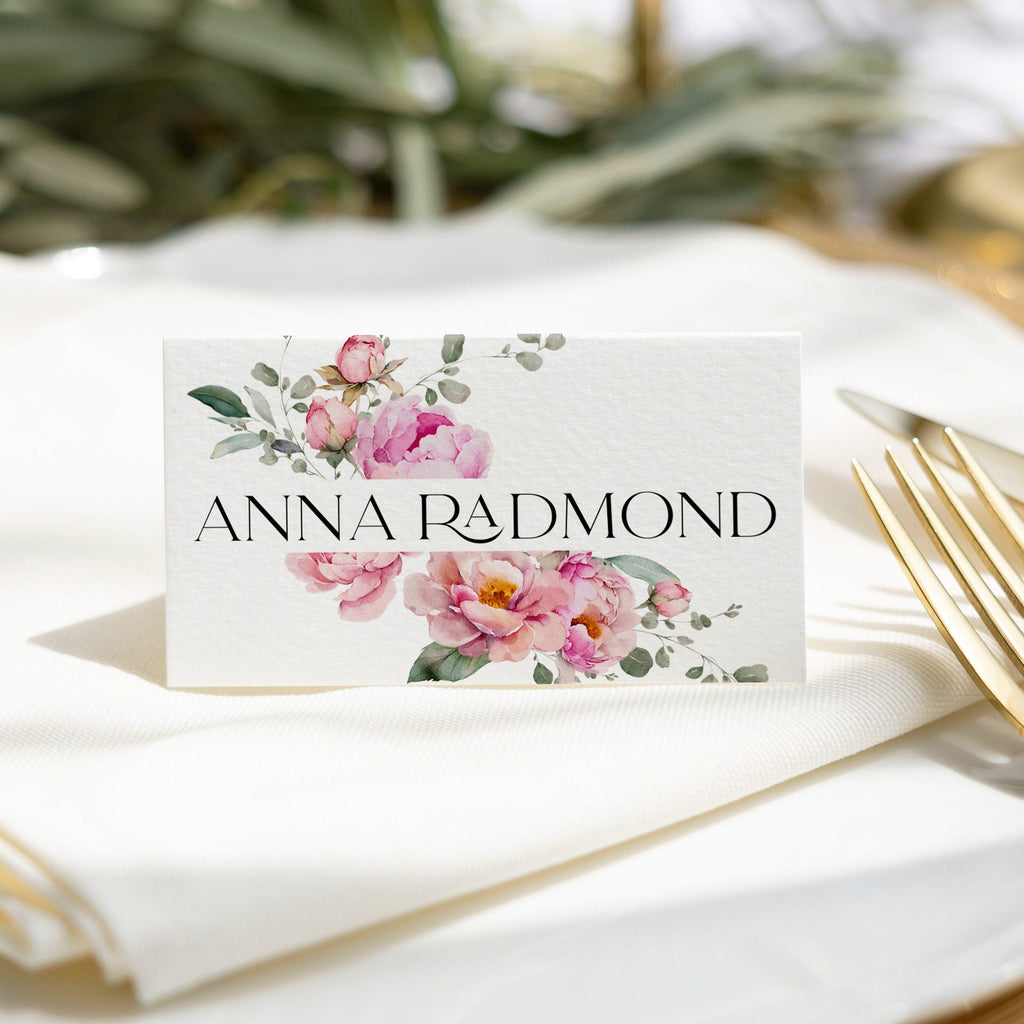 Blush Peony Wedding Name Card, EDITABLE Templates