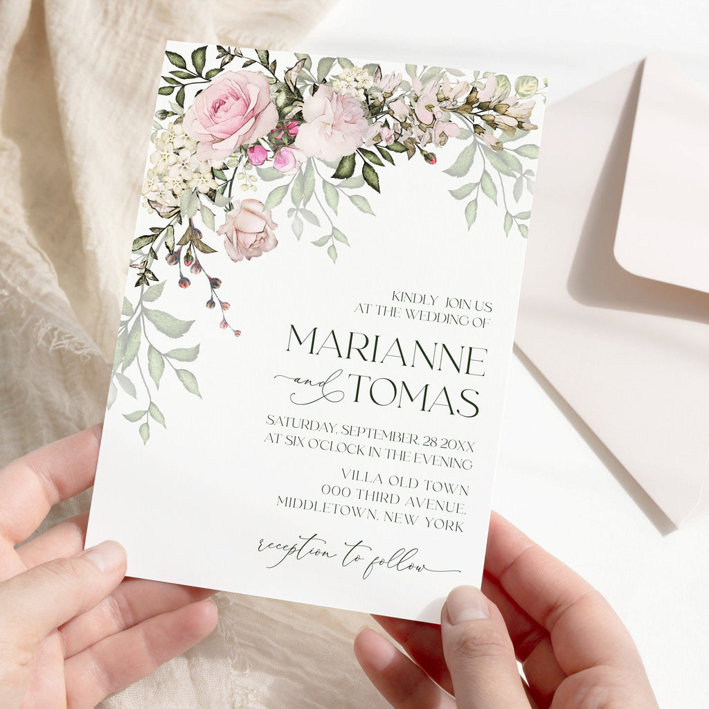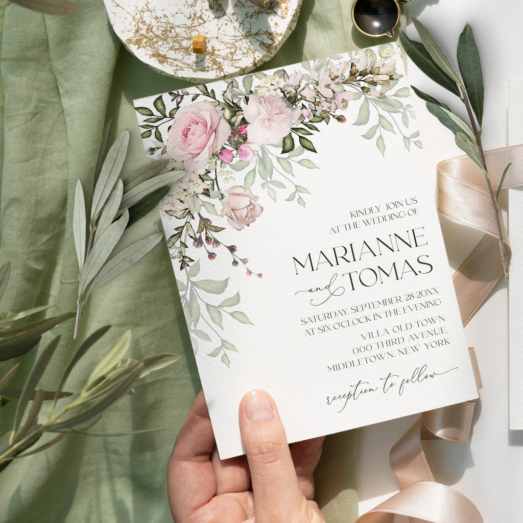Blush Pink Flowers Printable Wedding Invite, EDITABLE Templates