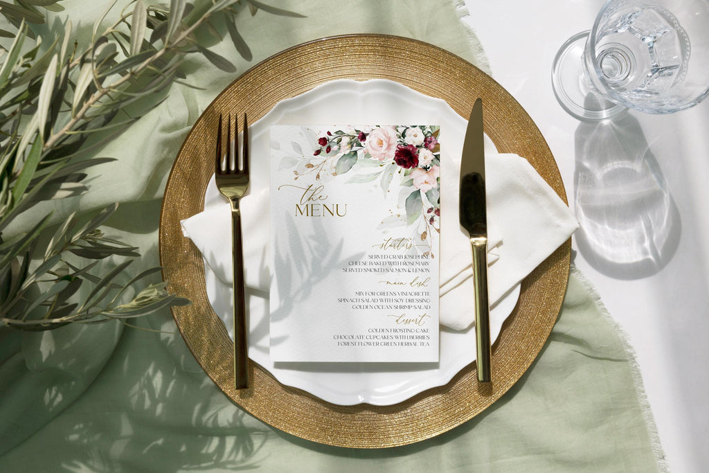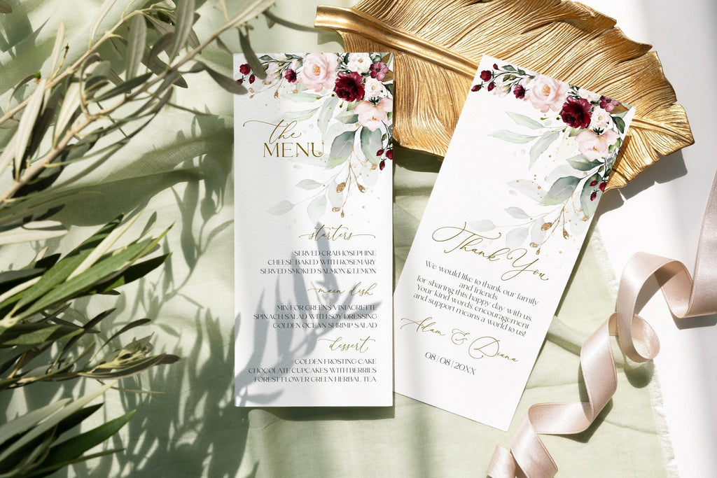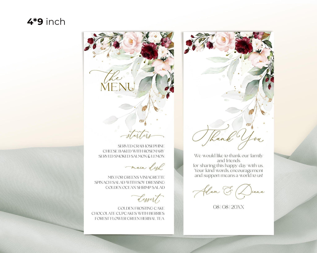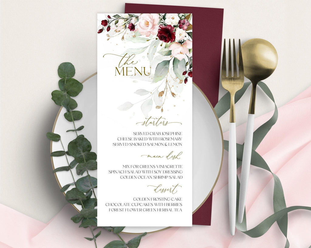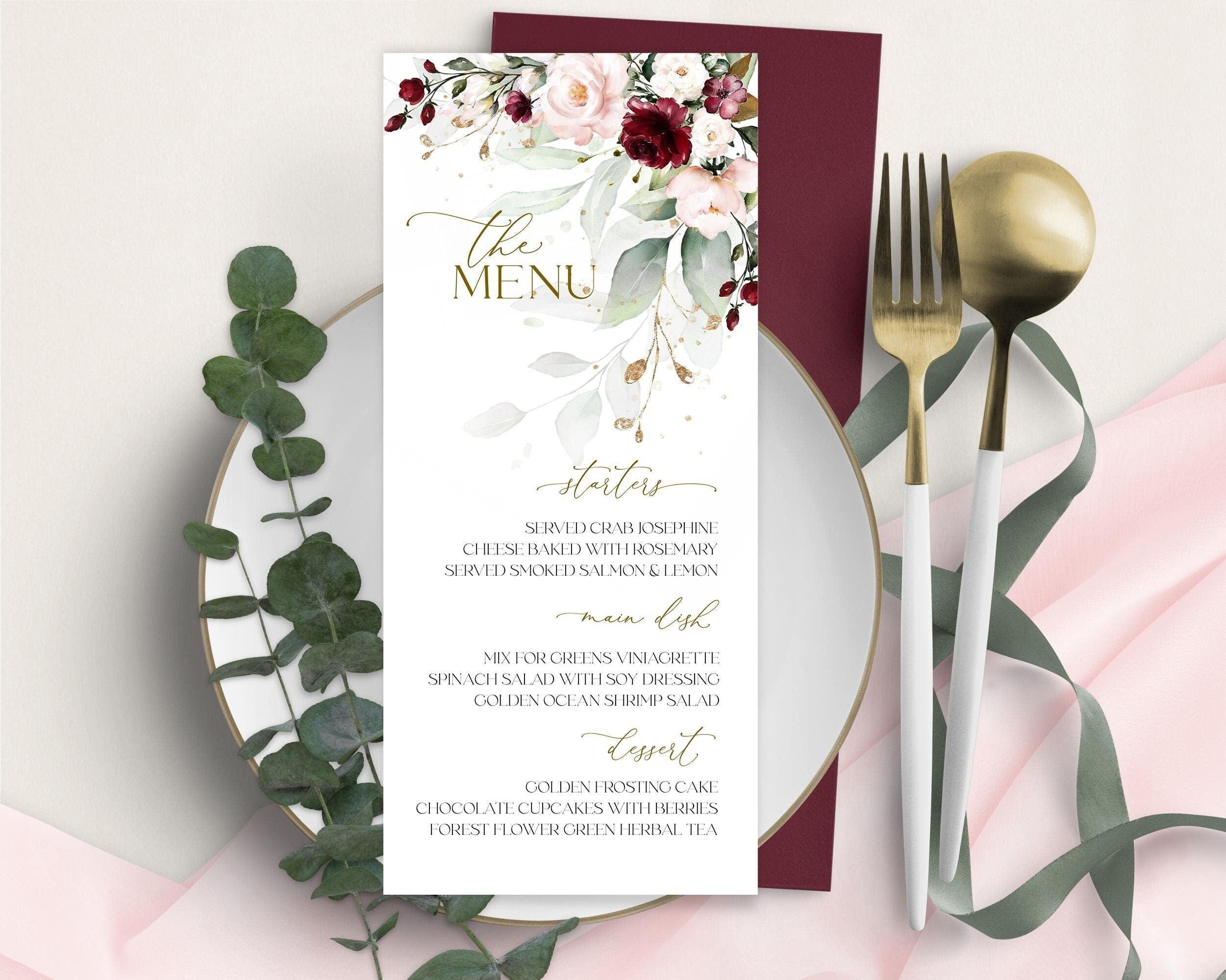 Burgundy & Blush Wedding Menu | 2 sizes | Elegant Floral Dinner Card