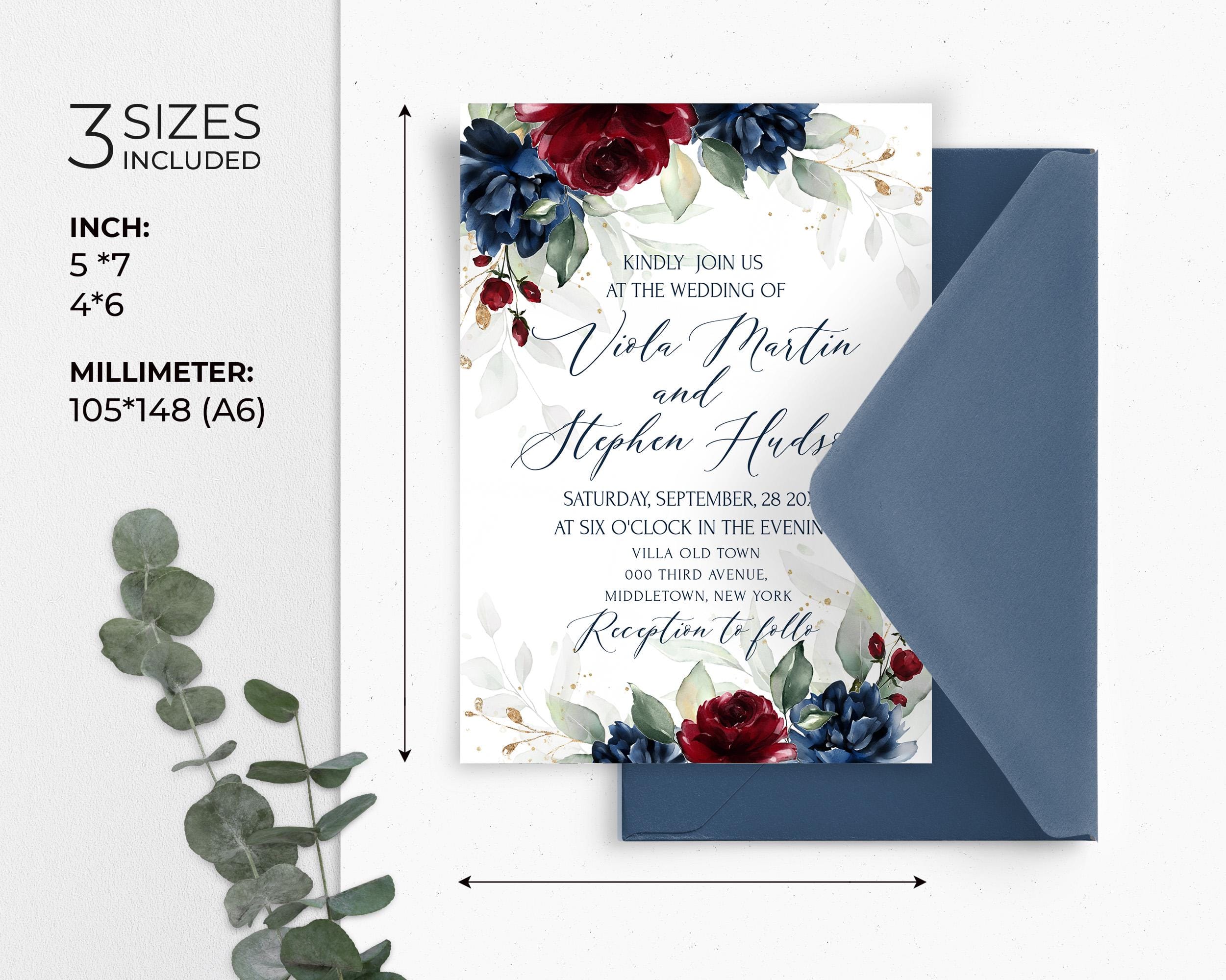 Burgundy & Navy Botanical Wedding Invitation | 3 Sizes | Personalized Templates