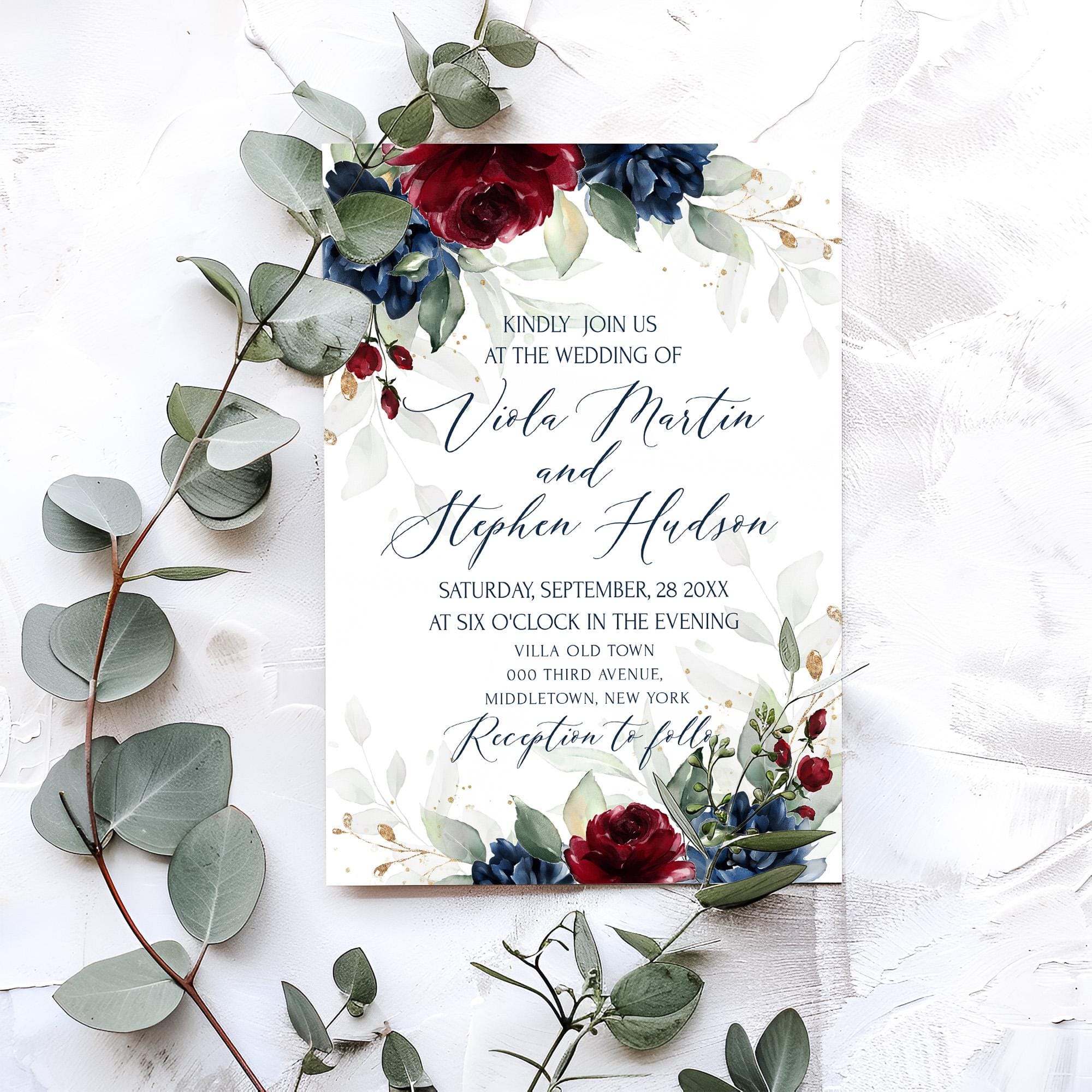 Burgundy & Navy Botanical Wedding Invitation, EDITABLE Templates