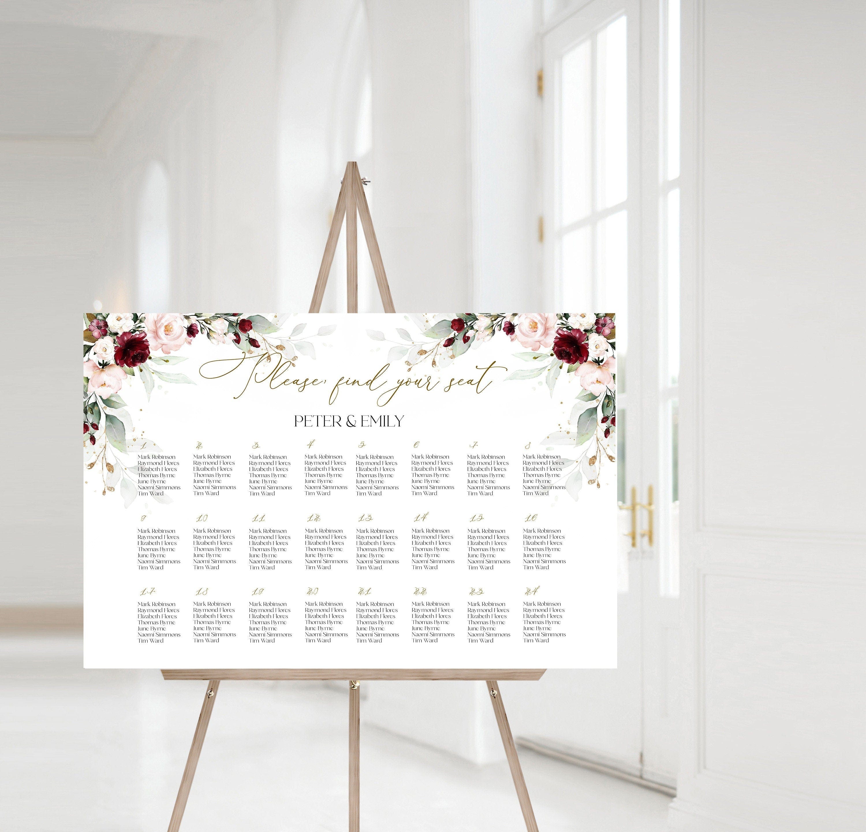 Burgundy Seating Chart Sign | 6 sizes | Printable Wedding Seating Poster