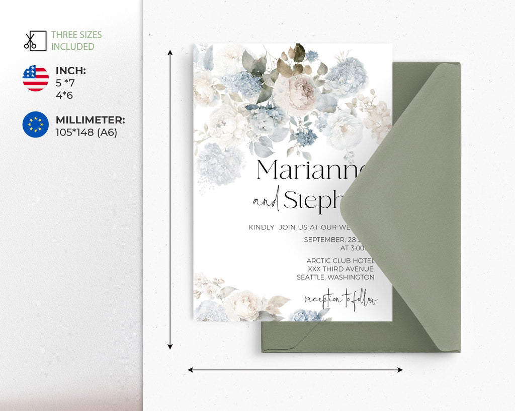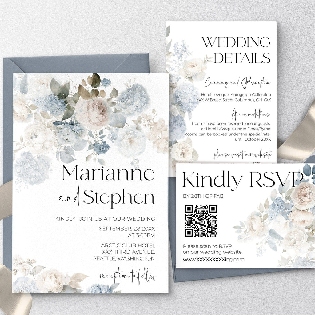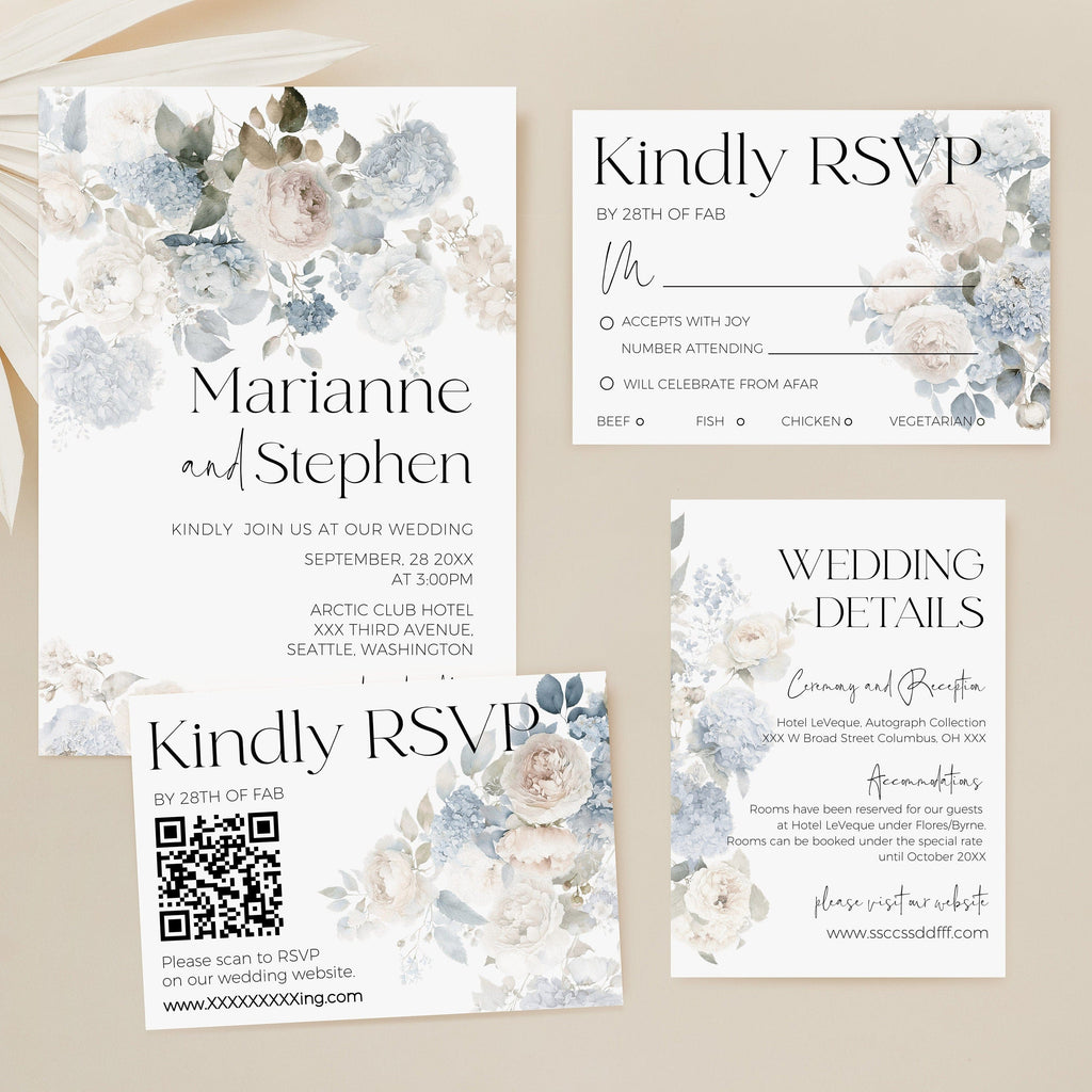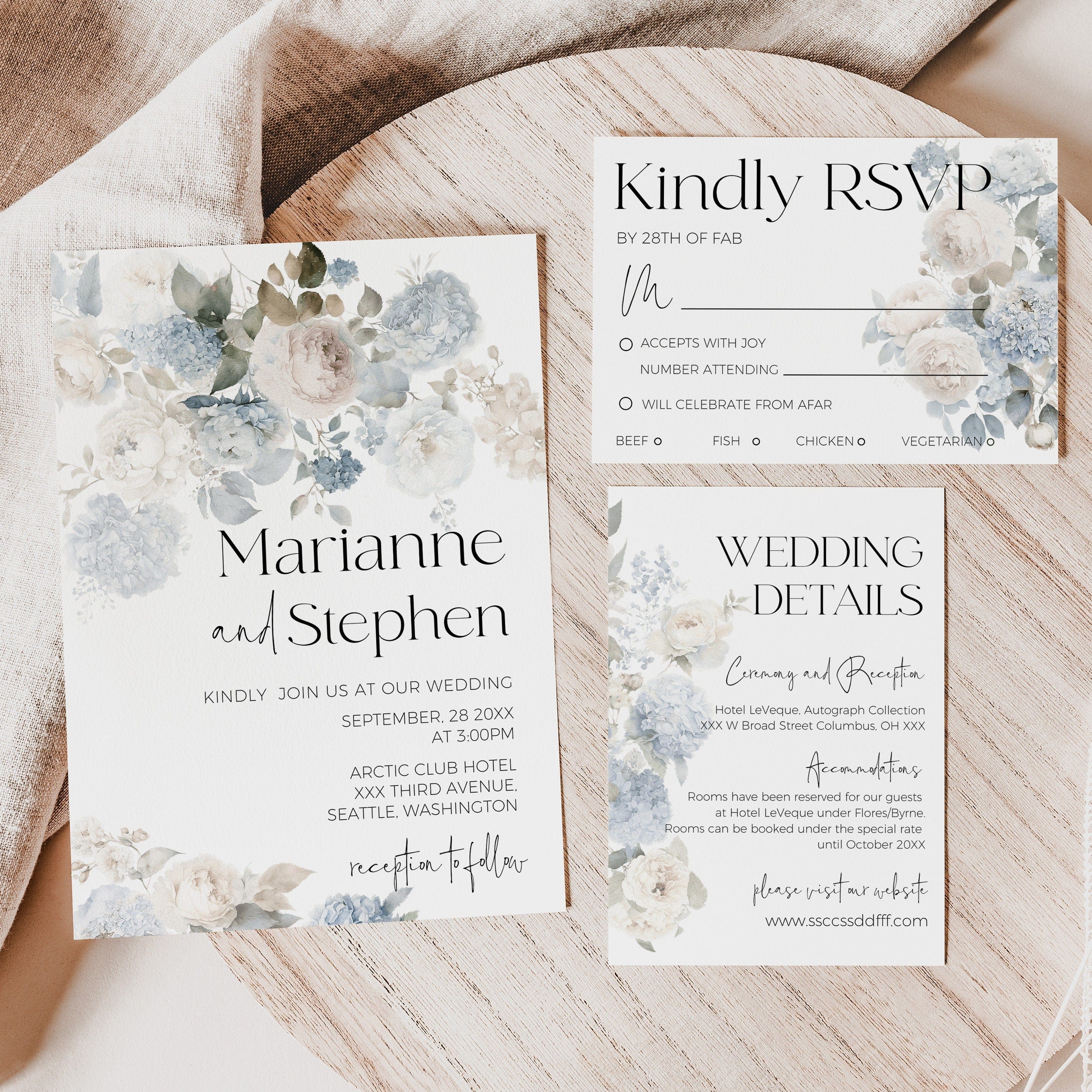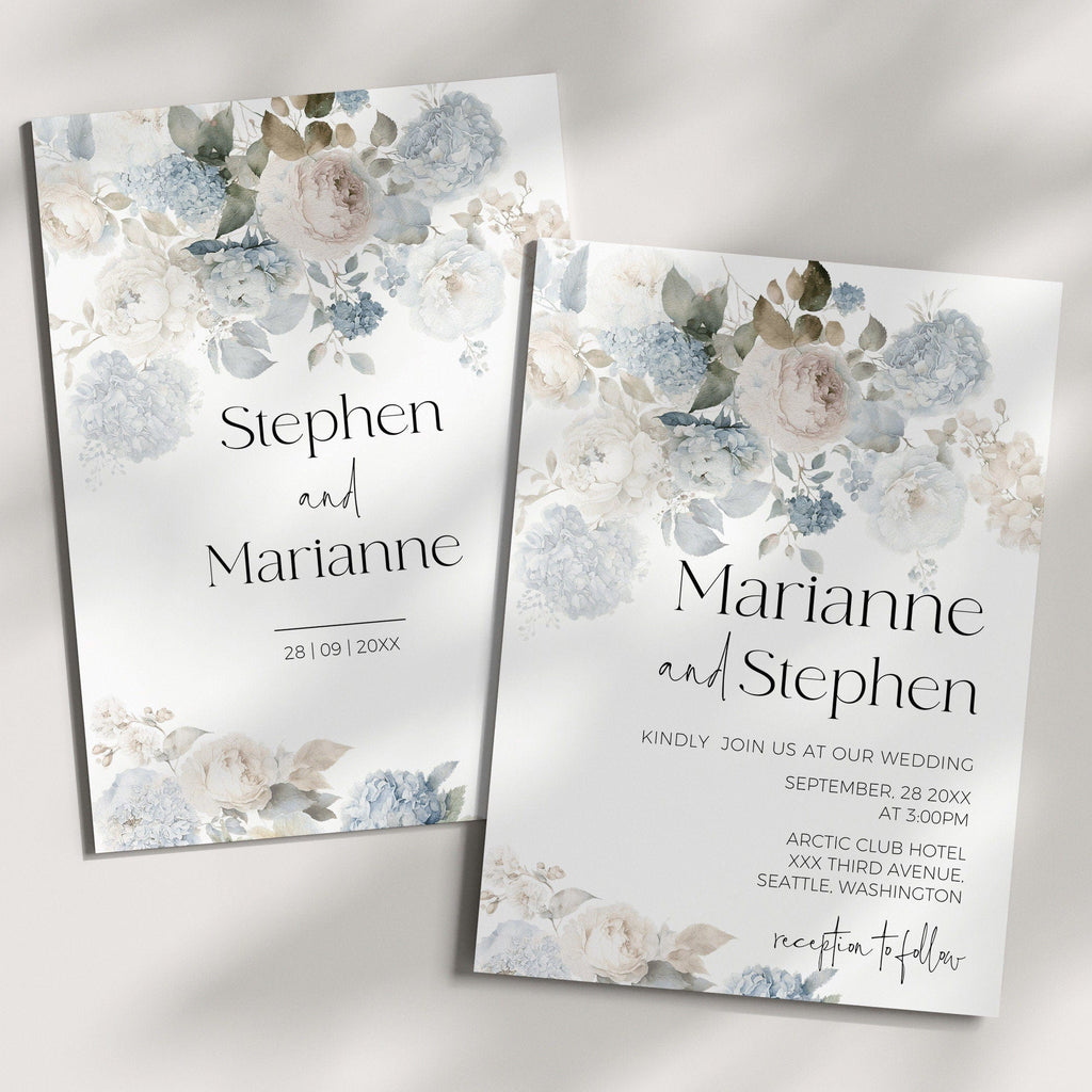 Soft Blue & Blush Wedding Invitation Suite, EDITABLE Templates