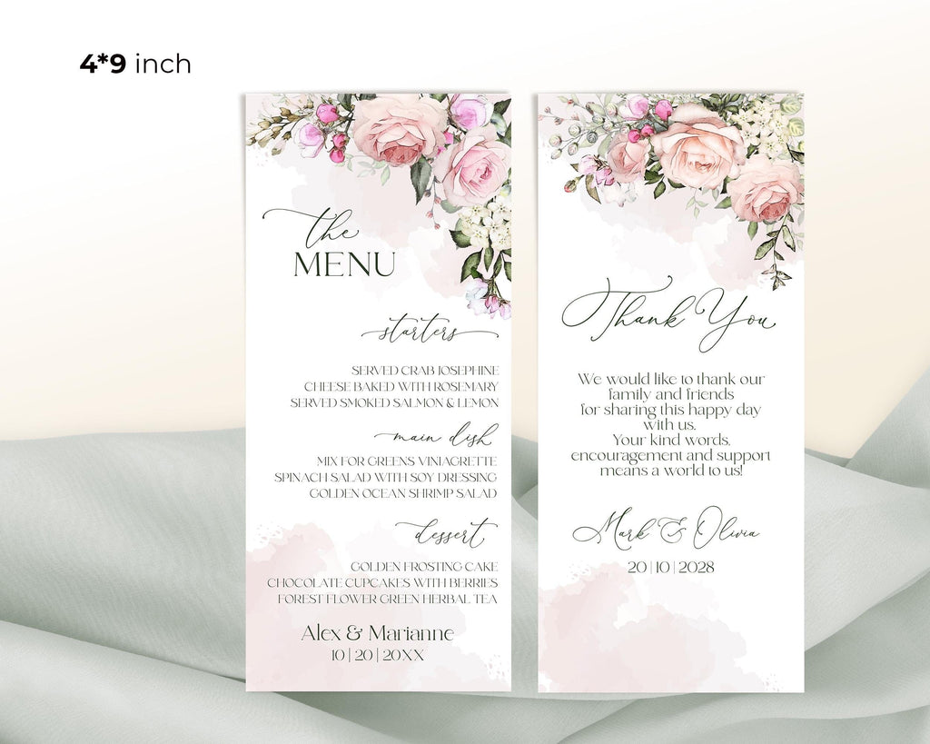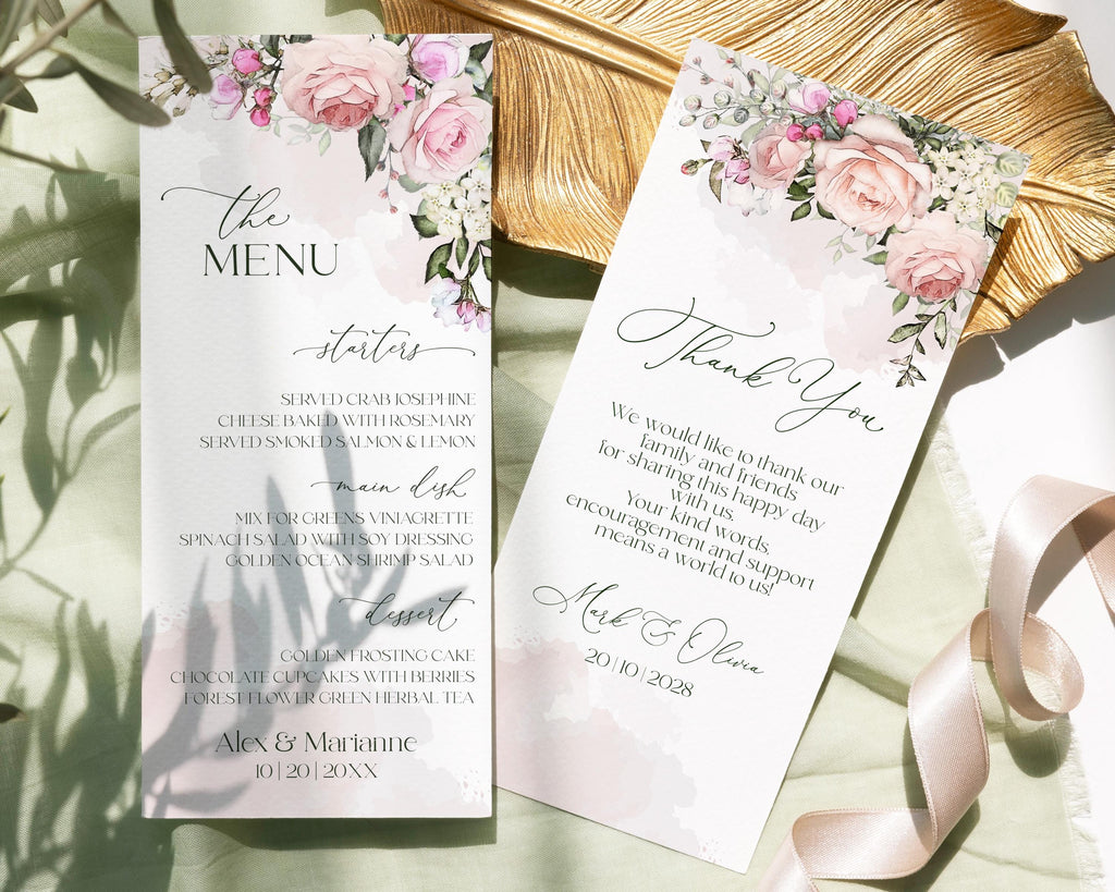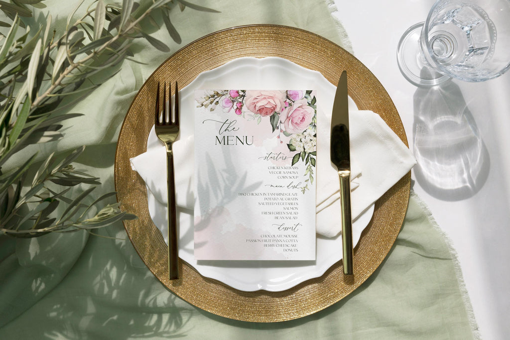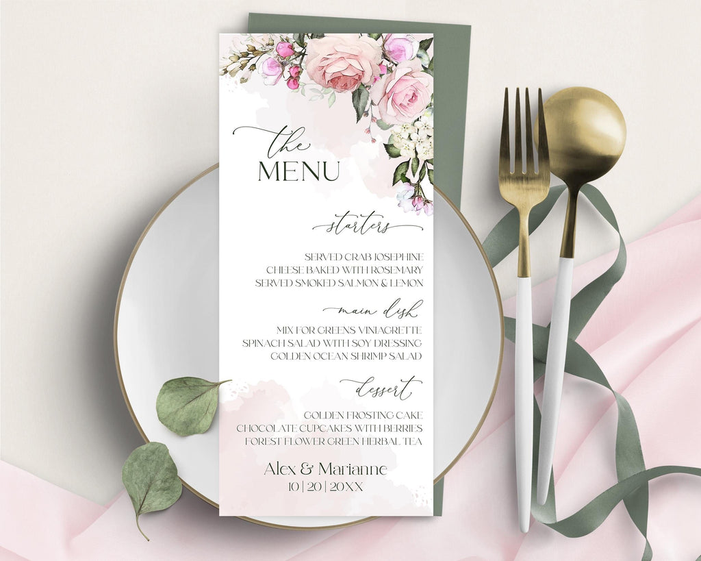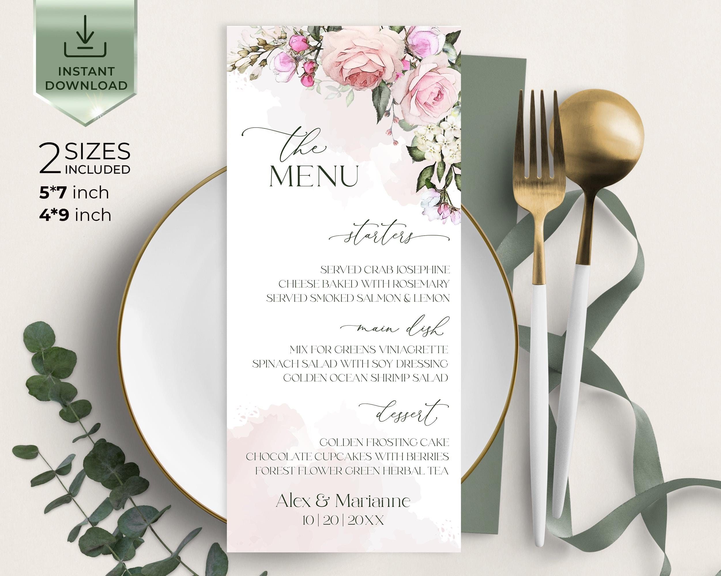 Garden Rose Dinner Menu | 2 Sizes | Floral Wedding Reception Idea