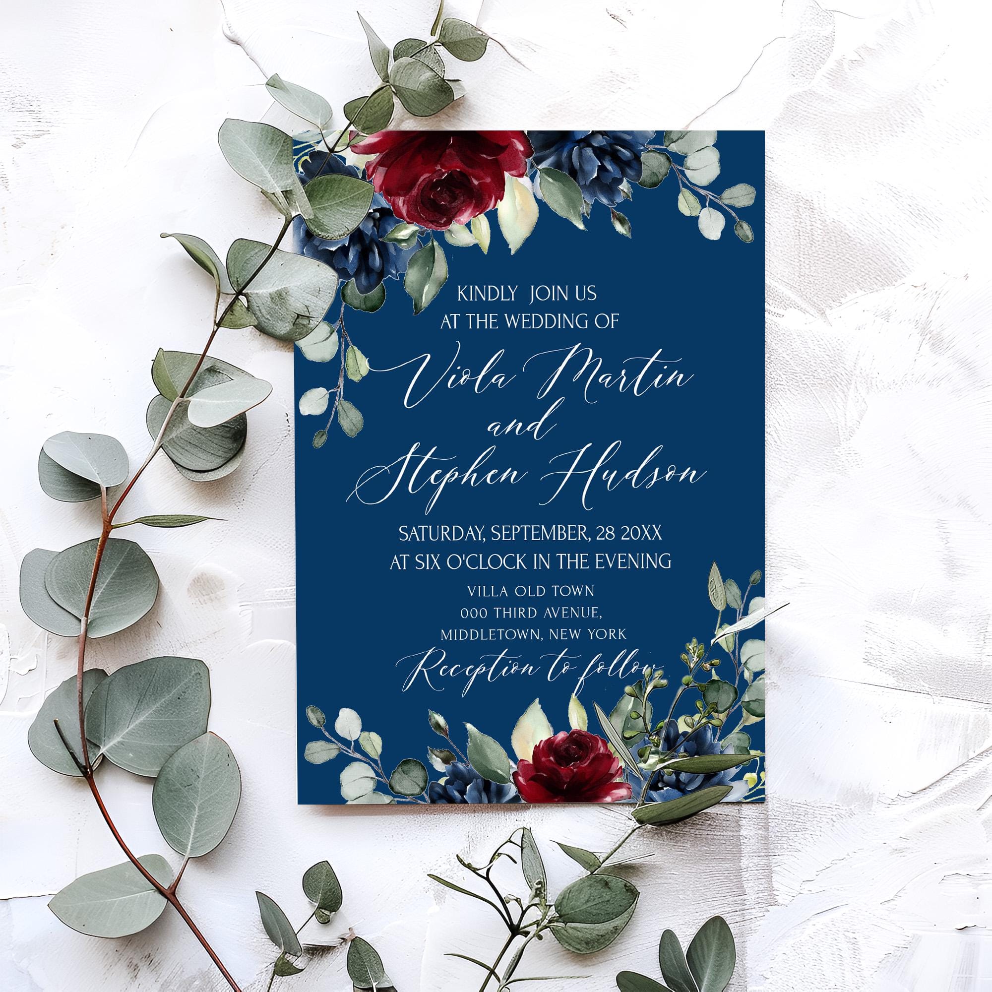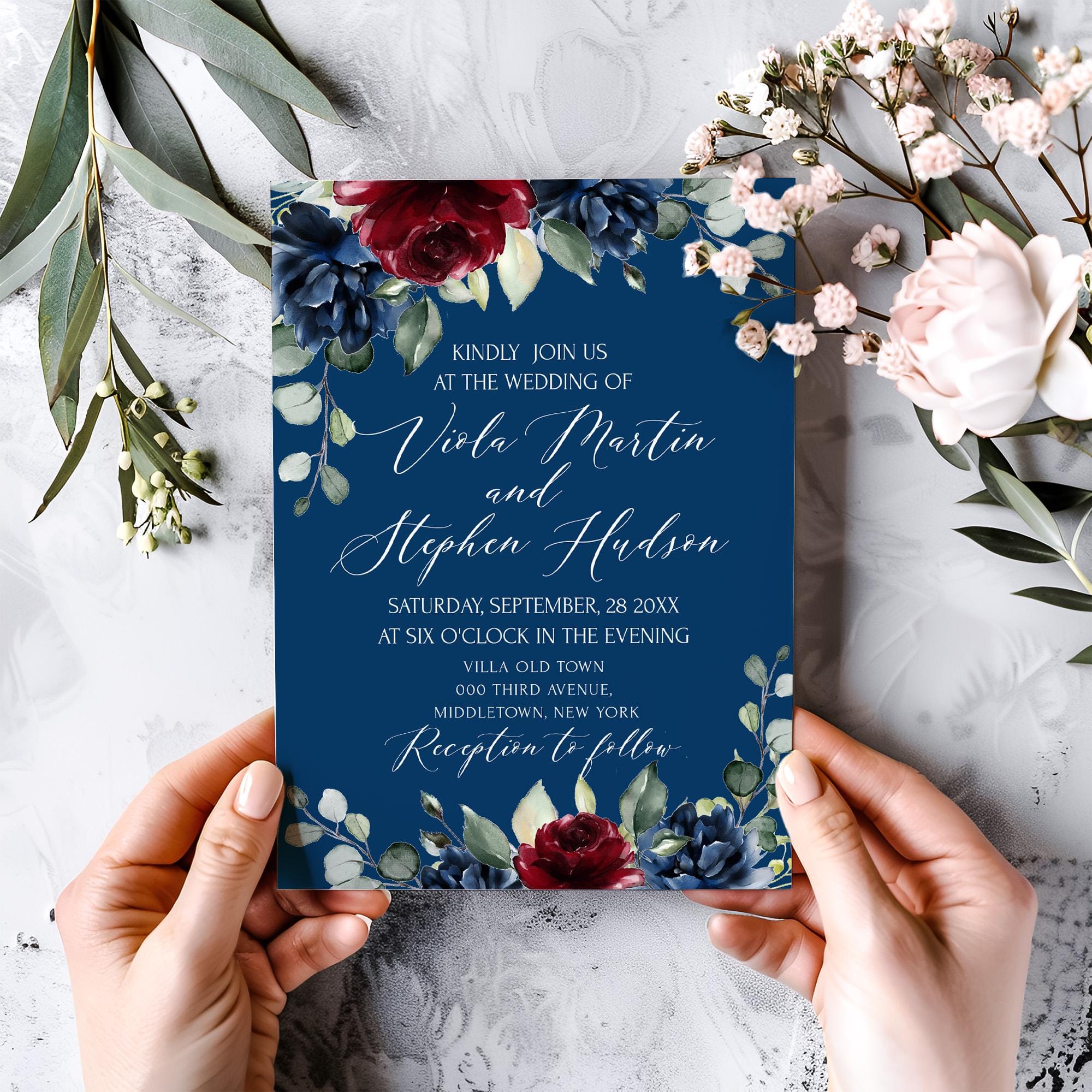 Romantic Burgundy & Navy Floral Invitation, EDITABLE Templates
