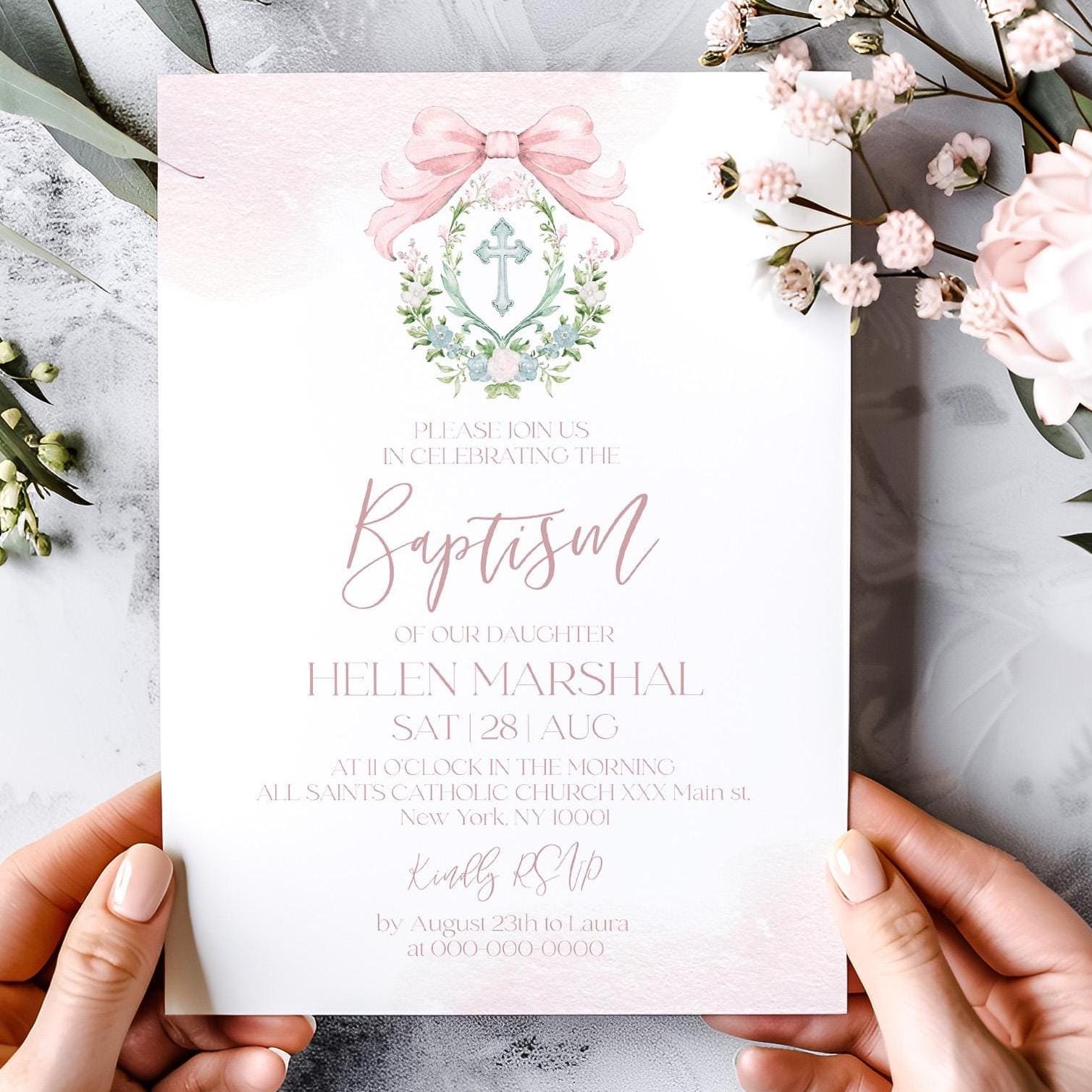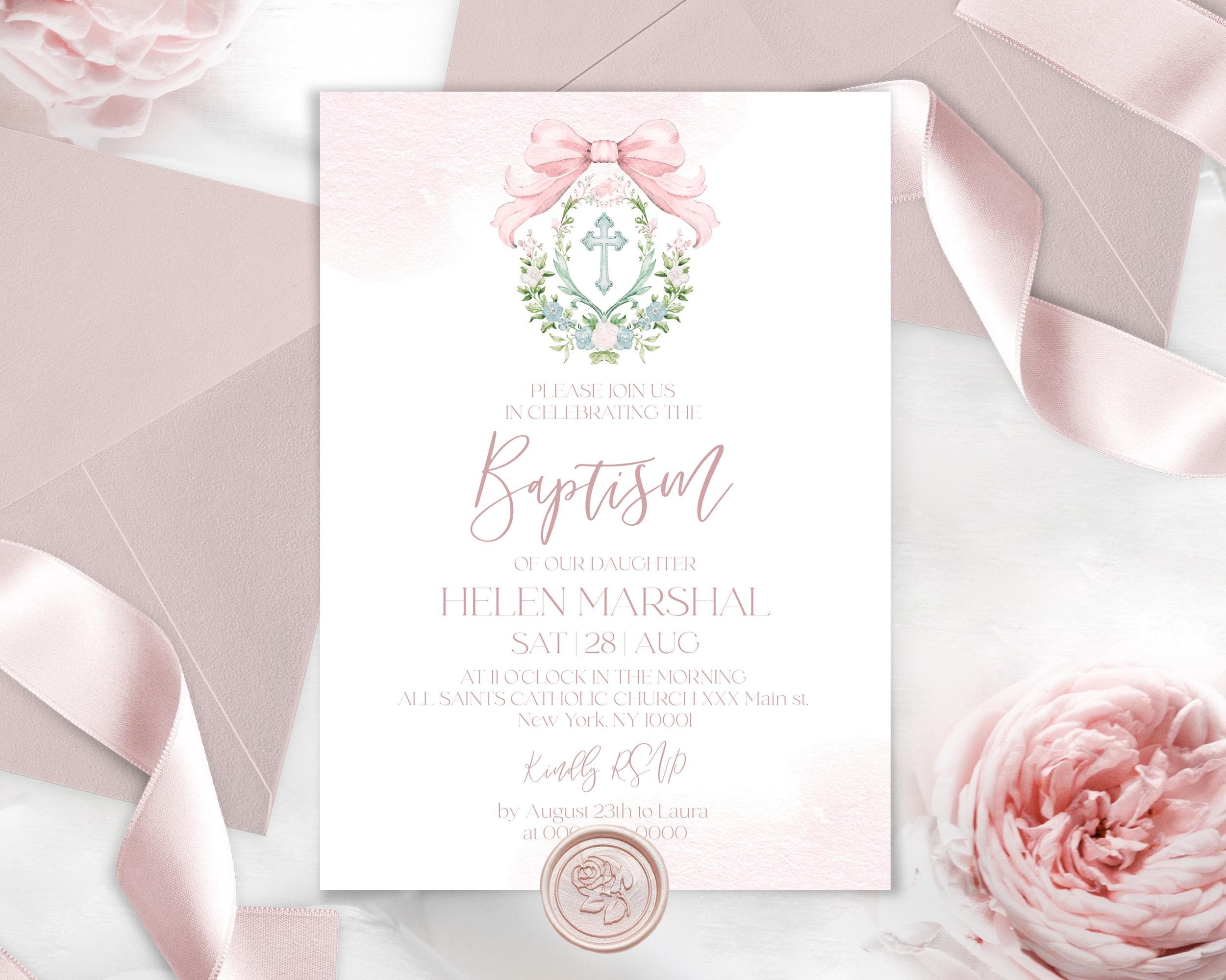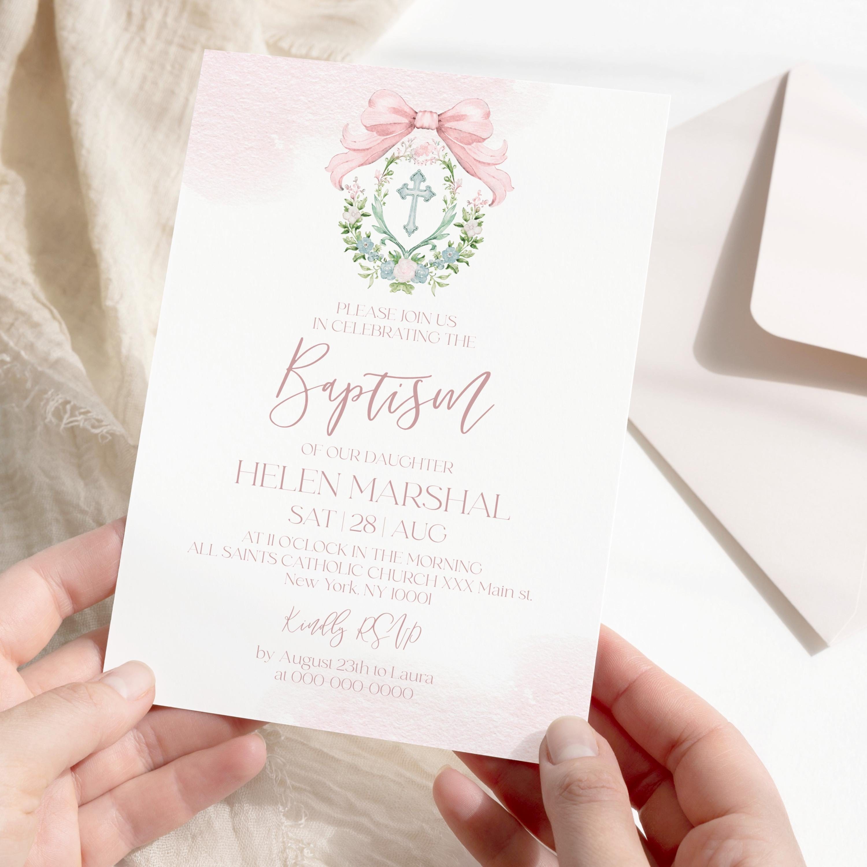 Girl Baptism Invitation Printable | 3 Sizes | Pink Watercolor Floral Crest
