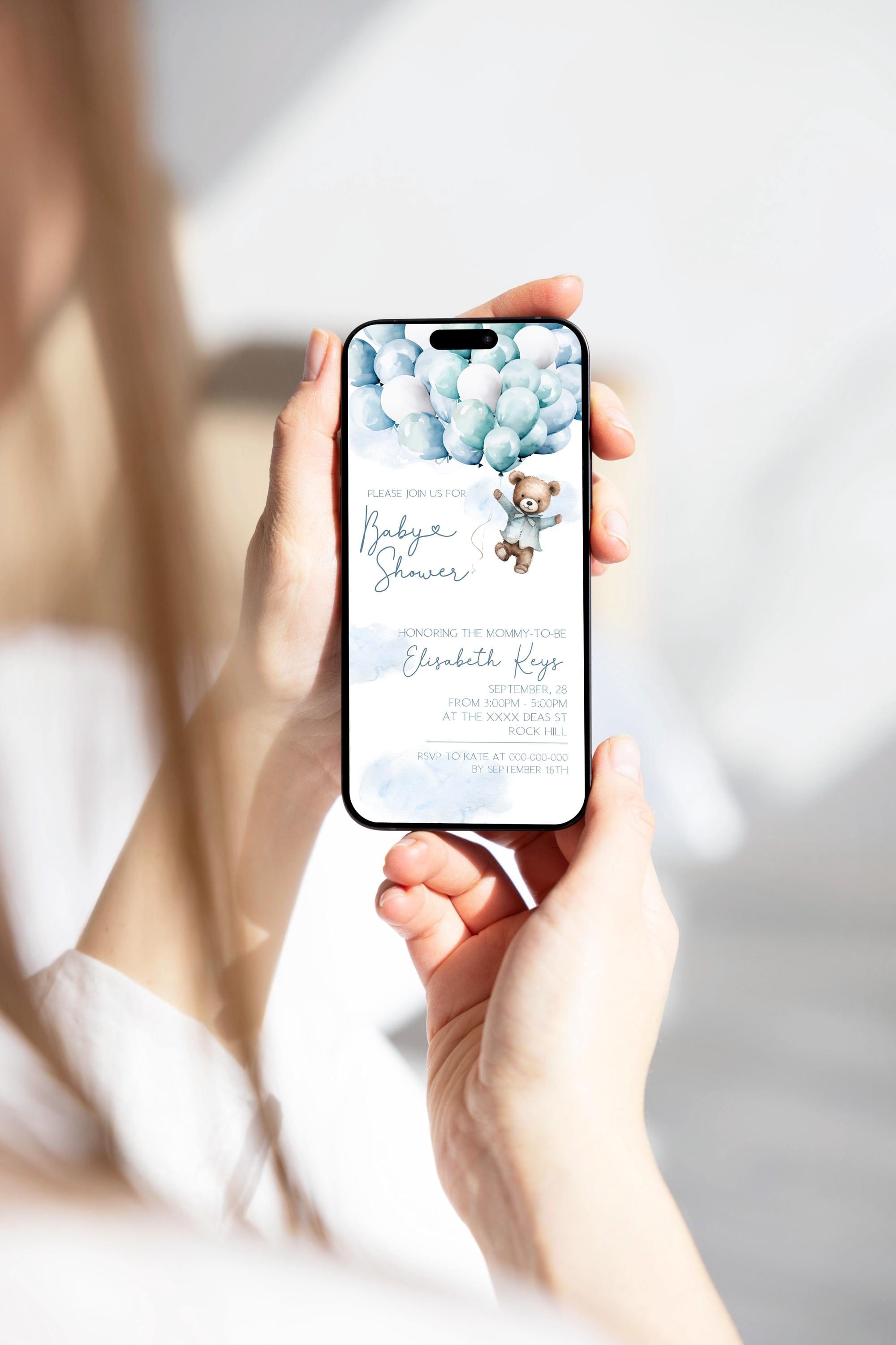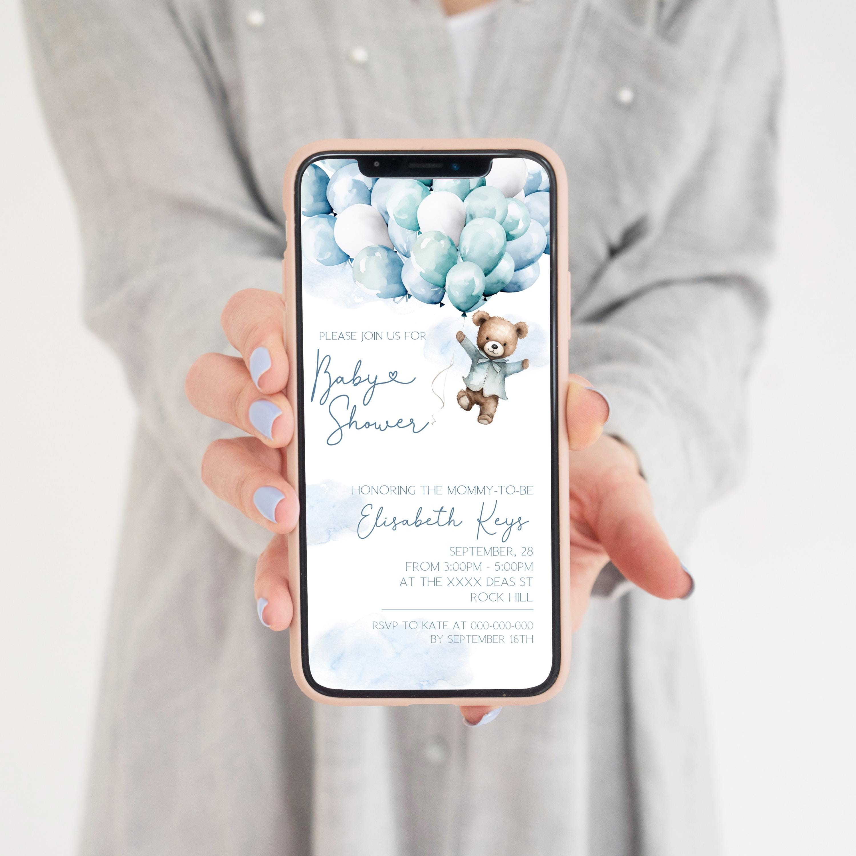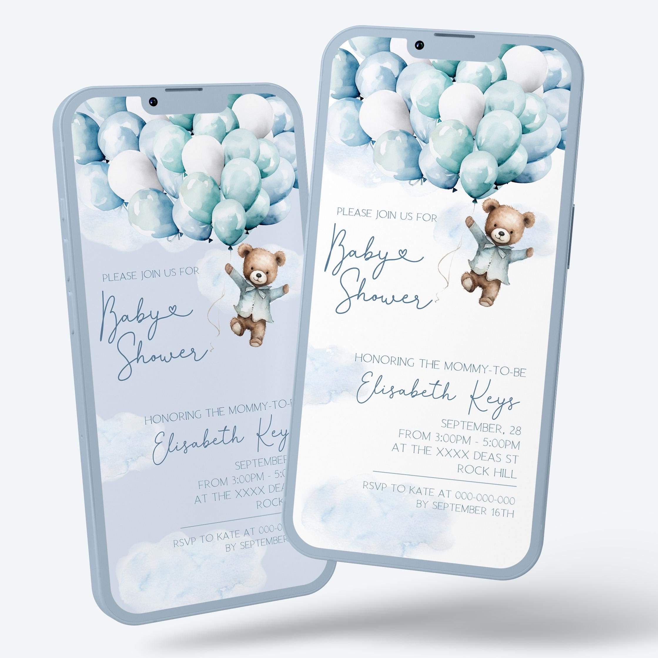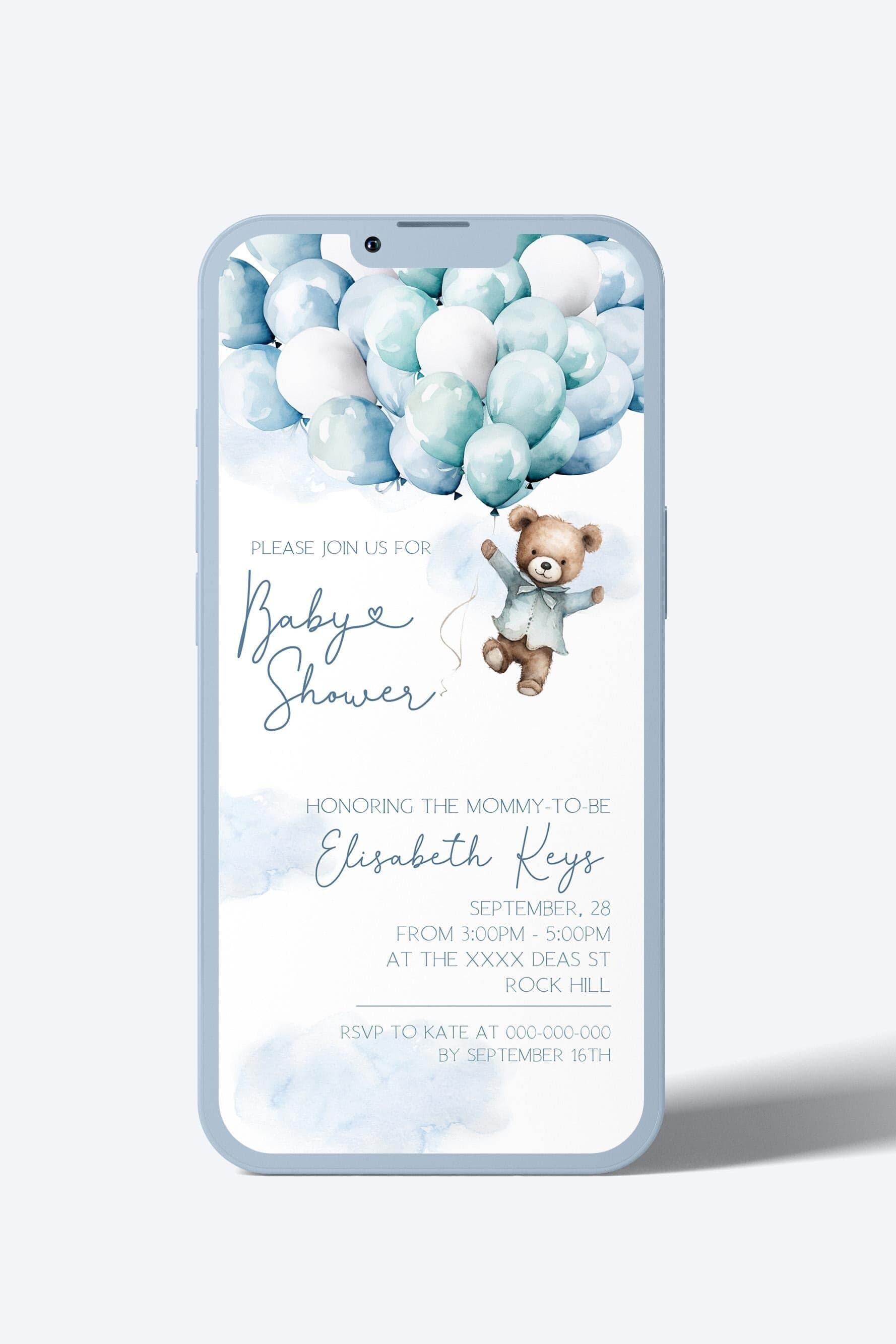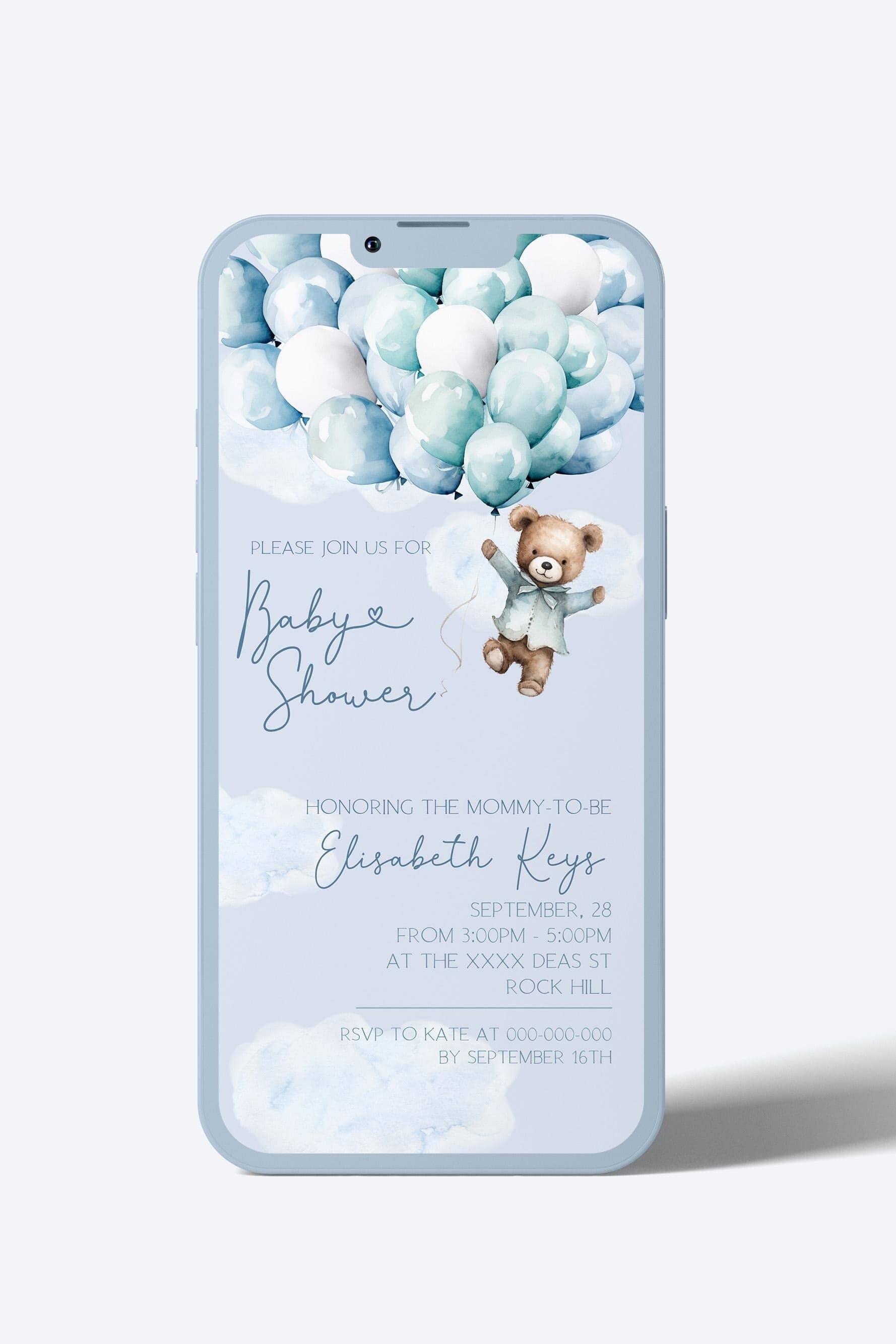 Blue Balloon Teddy Bear Baby Shower Evite for Boy Mobile Invite