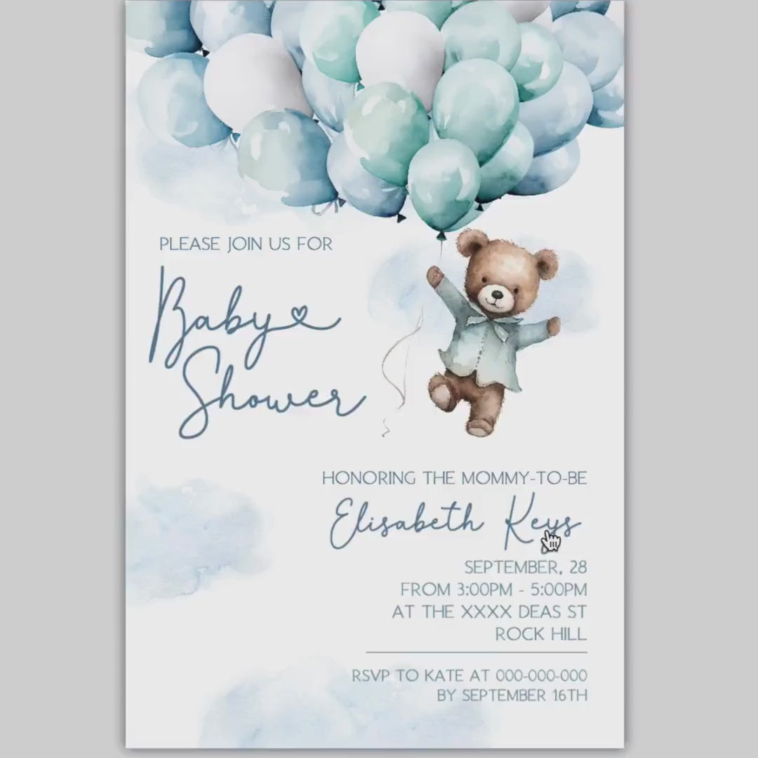 Blue Balloon Teddy Bear Baby Shower Evite, EDITABLE Templates