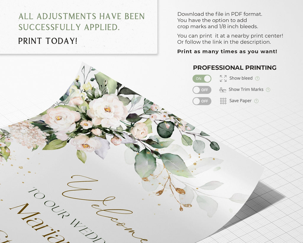 White Floral Wedding Welcome Sign, EDITABLE Templates