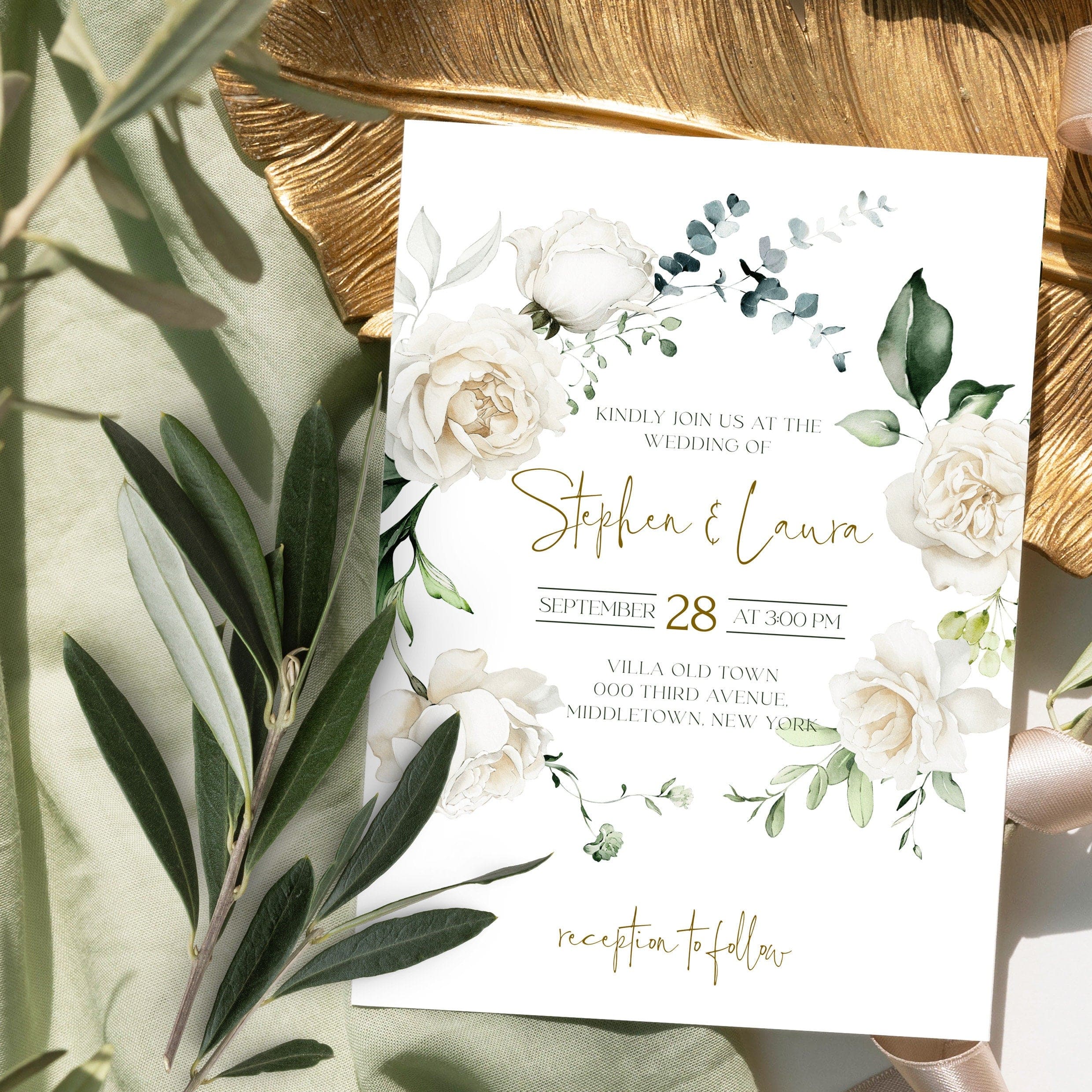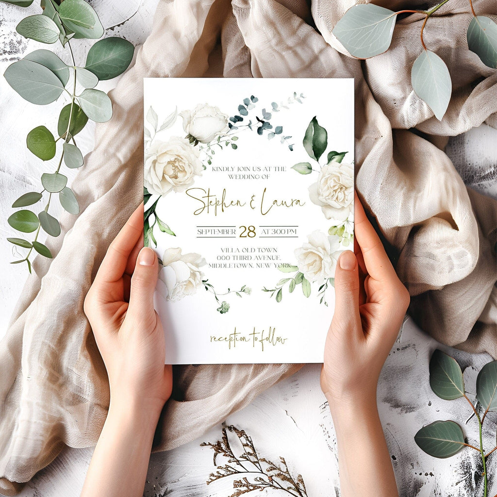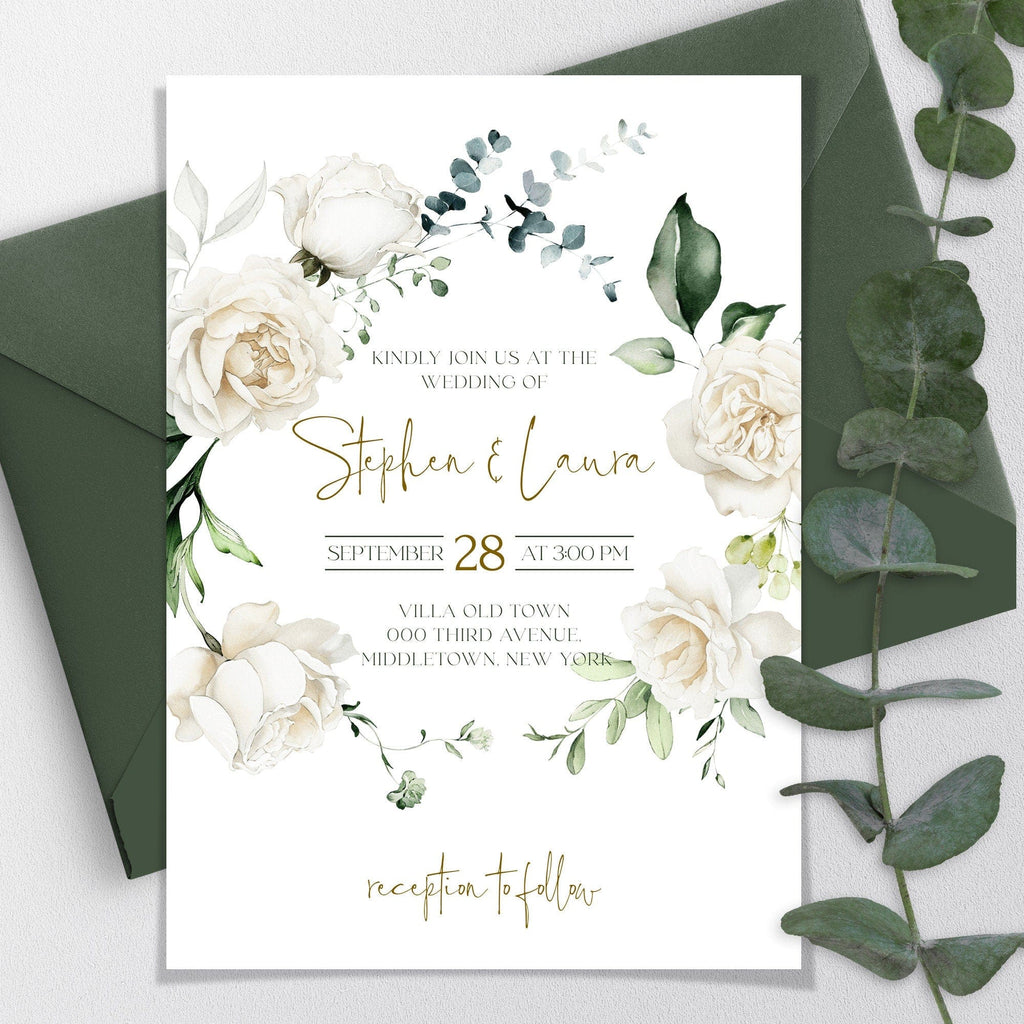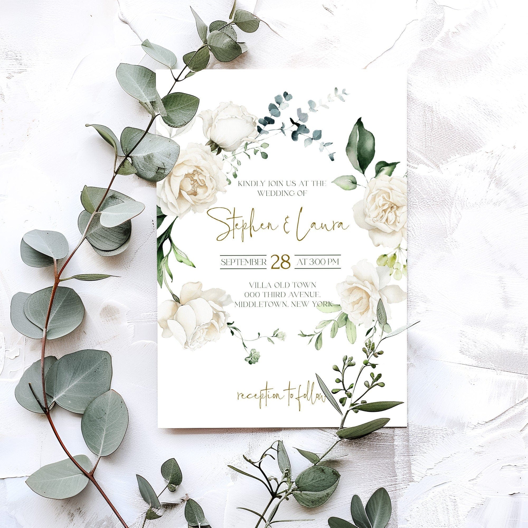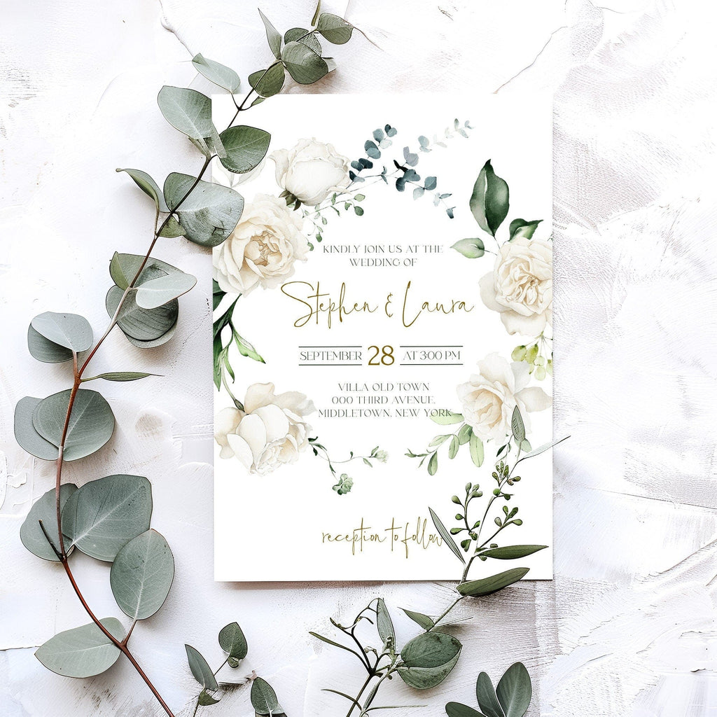 White Rose and Eucalyptus Wedding Invitation, EDITABLE Templates