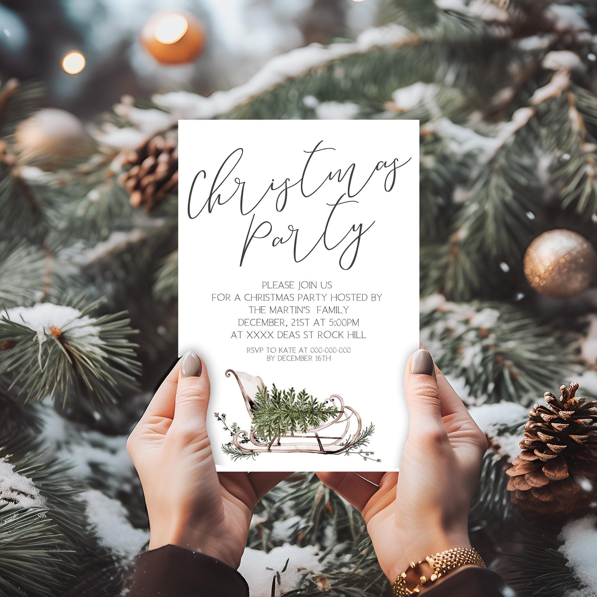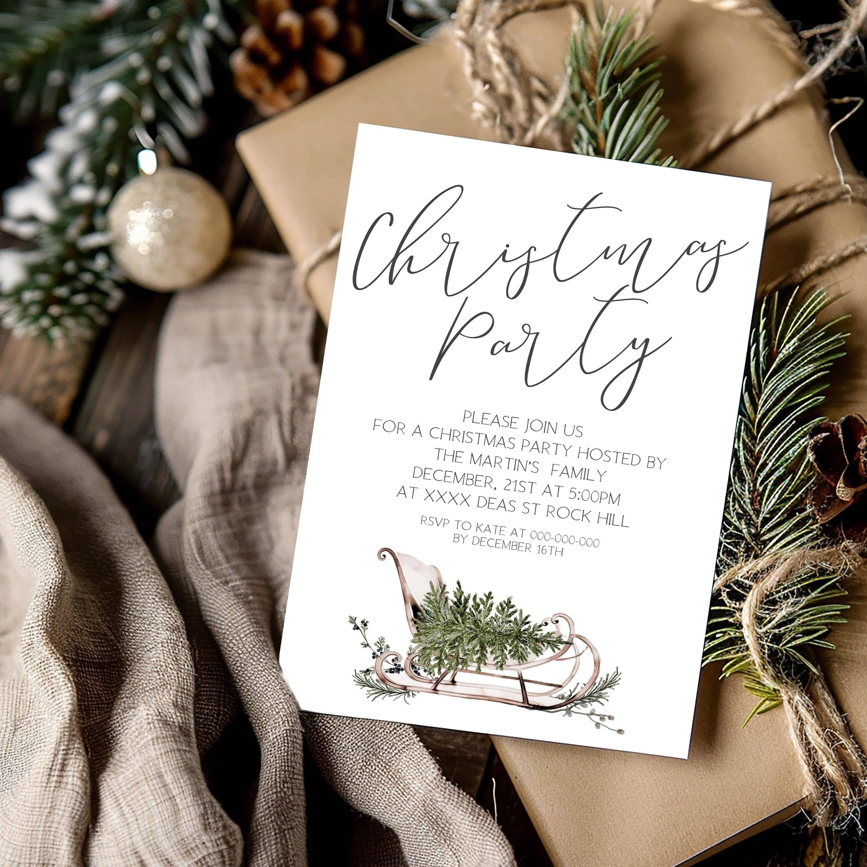 Winter Sleigh Christmas Party Card, EDITABLE Templates