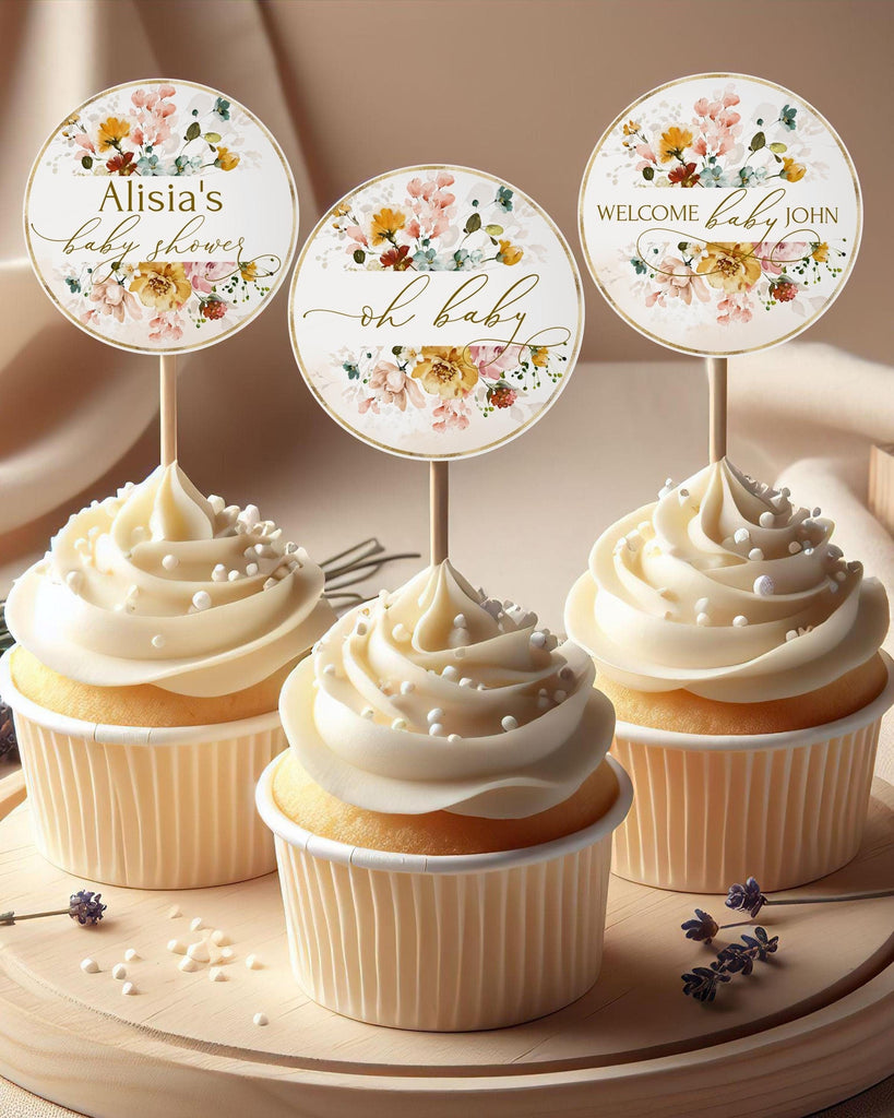 Fall Garden Baby Shower Cupcake Toppers | Yellow Floral Editable Tags