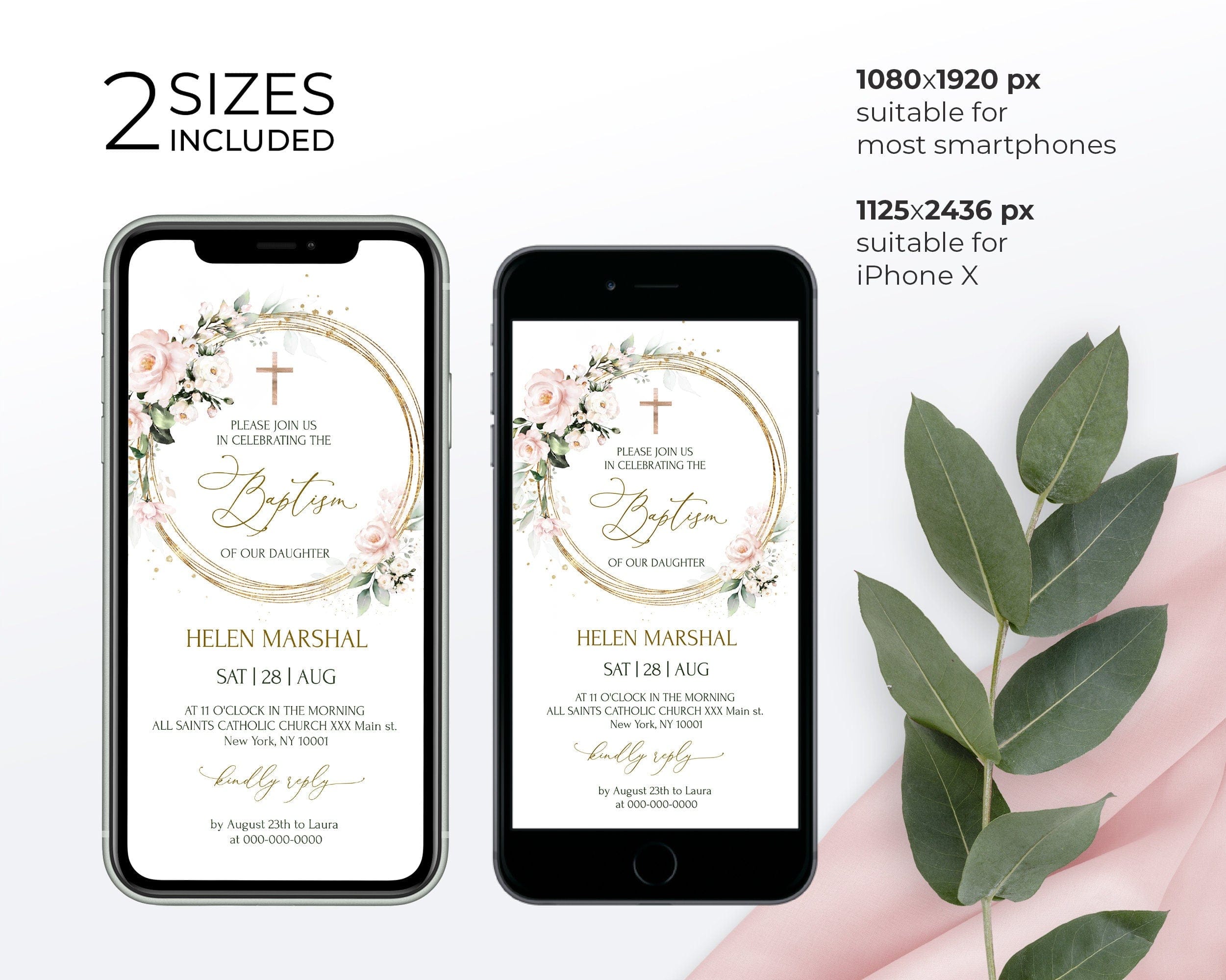 - Digital Invitations (Evites): 1080 x 1920, 1125 x 2436