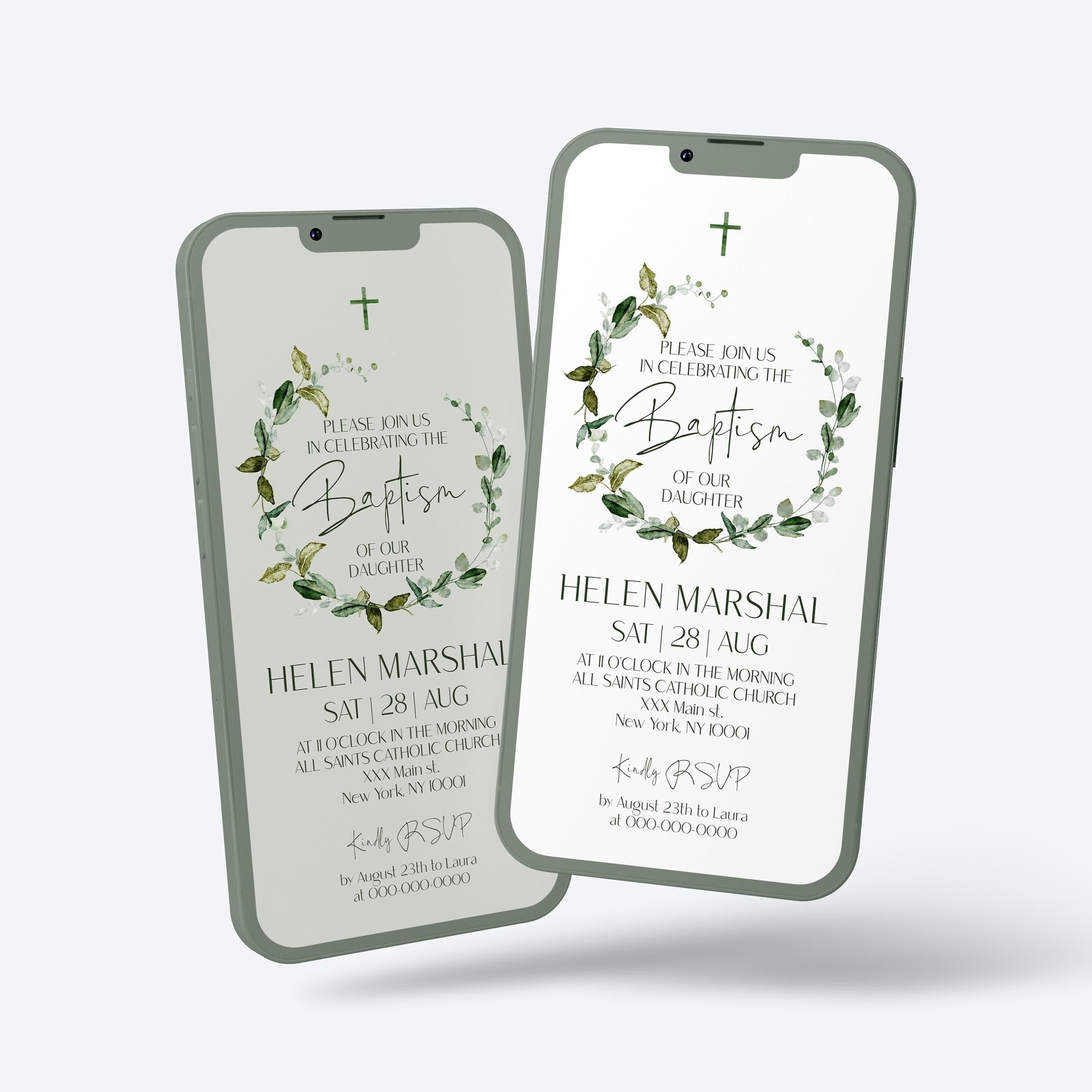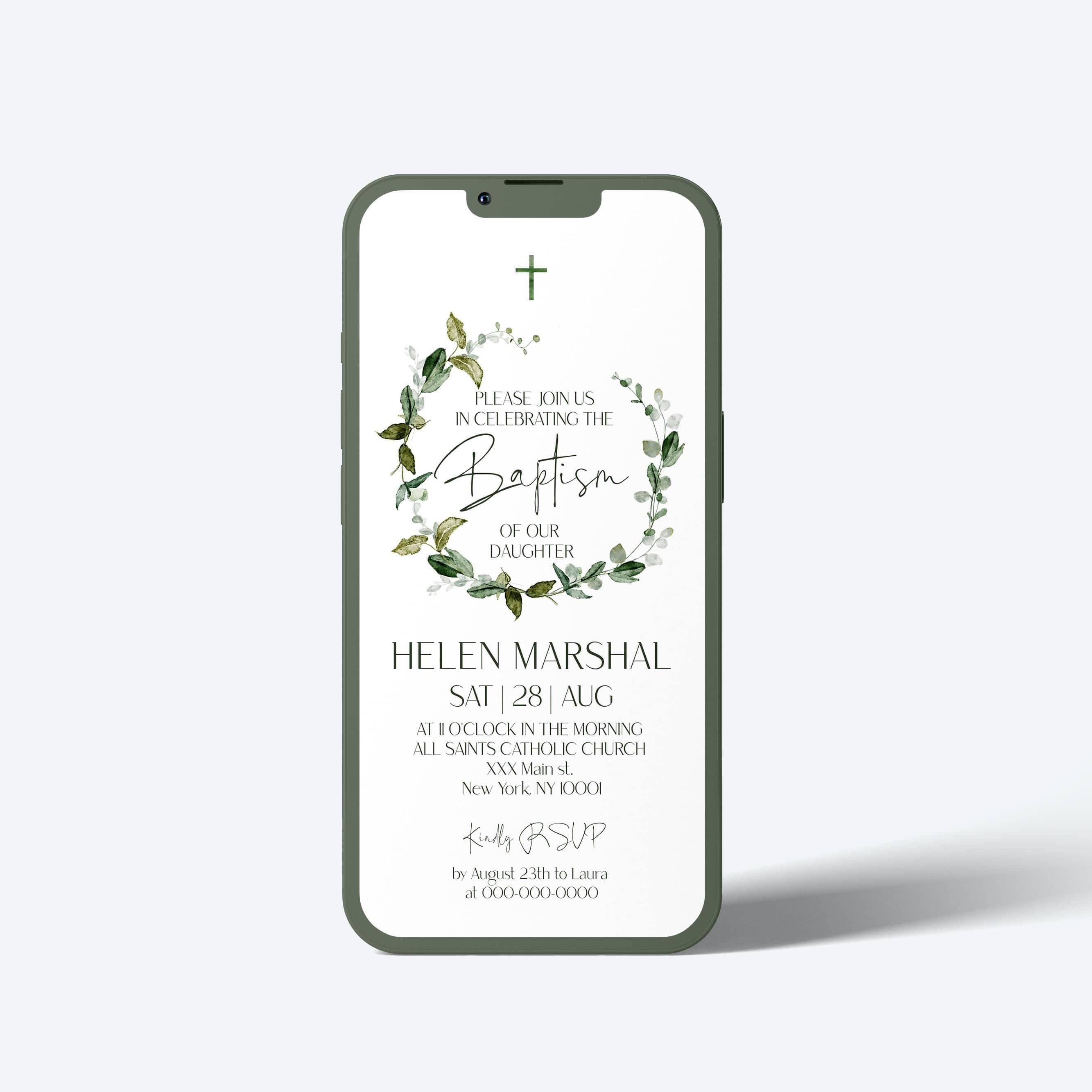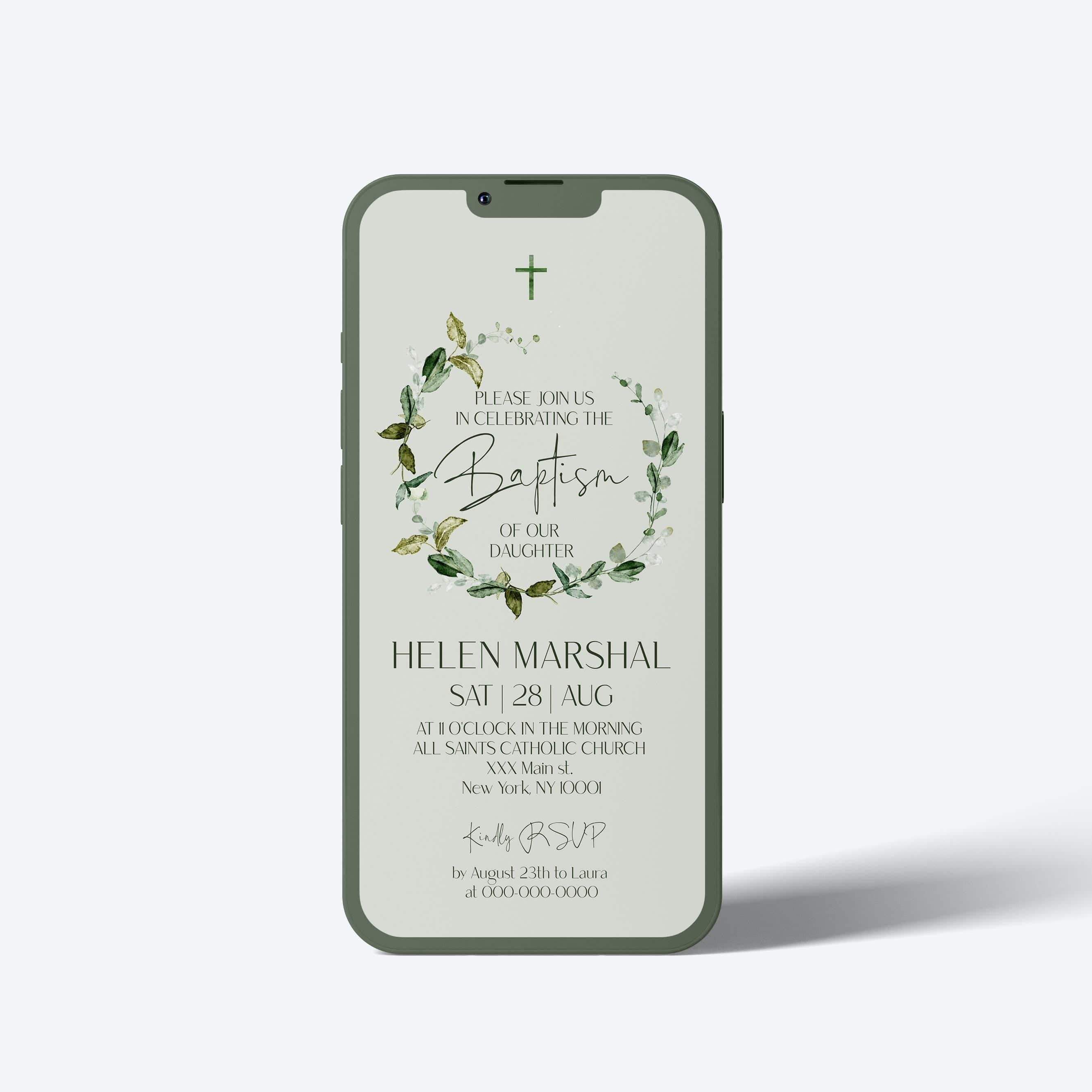 Green Leaves Baptism Electronic Invite | DIY Christening iPhone Evite
