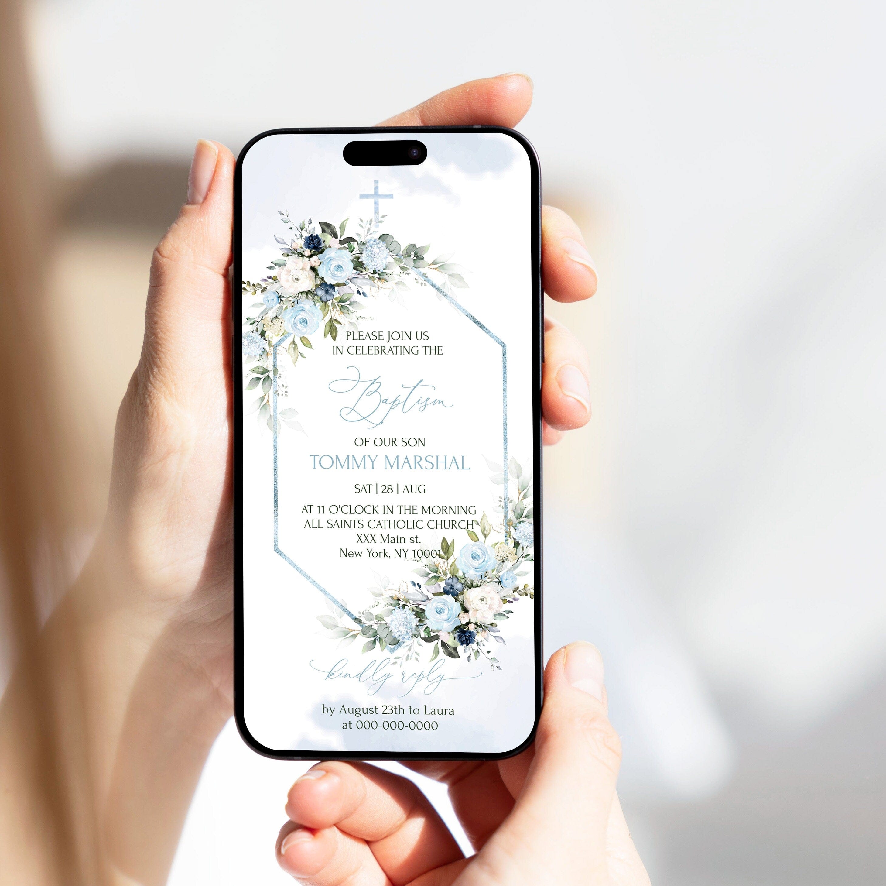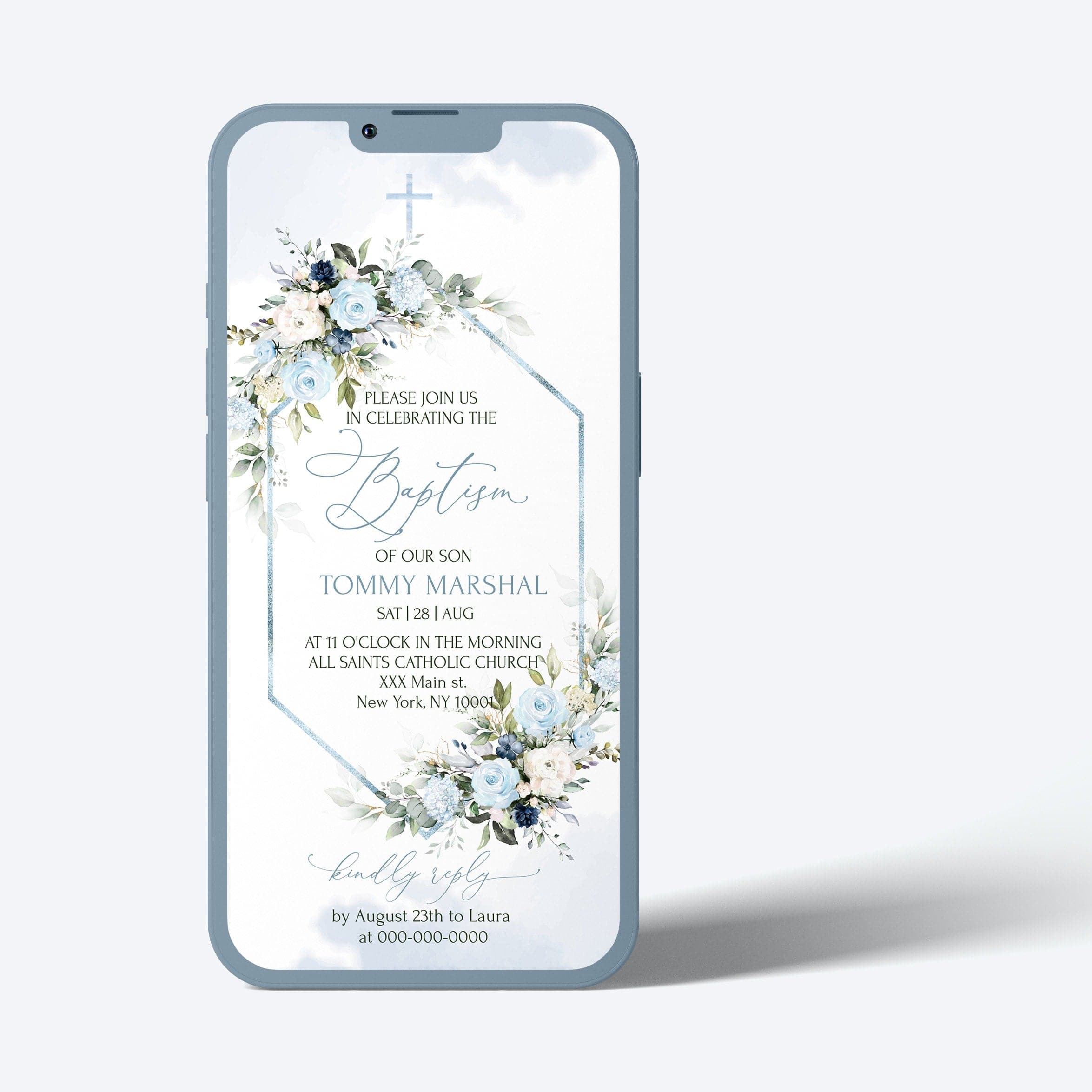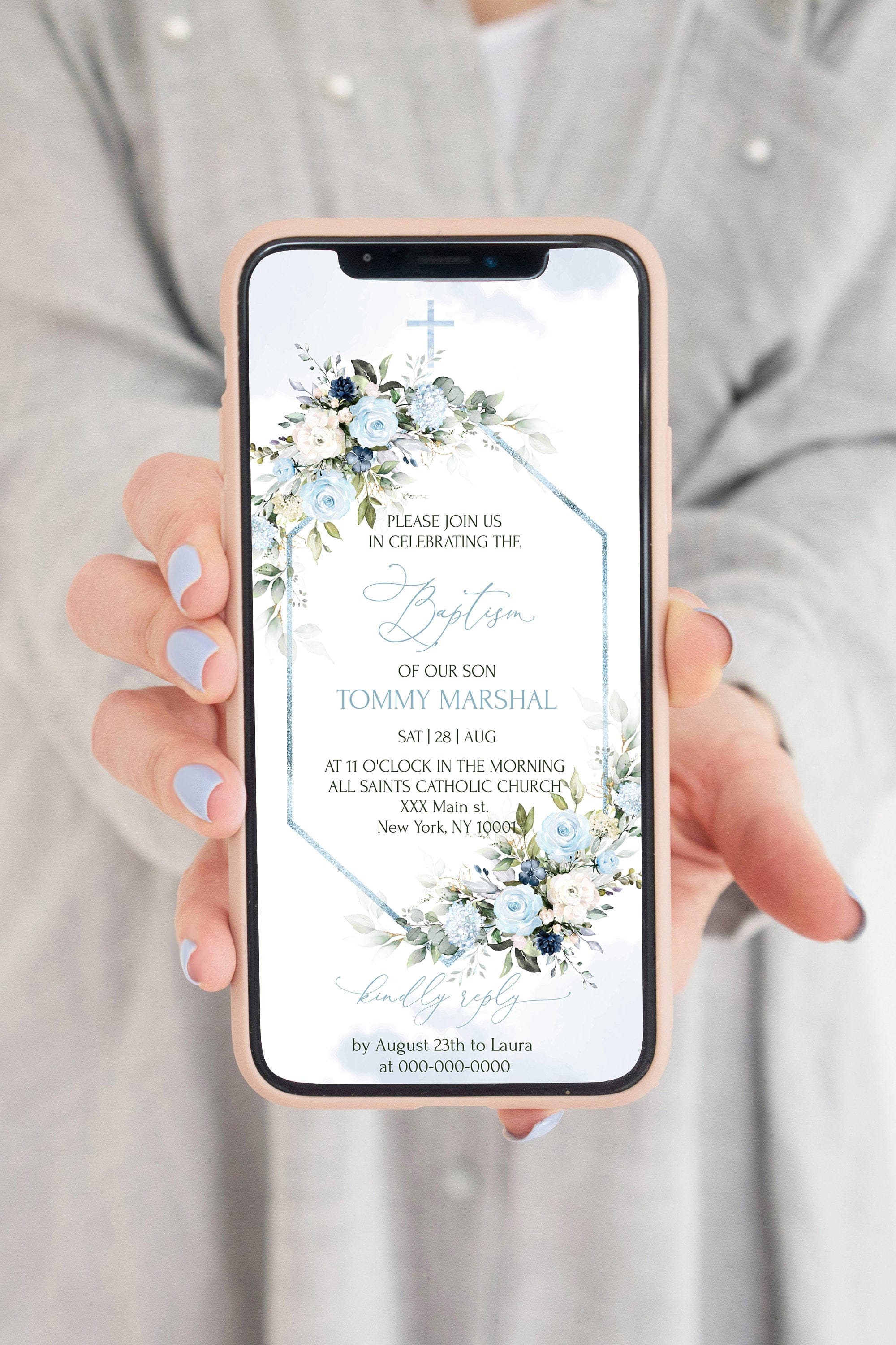 Blue Floral Baptism Invitation for Phone, EDITABLE Templates