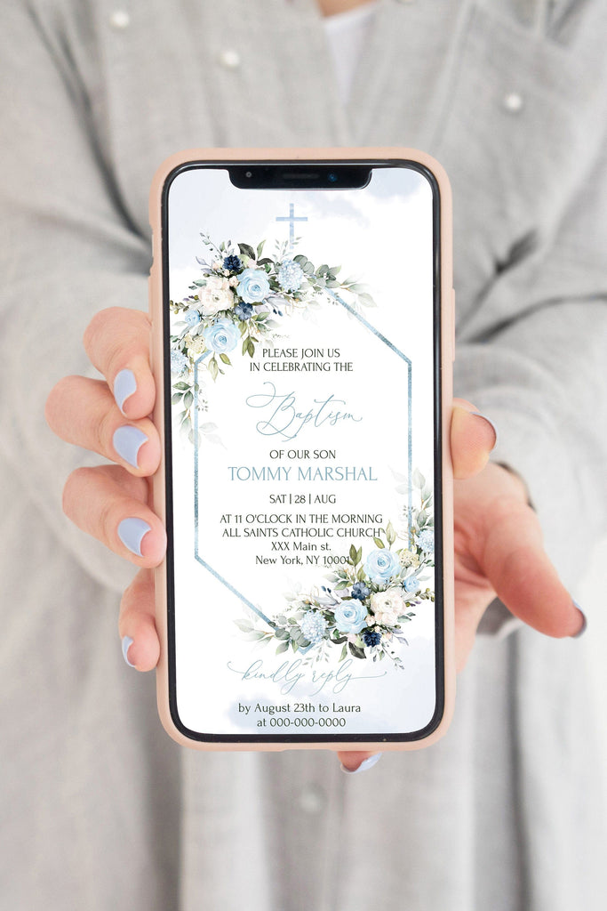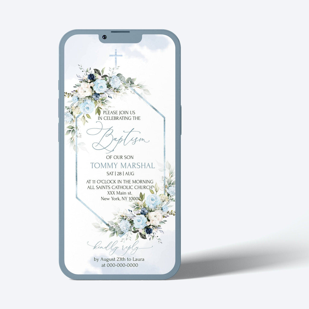 Blue Floral Baptism Invitation for Phone | Full HD & iPhone Optimized | DIY Christening