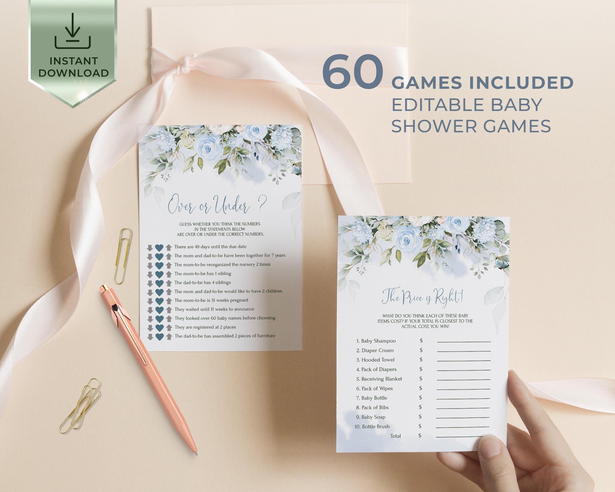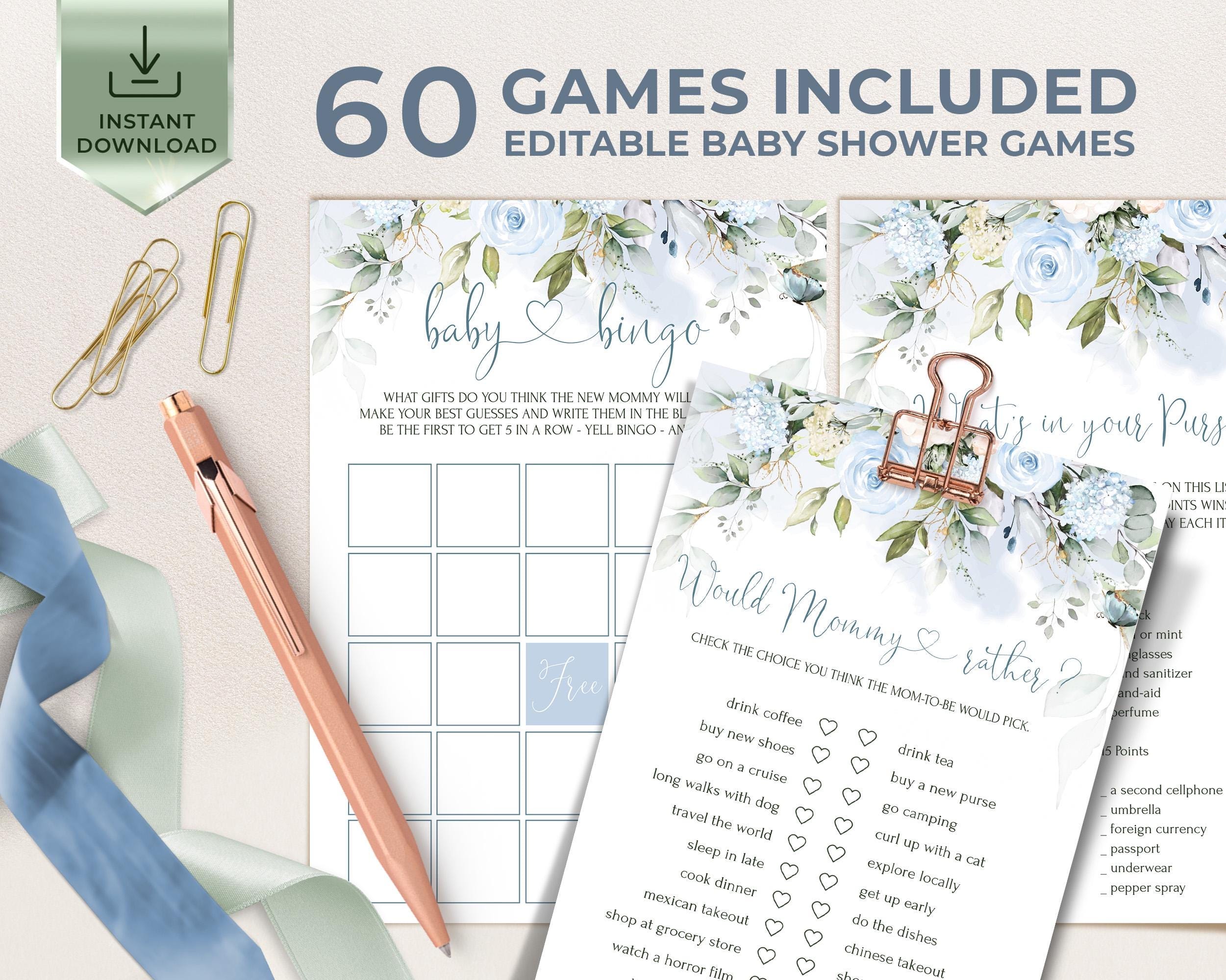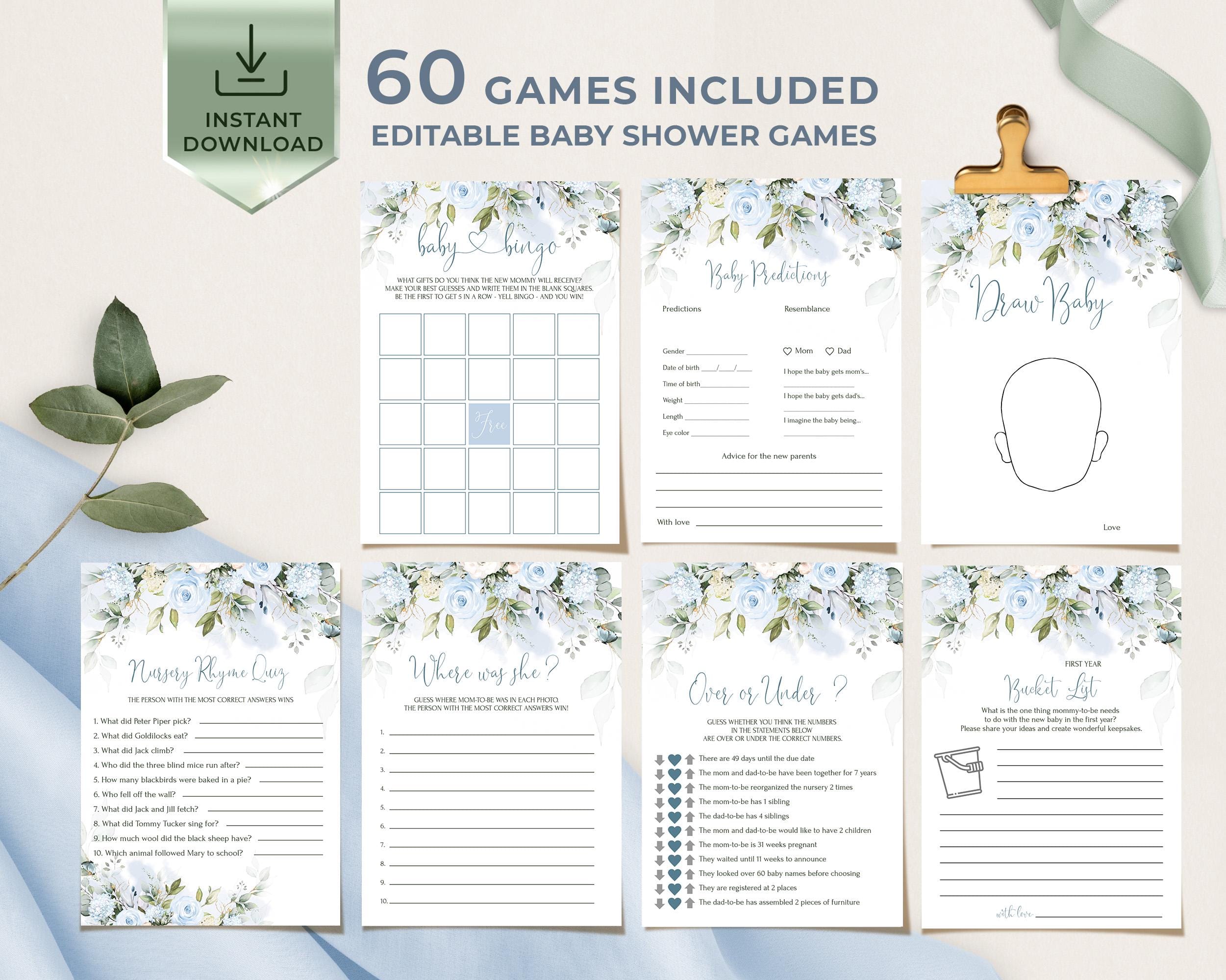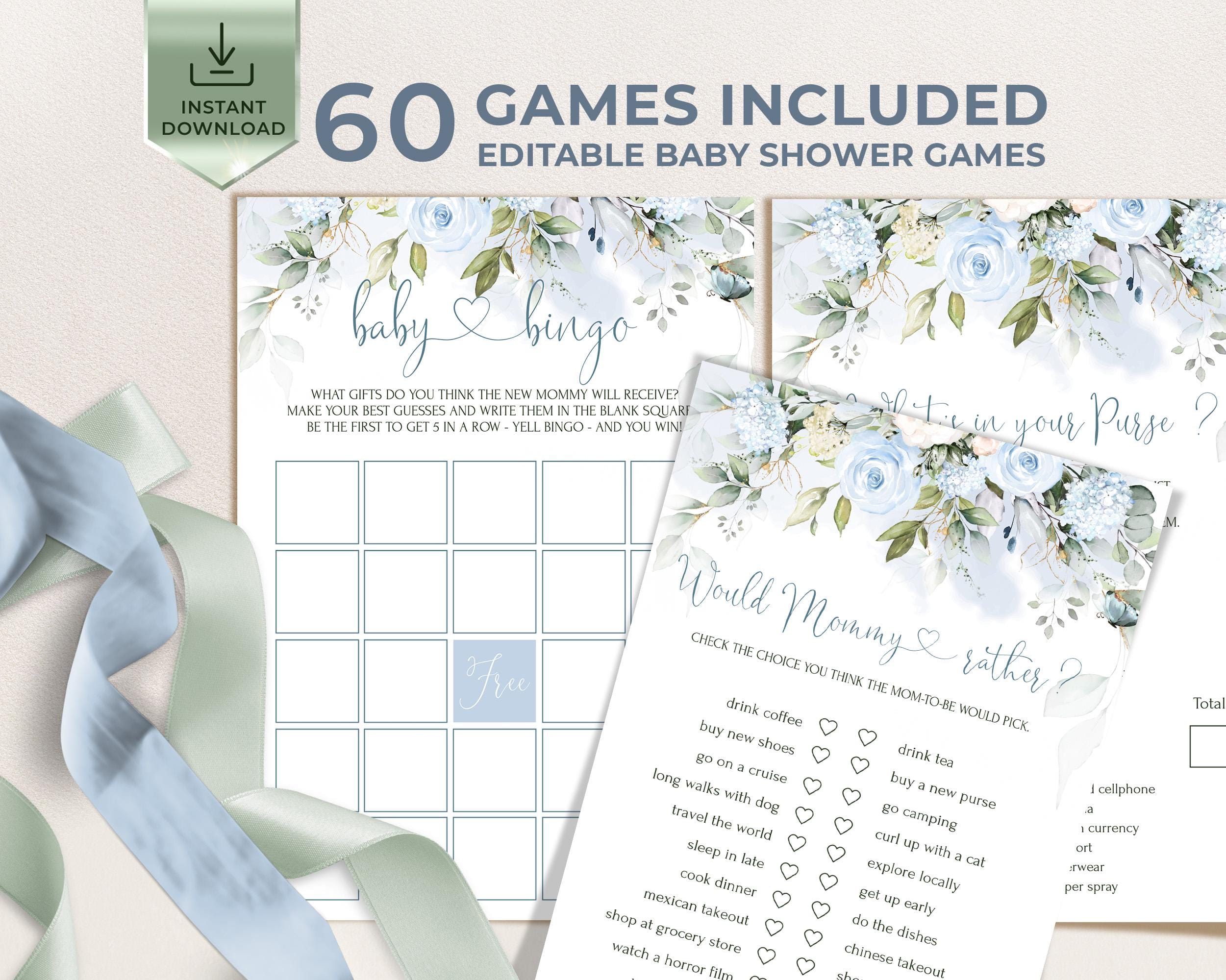 Blue Floral Baby Shower Games Set (60) – Editable Instant Download