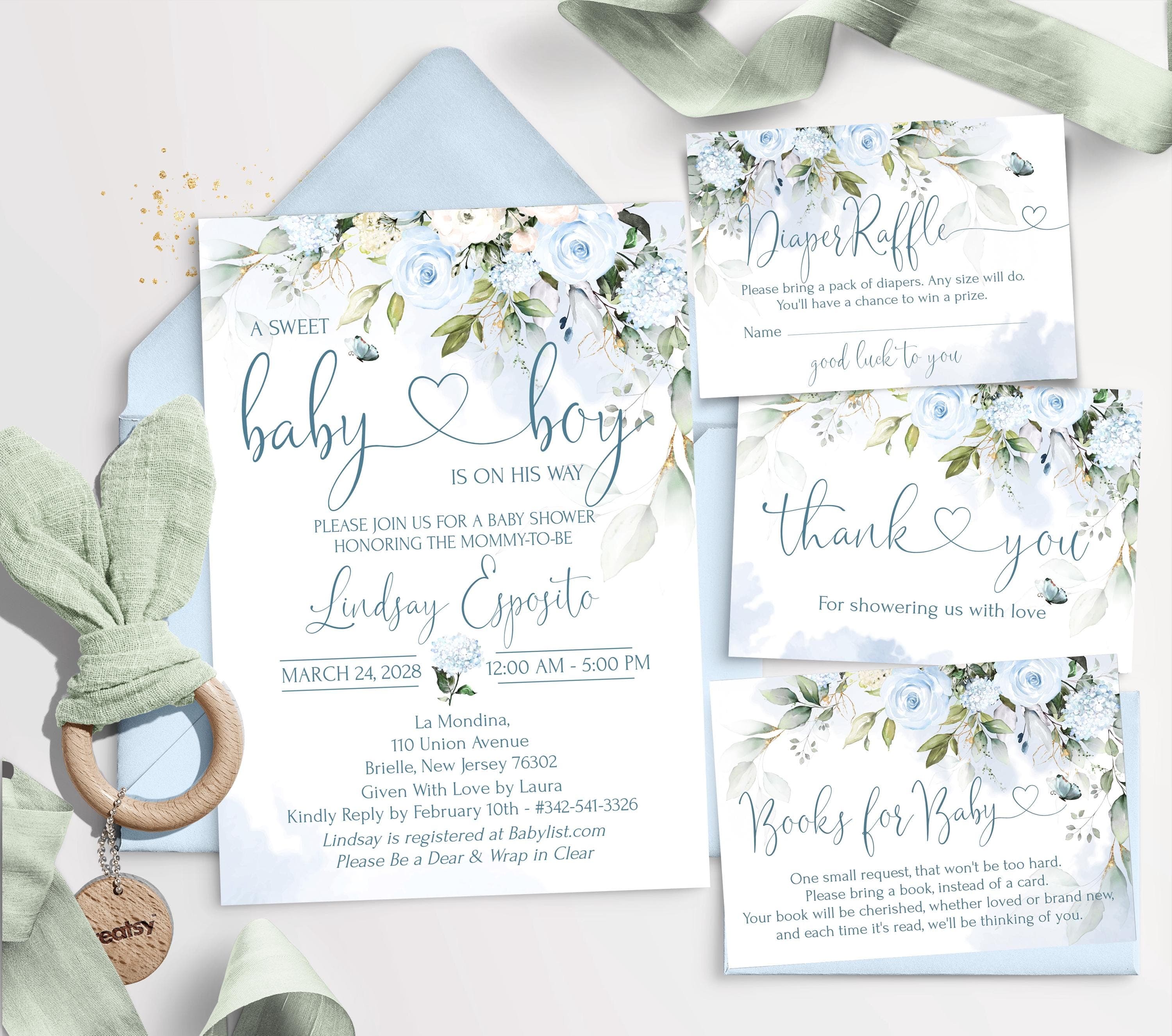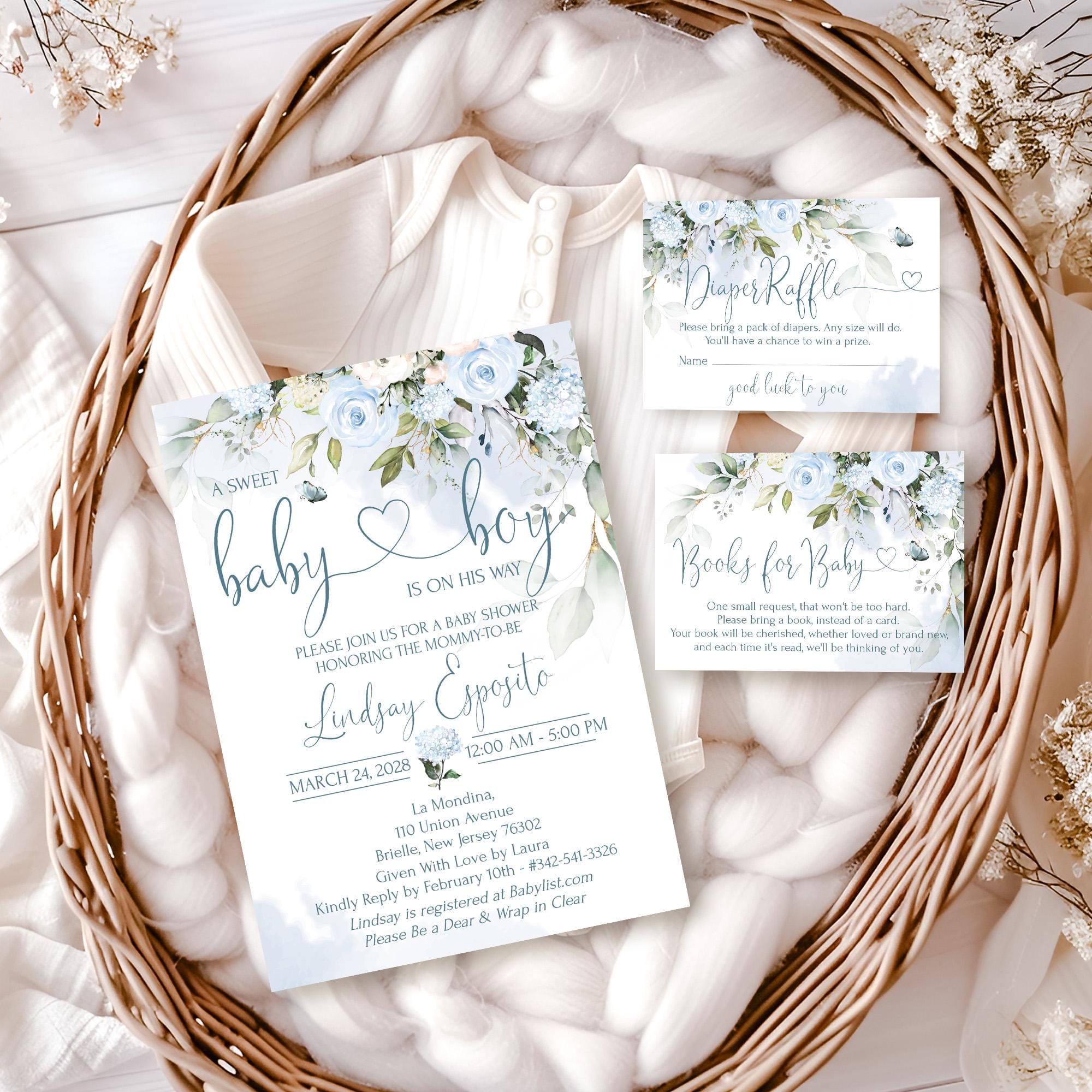 Dusty Blue Floral Baby Boy Shower Invite Bundle + Diaper Raffle