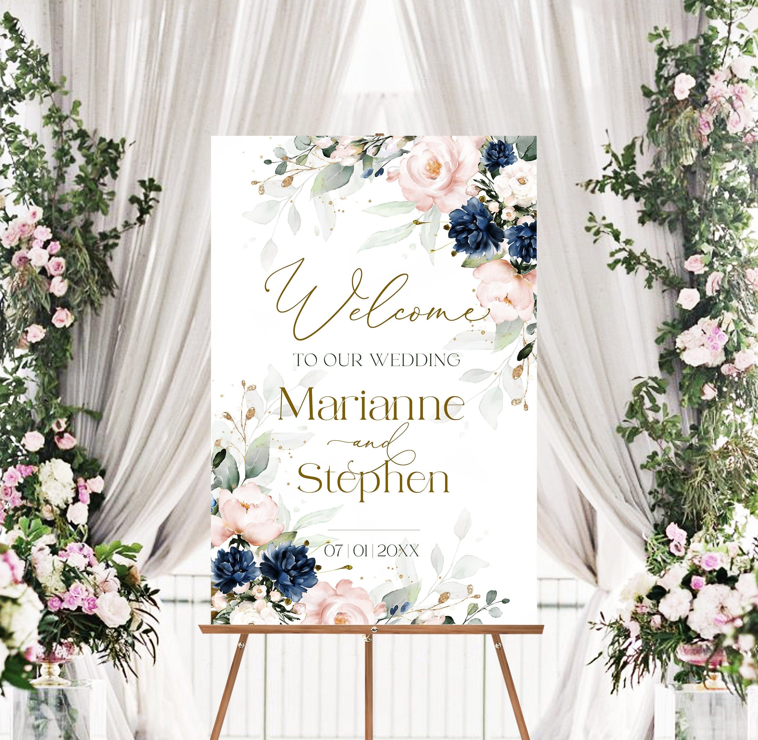 Blue Navy & Blush Wedding Welcome Sign, EDITABLE Templates