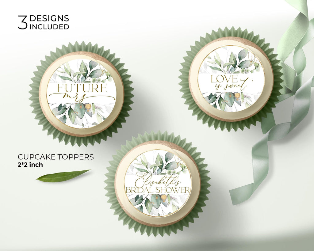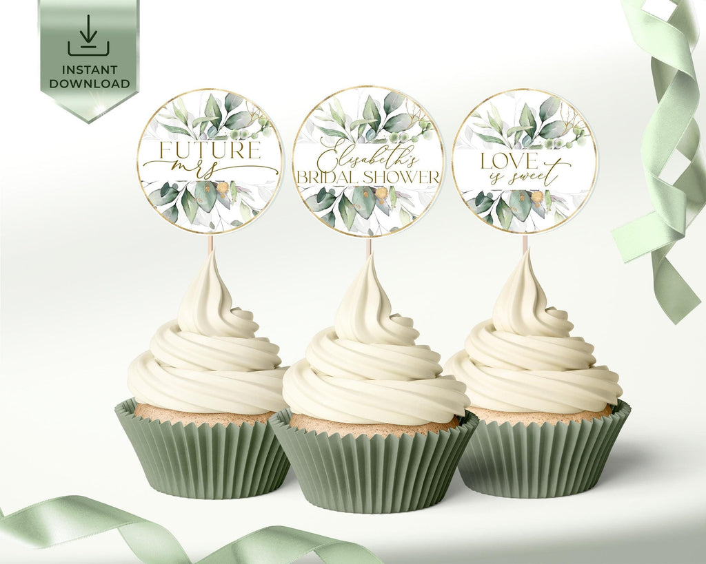 Sage Green Bridal Shower Cupcake Toppers | Editable Greenery & Gold Eucalyptus Printable Tags