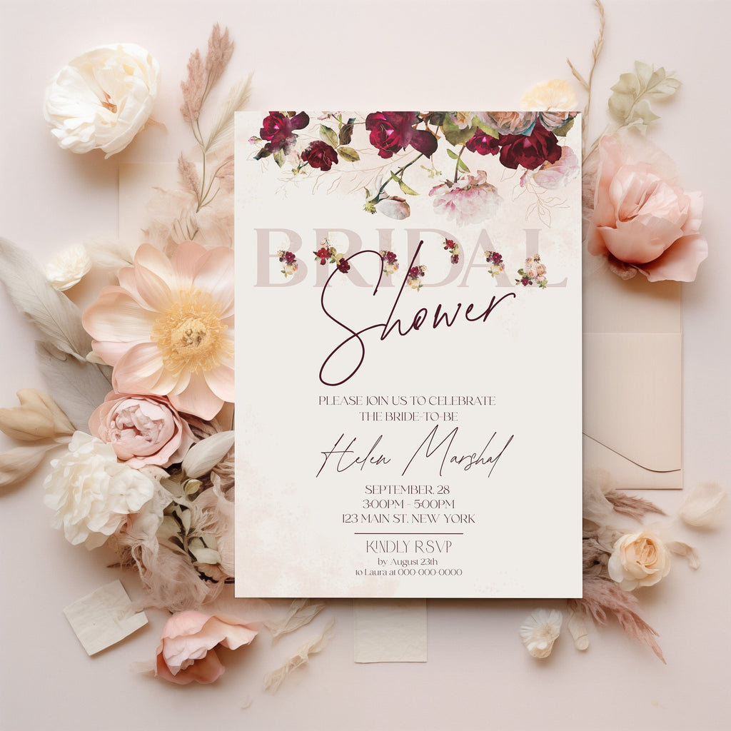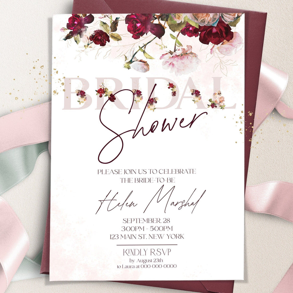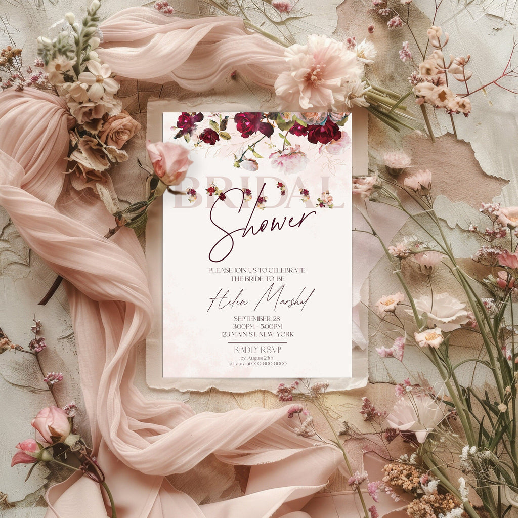 Burgundy Floral Bridal Shower Invitation, EDITABLE Templates