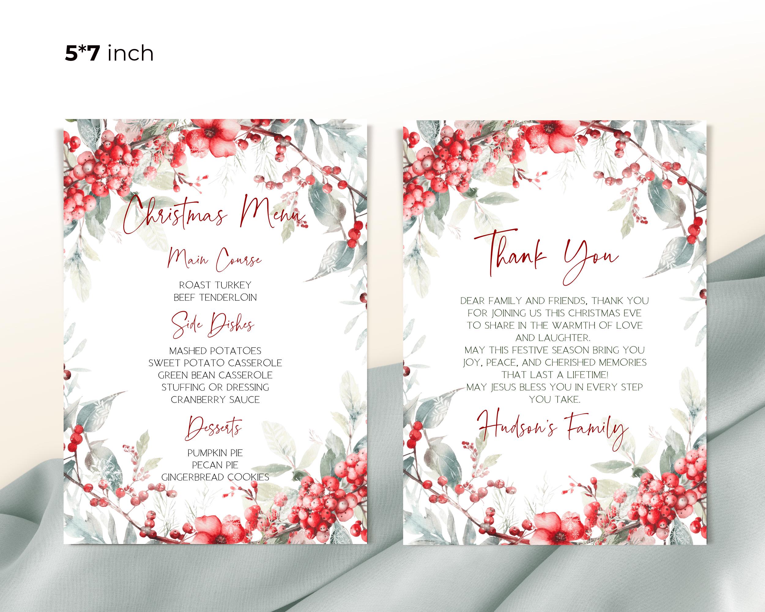 Bring festive charm to your holiday table with this Christmas Dinner Menu Template 🎄. Designed with red berry watercolor florals and elegant typography, it’s fully editable and ready to print — perfect for Christmas parties, dinners, and celebrations!