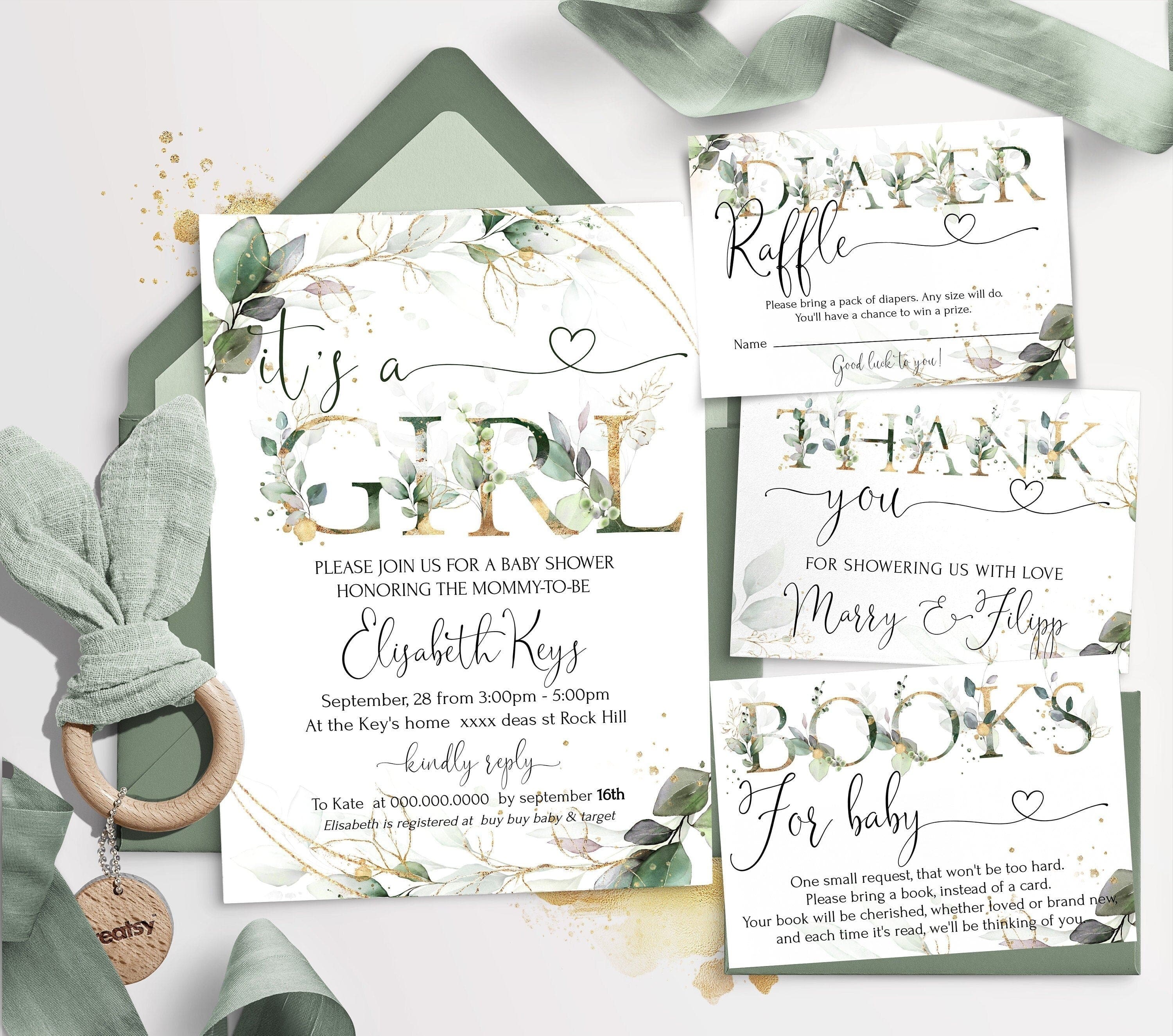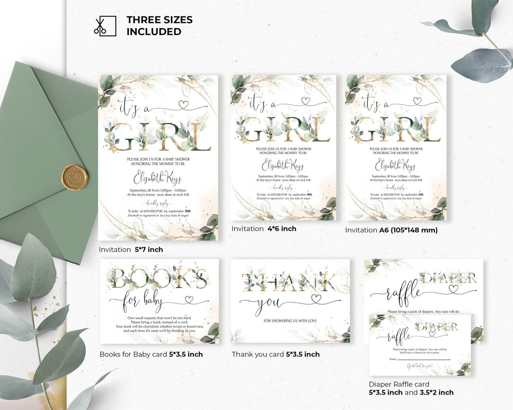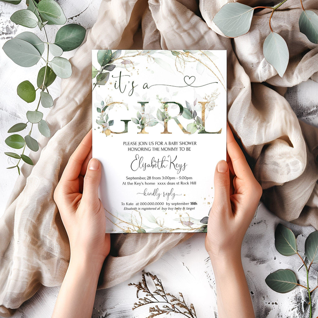 Eucalyptus Baby Shower Set | Greenery Gold It’s a Girl Invitation