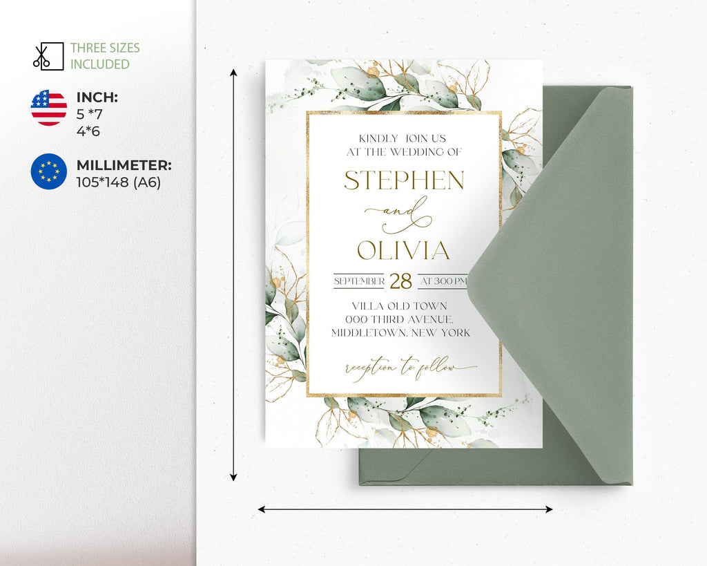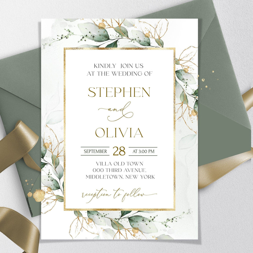 Eucalyptus & Gold Leaf Invite, EDITABLE Templates
