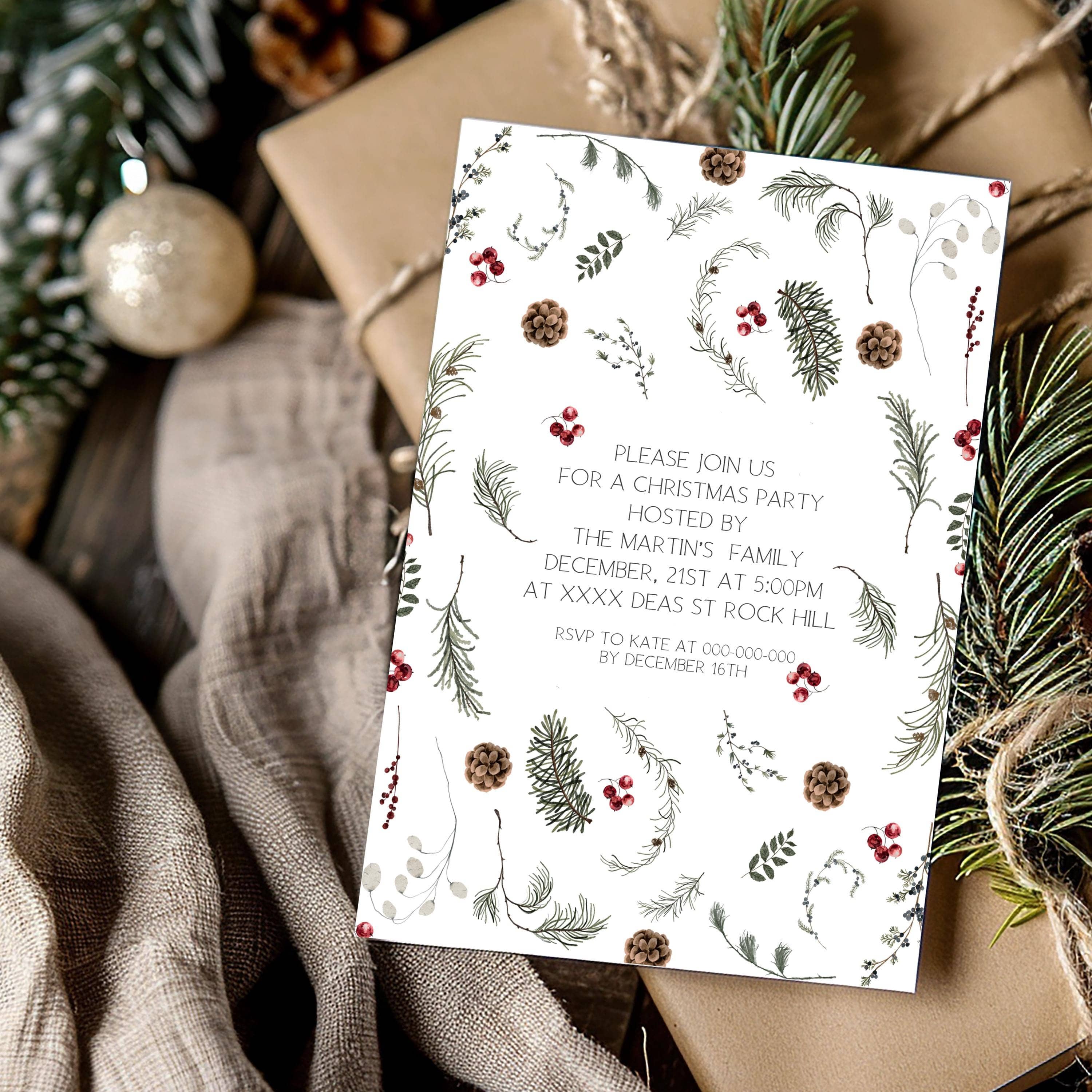 Festive Winter Sprigs Invitation, EDITABLE Templates