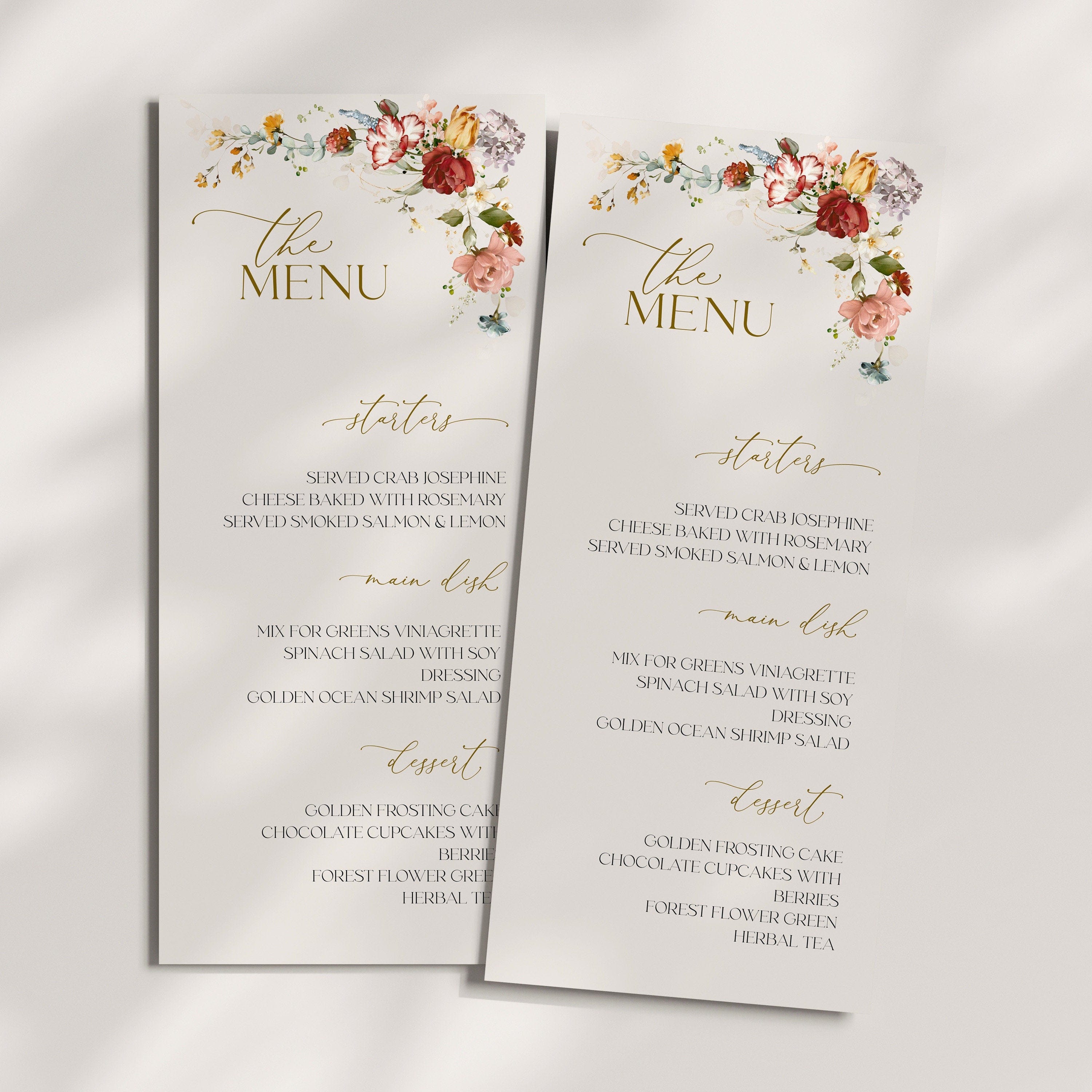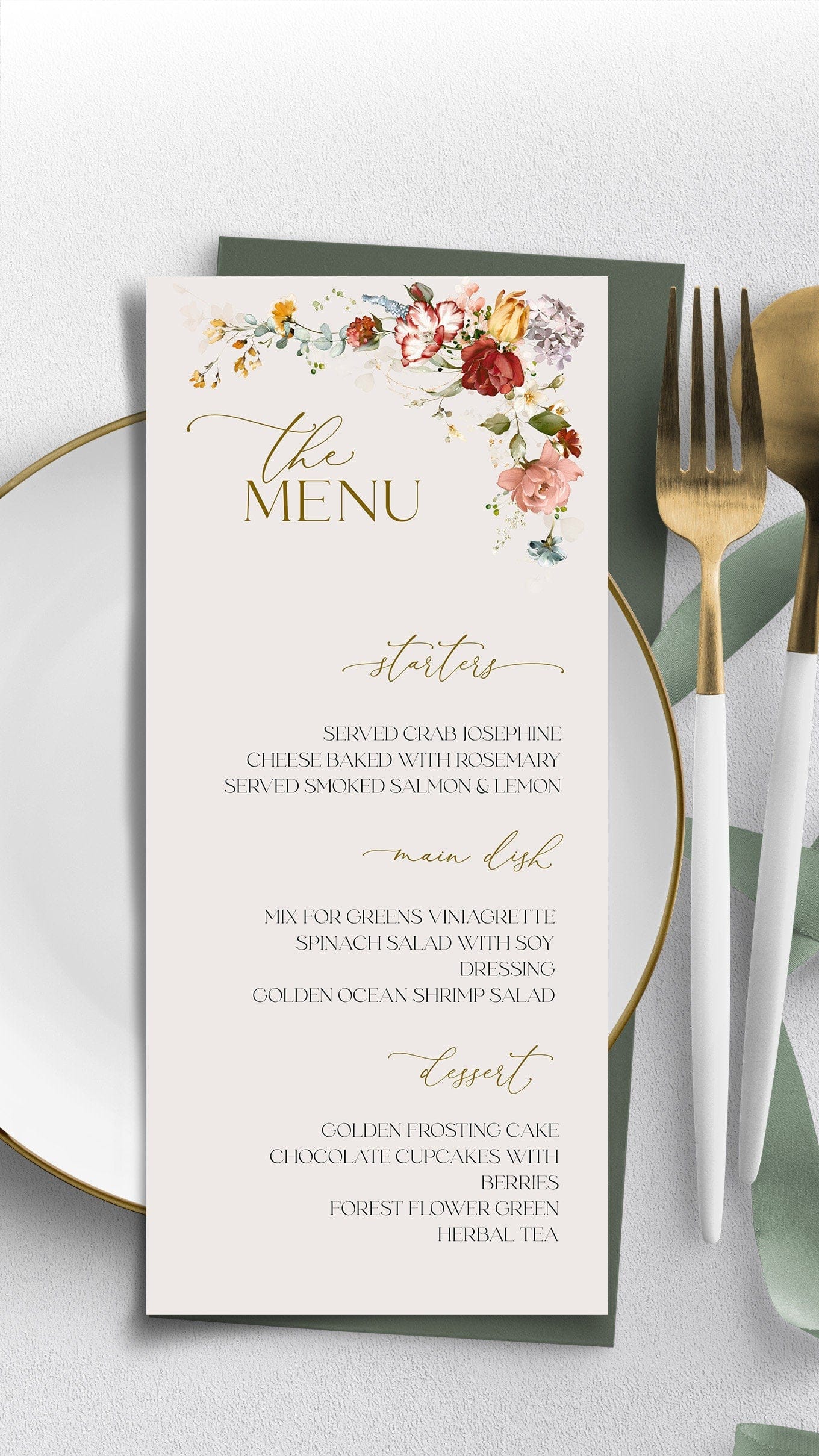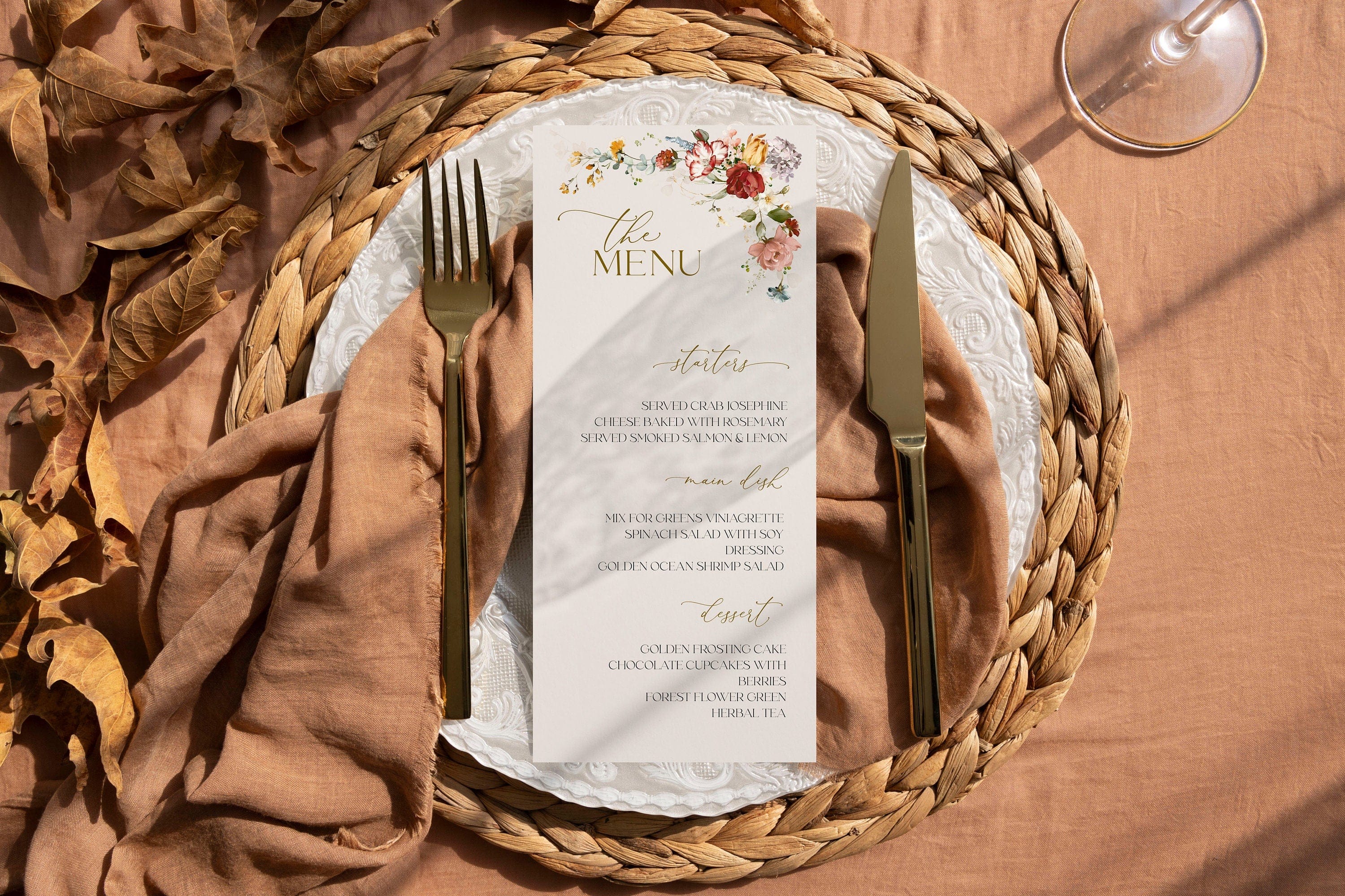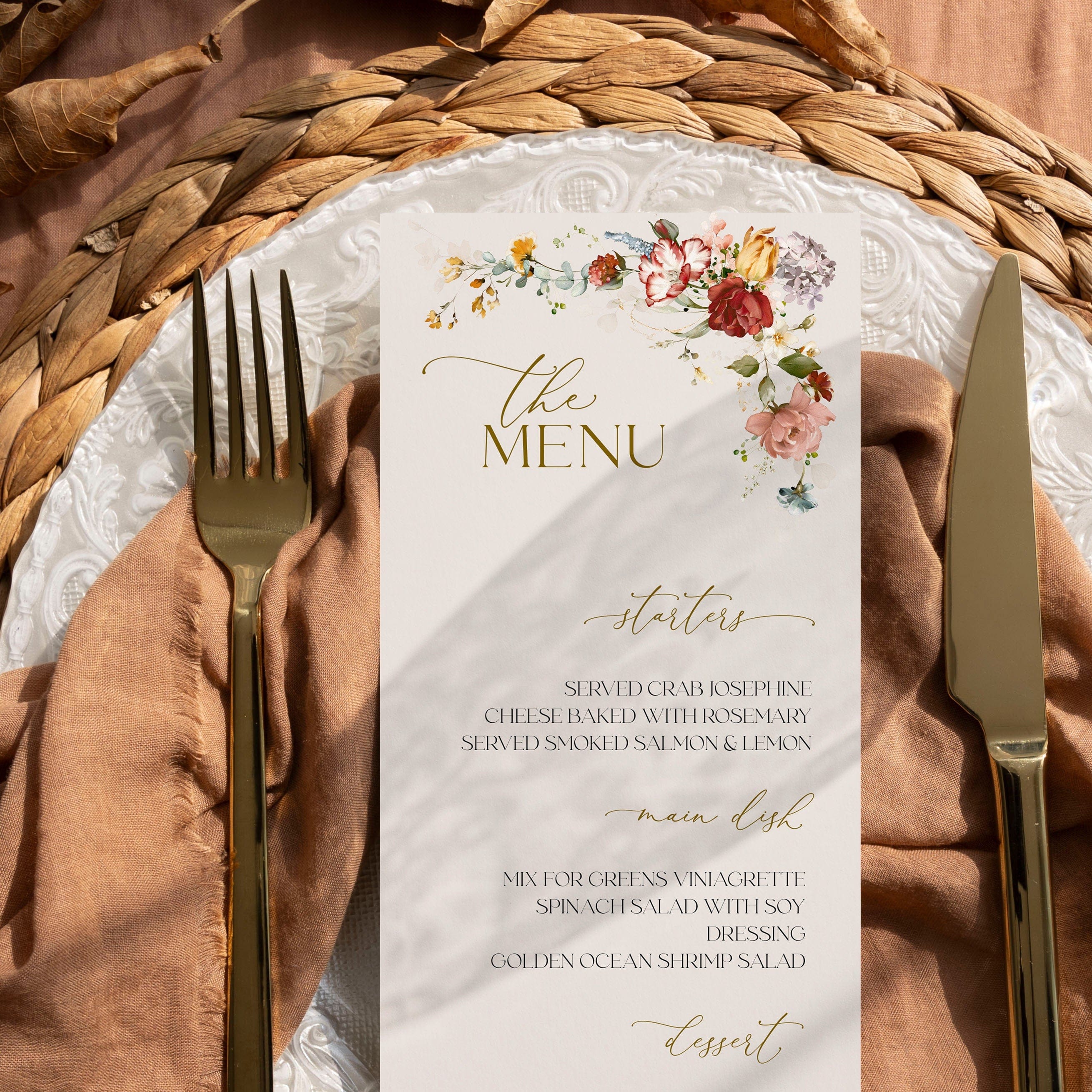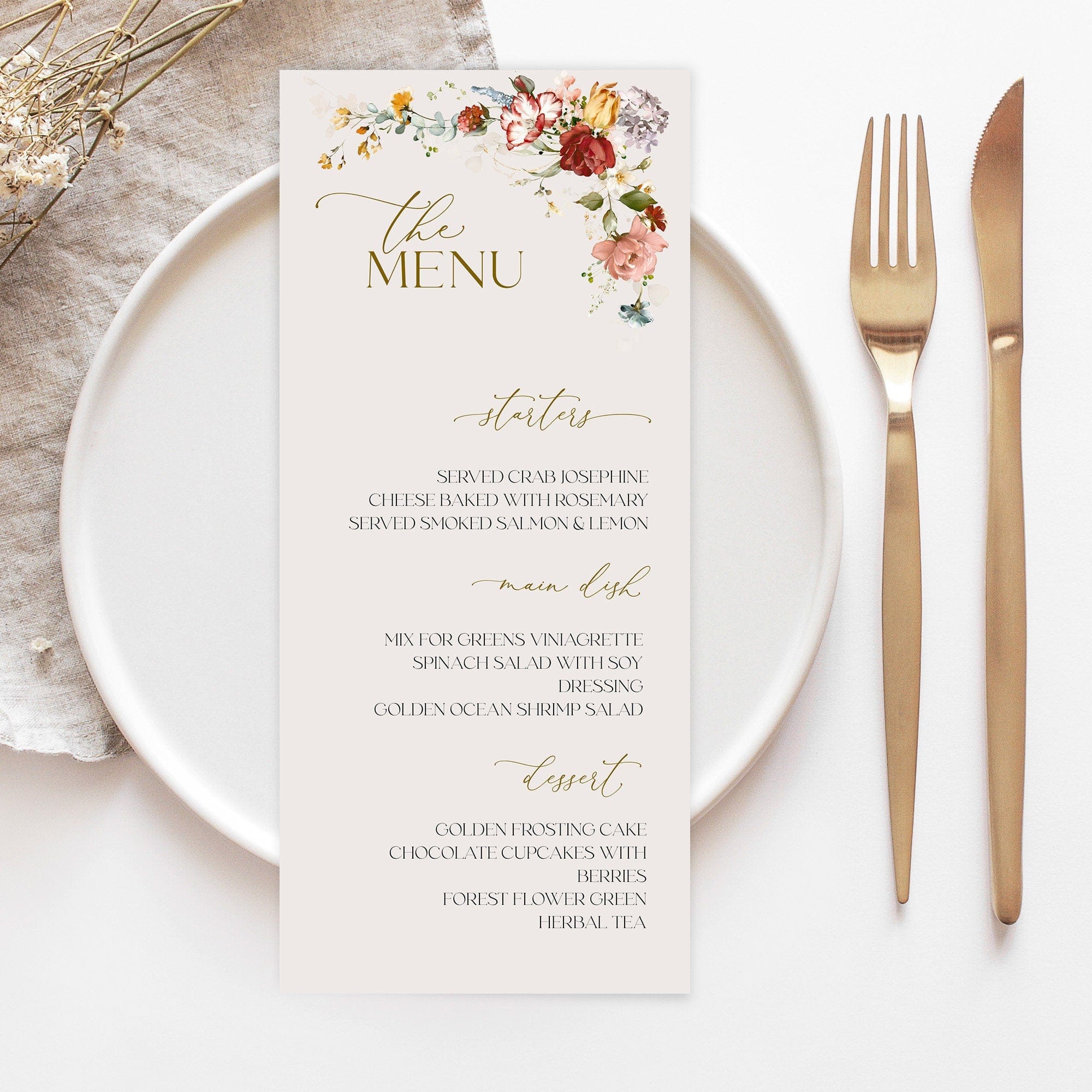 Modern Neutral Wedding Menu Card Editable Floral Corner Design