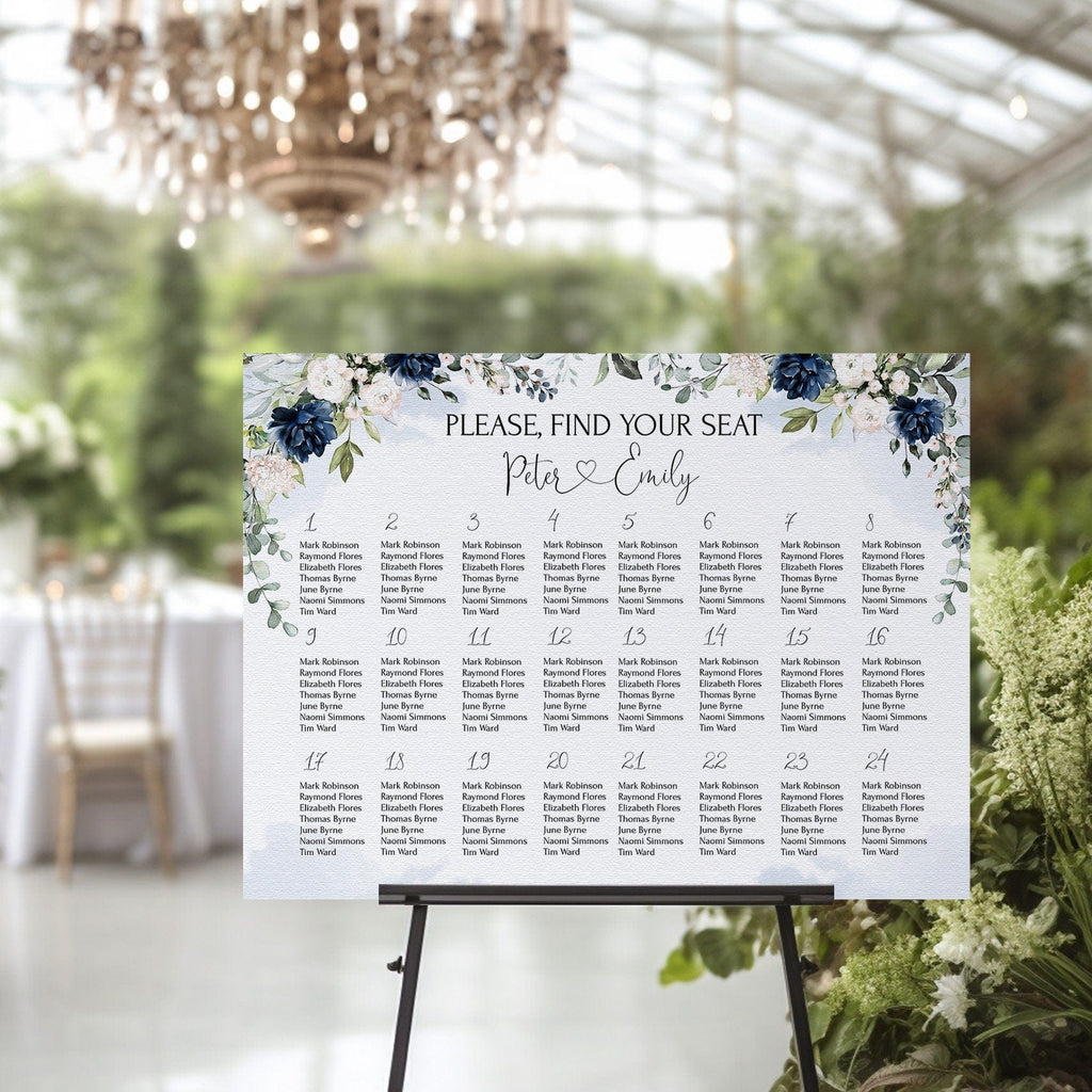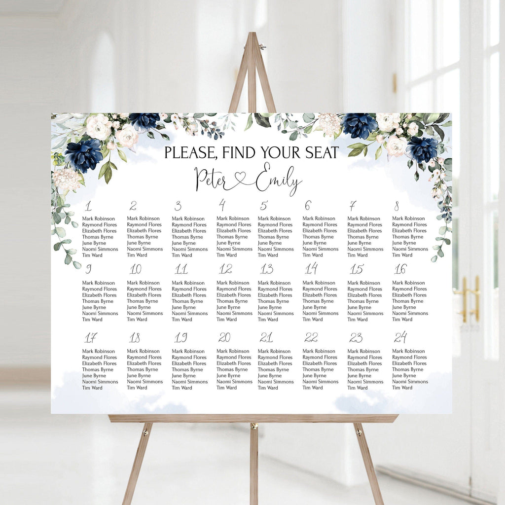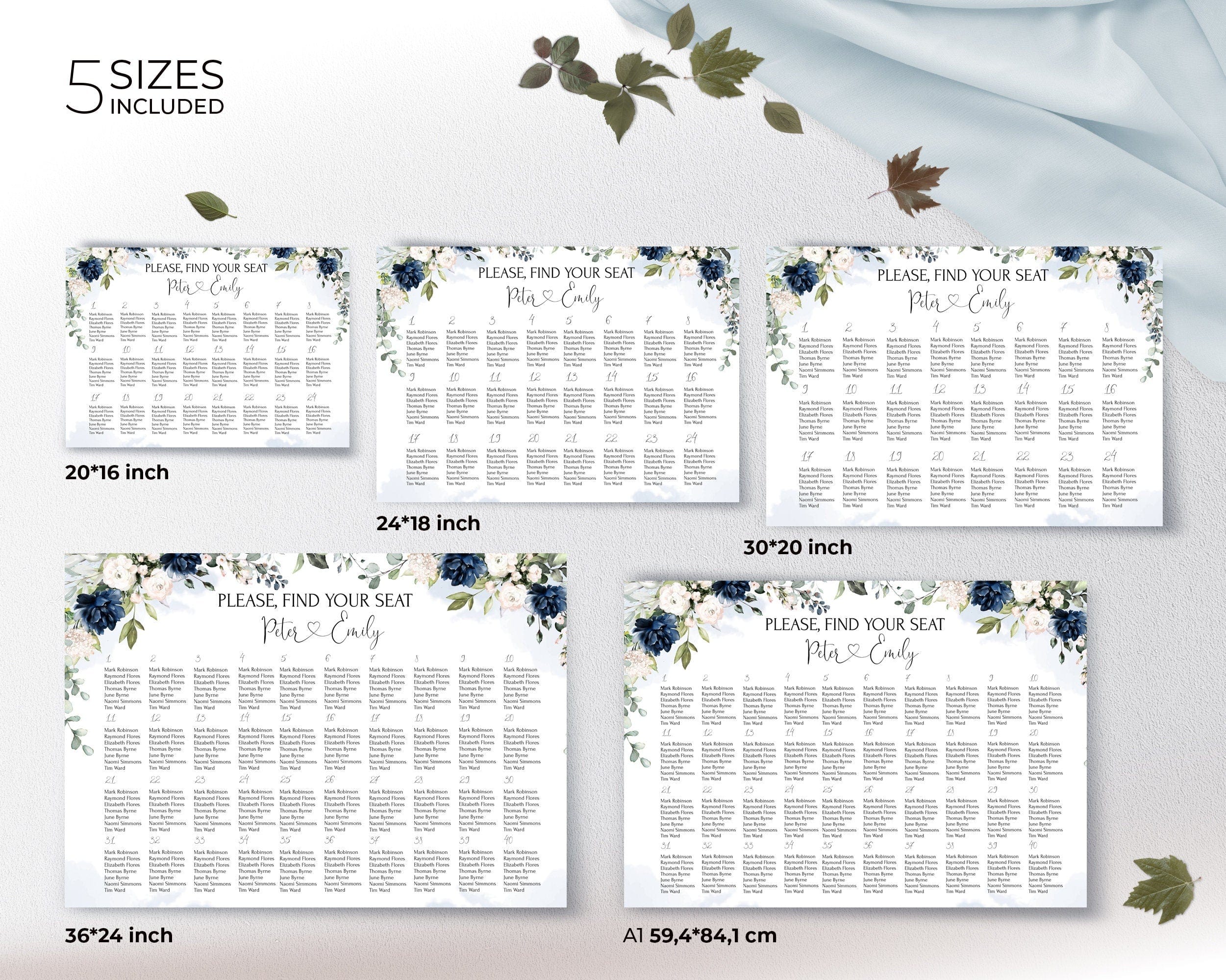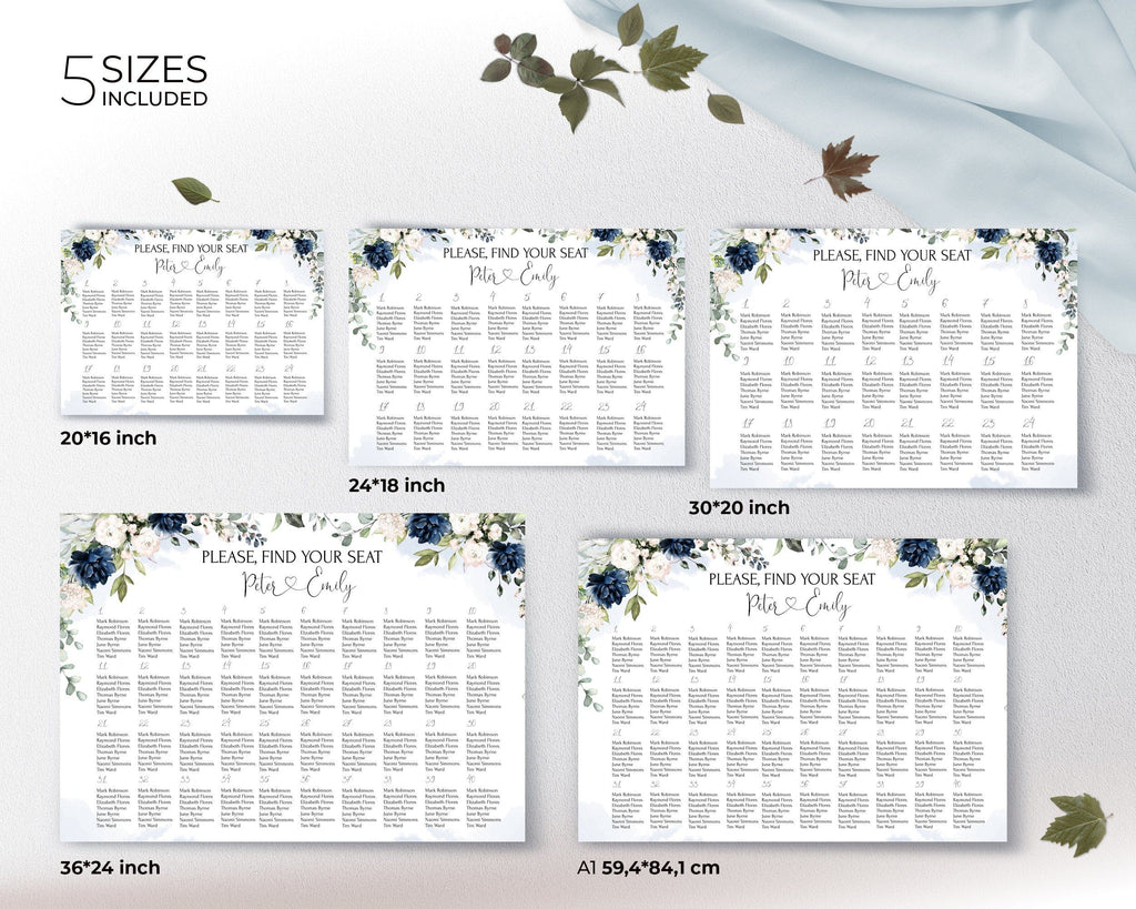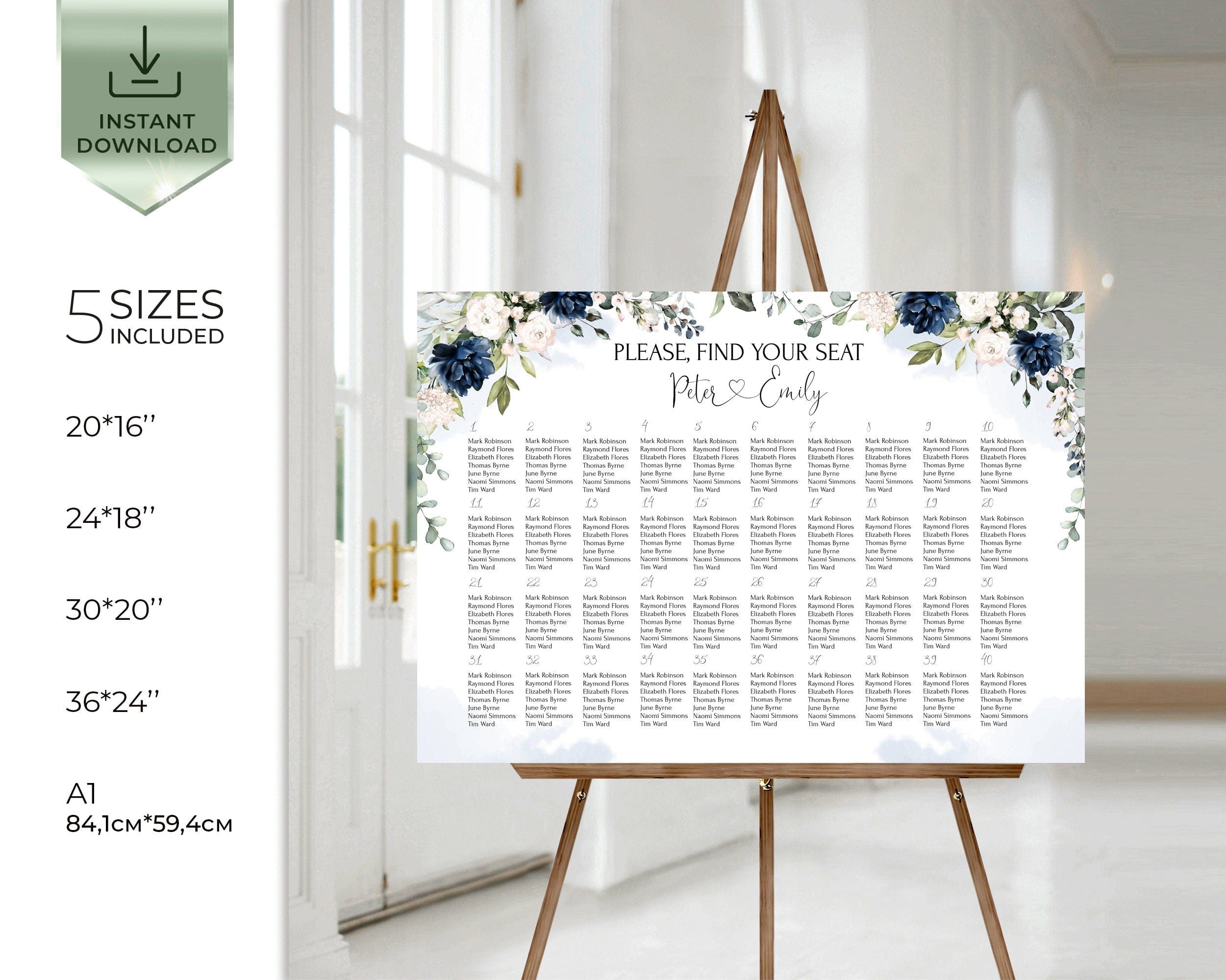 Gold Floral Wedding Seating Chart | 6 Sizes | Navy Blue Themed Inspo