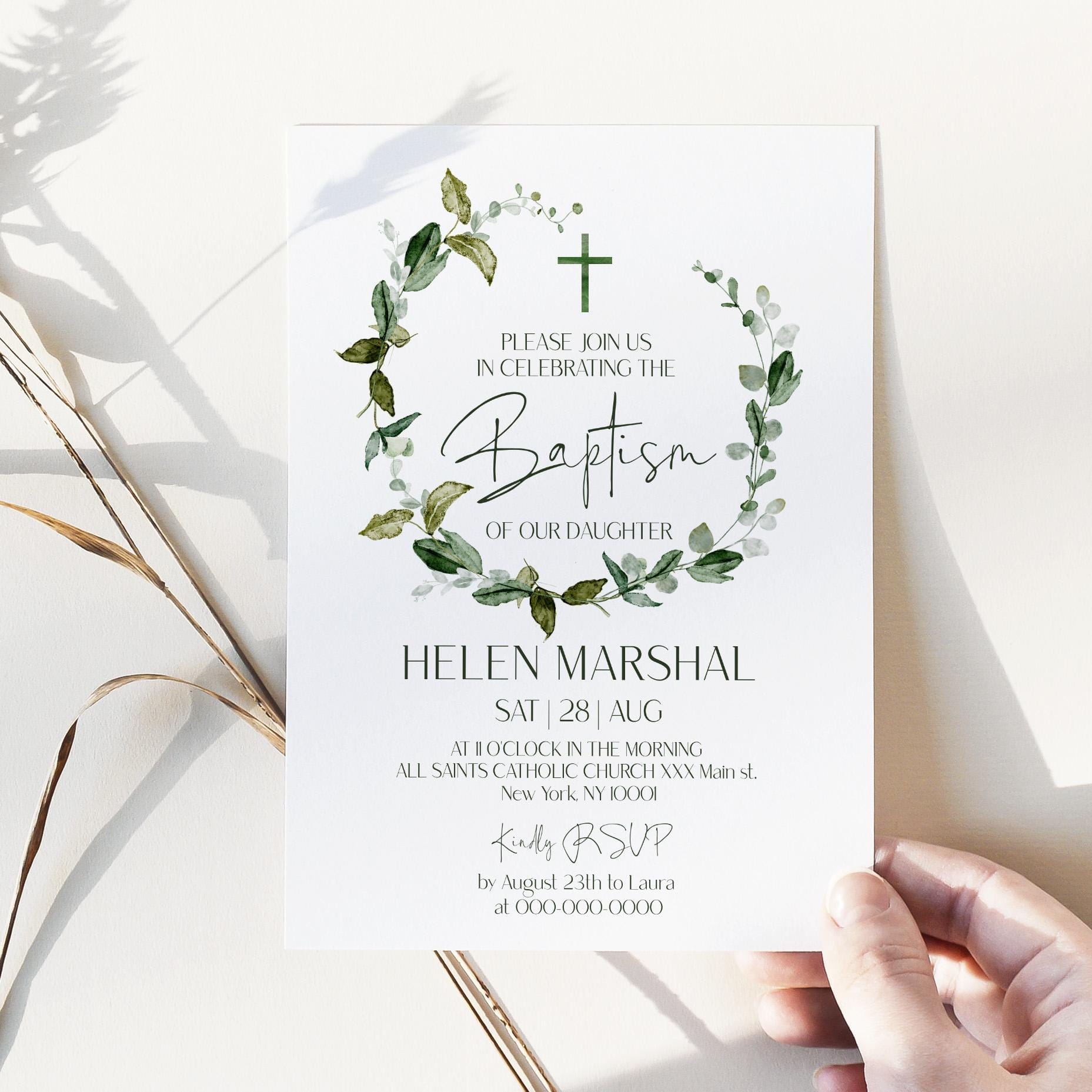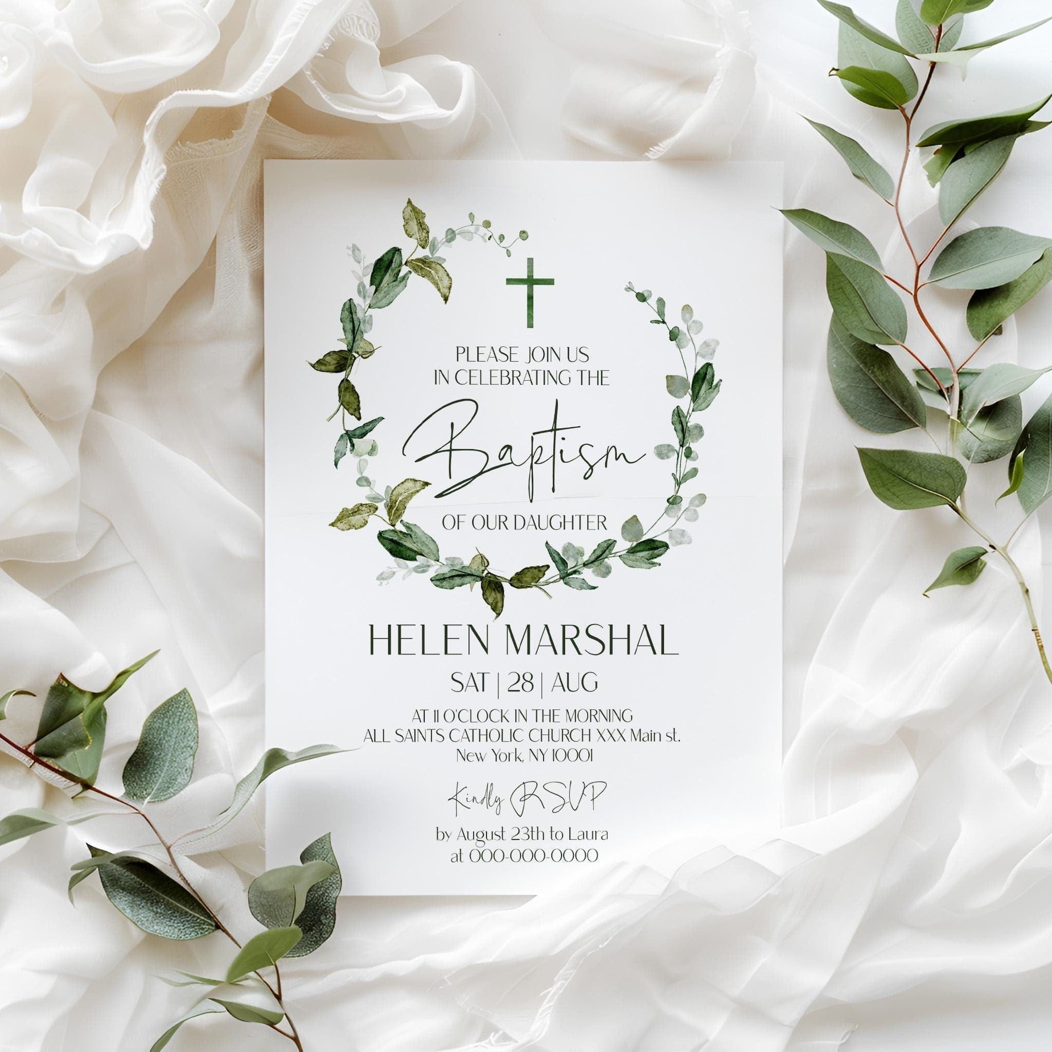 Eucalyptus Baptism Christening Invite | 3 Sizes | Personalized Invitations