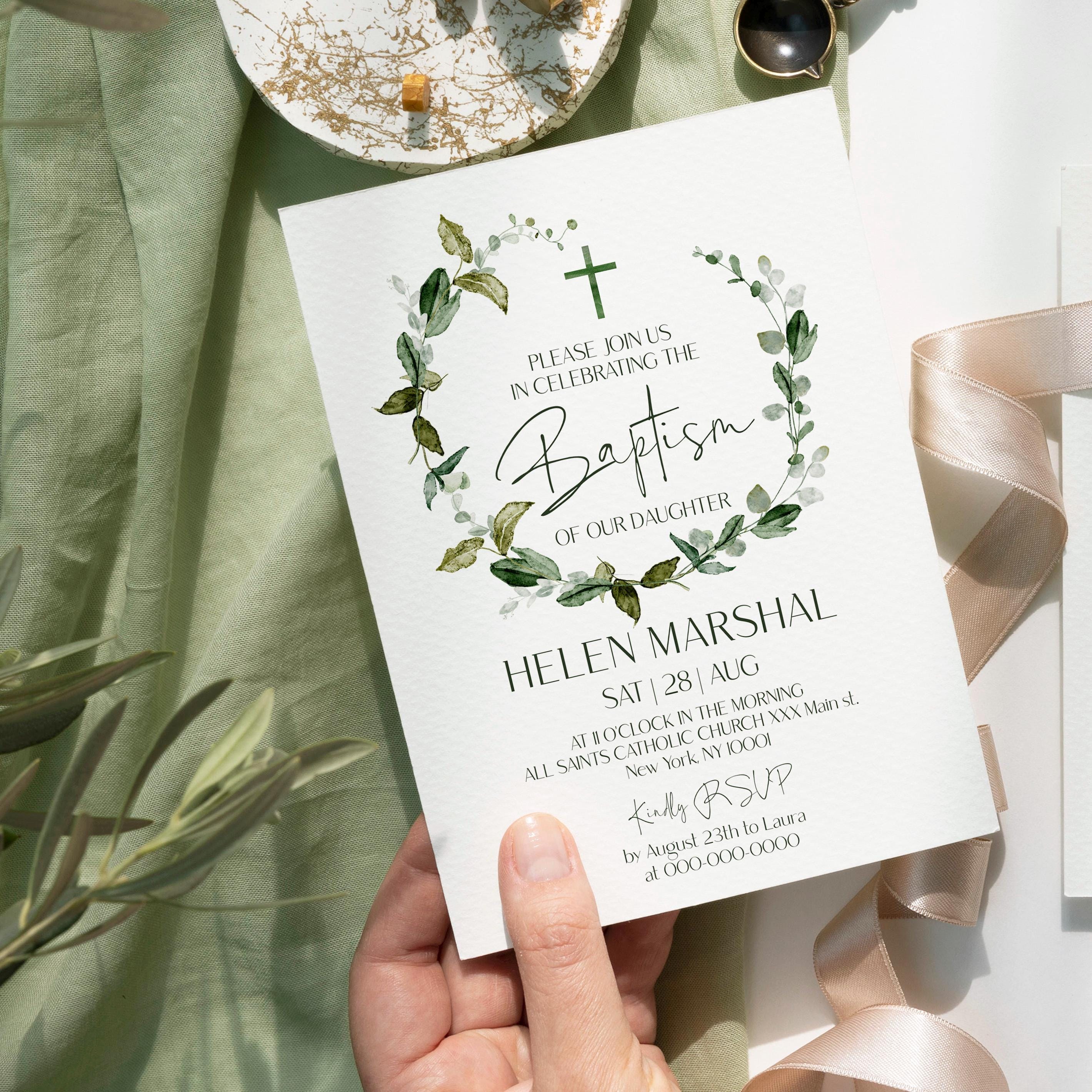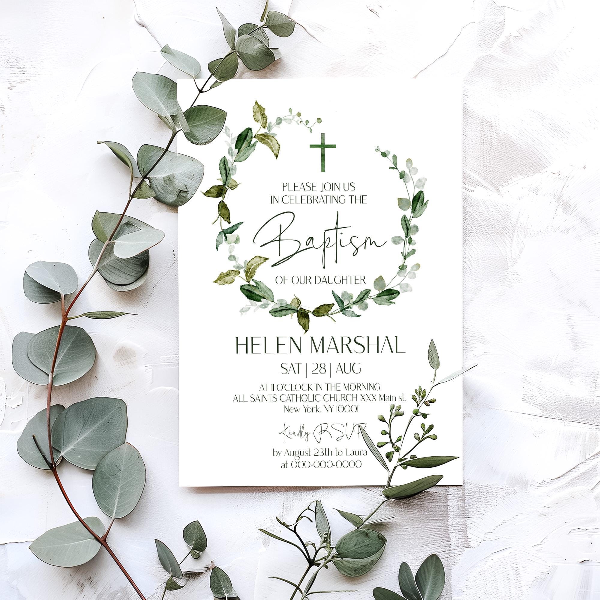 Eucalyptus Baptism Christening Invite, EDITABLE Templates