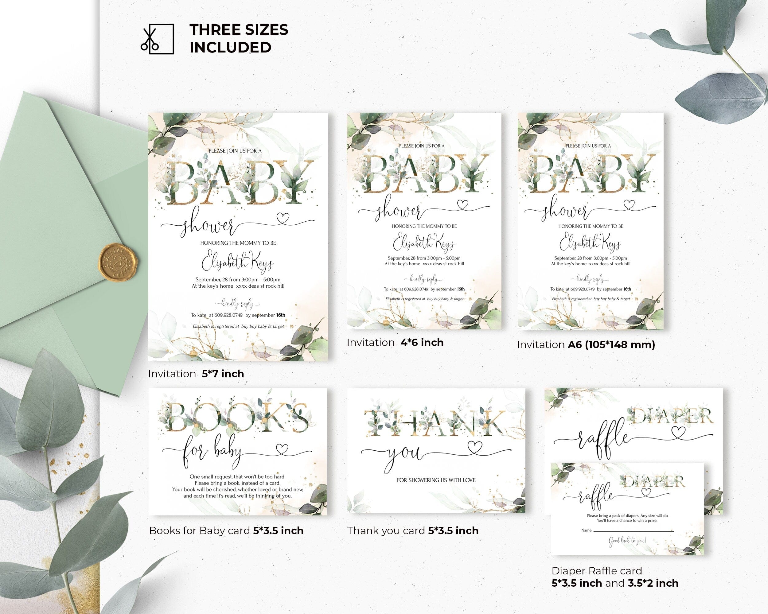 Greenery Baby Shower Invitation Set, EDITABLE Templates