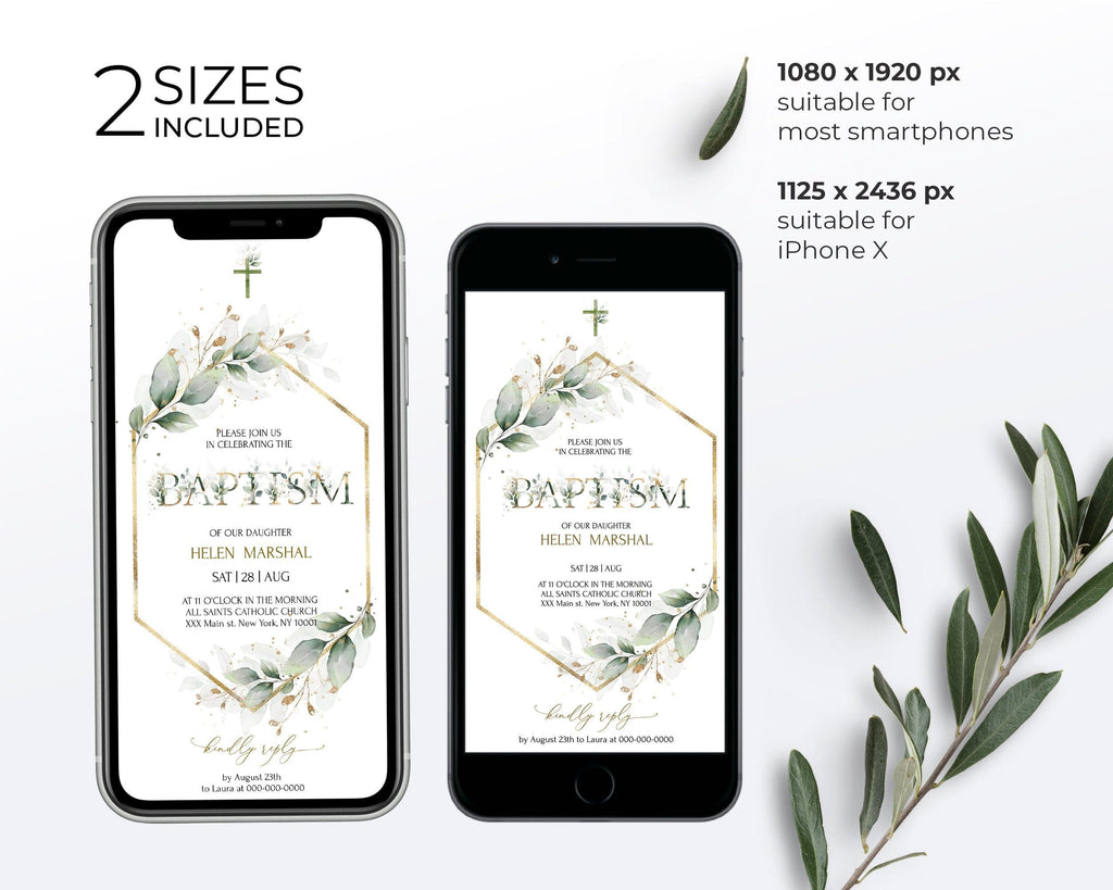 Greenery Baptism E-Invitation | Digital Christening Invite | Editable Templates