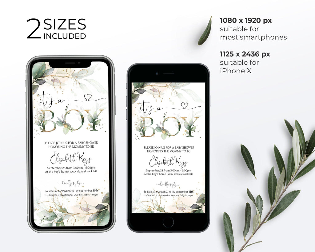 It’s a Boy Baby Shower E-Invite | Greenery & Gold Digital Card