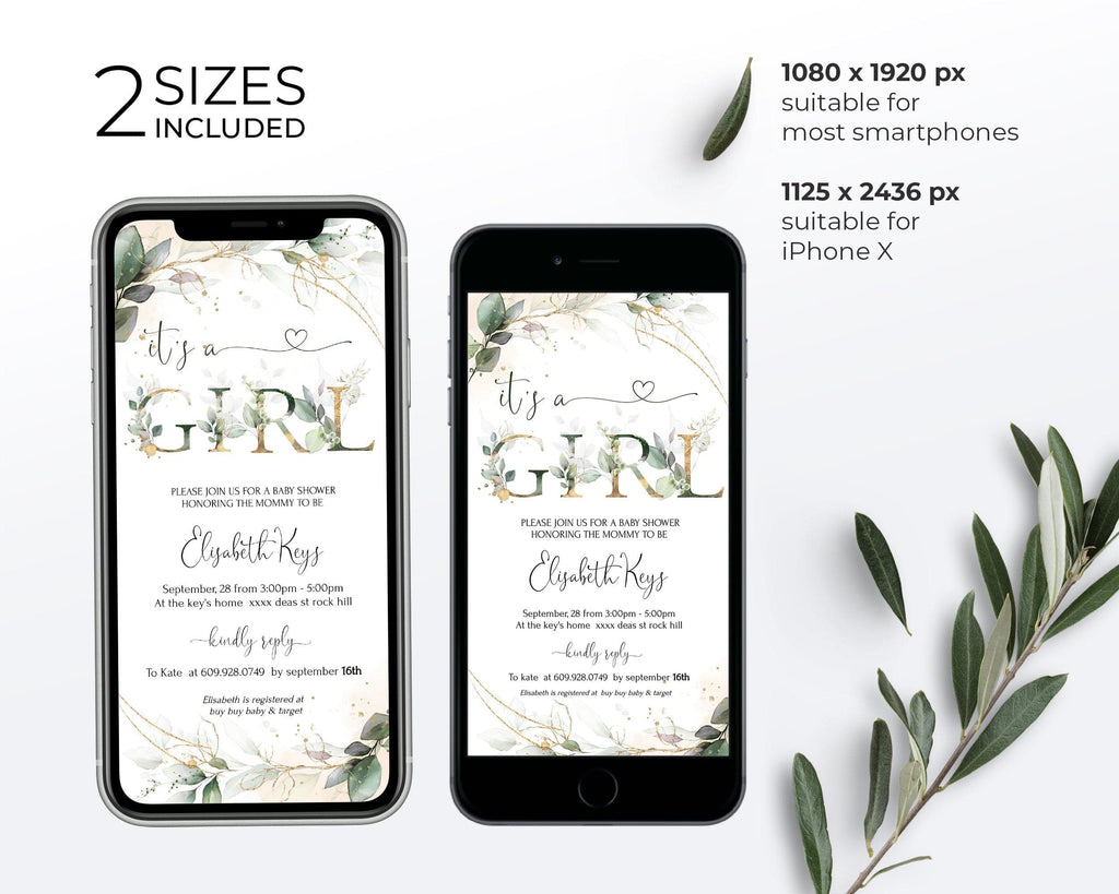 It’s a Girl Baby Shower Invitation | Greenery Gold Mobile Invite