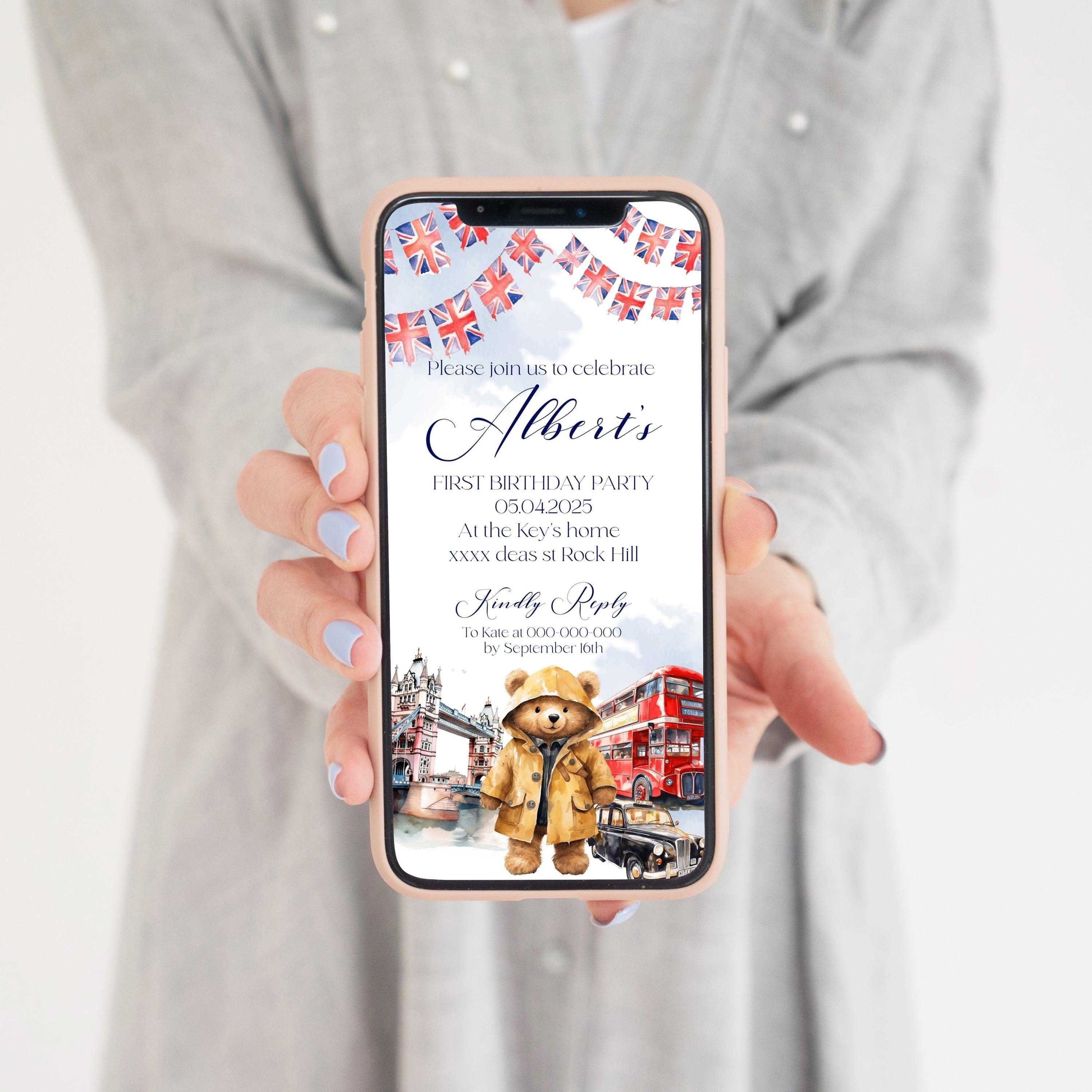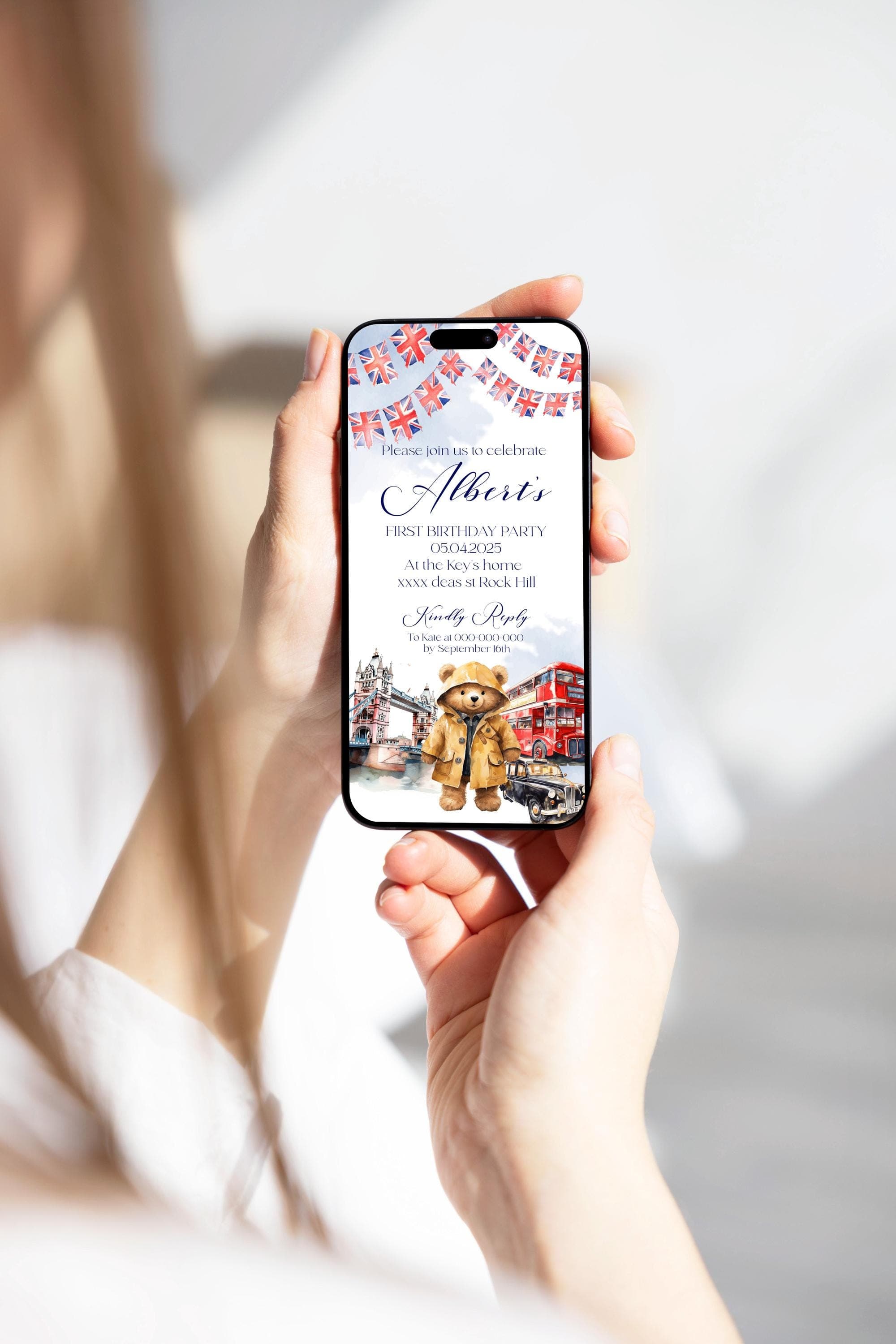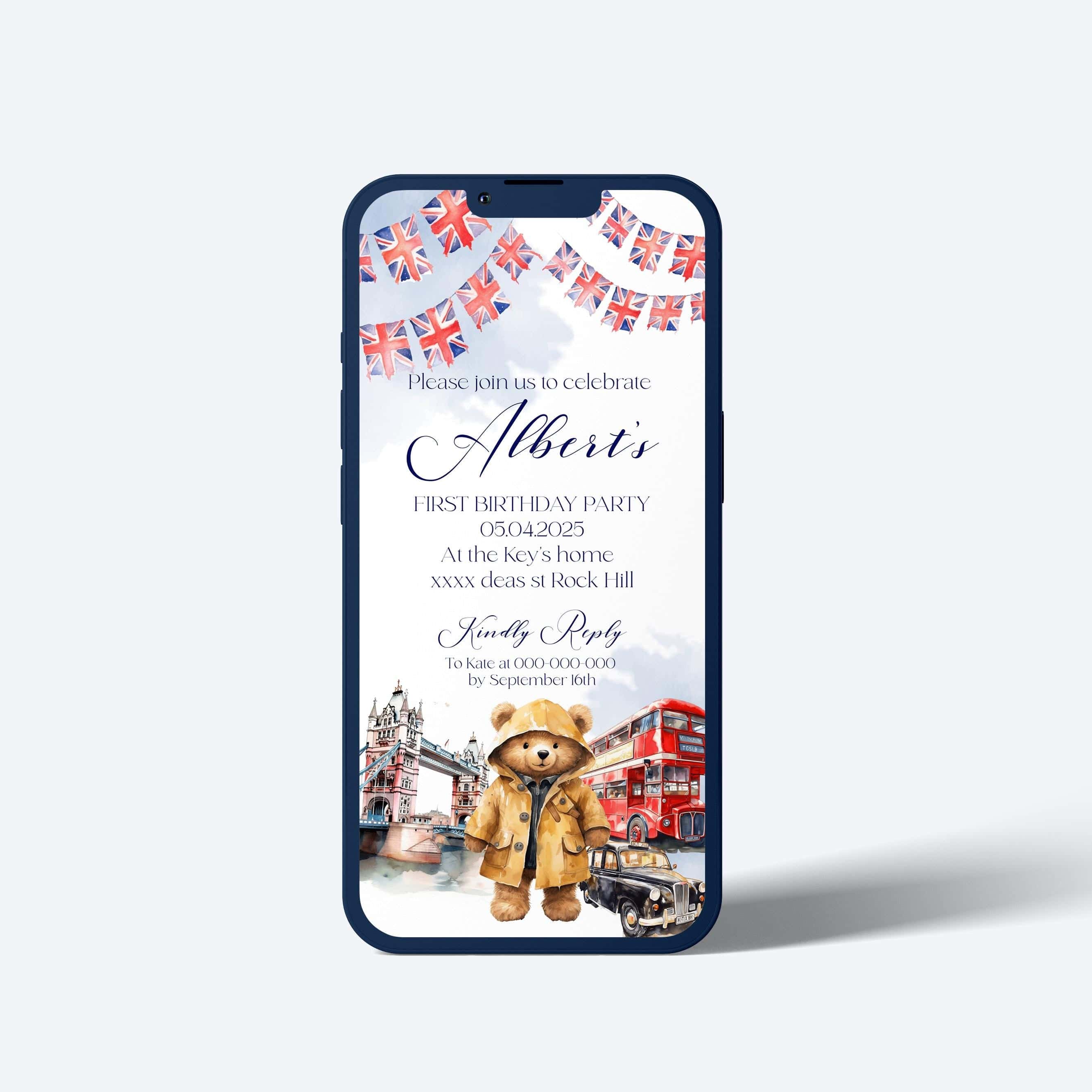 London Bear 1th Birthday Electronic Invitation | Personalized Evites for Smartphone