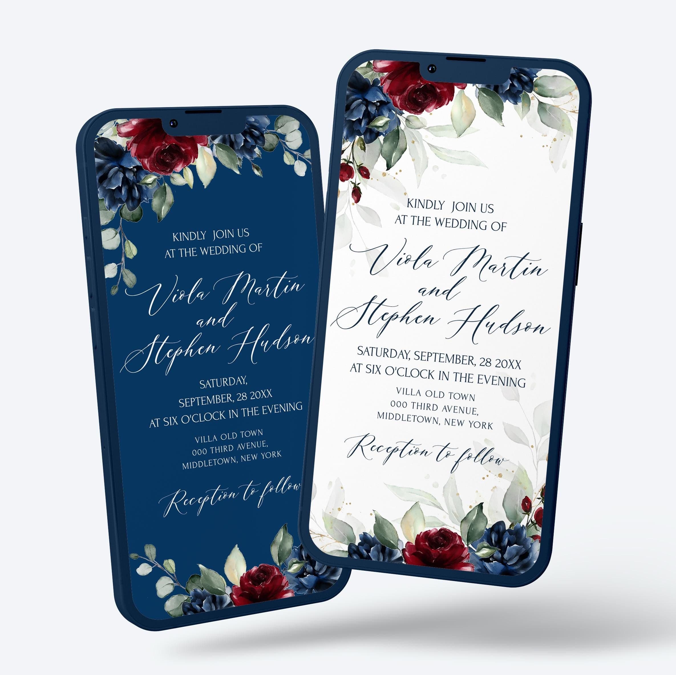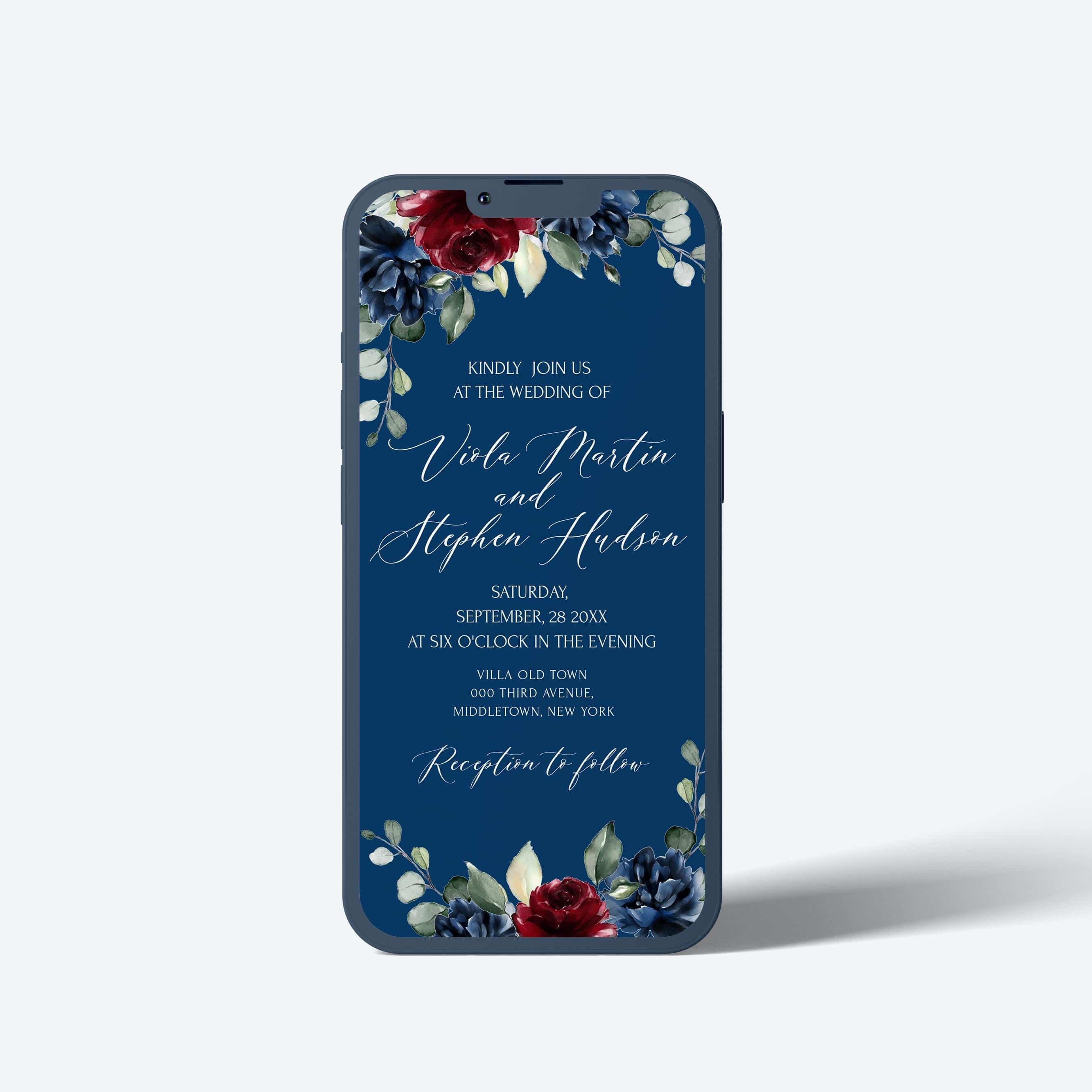 Burgundy & Navy Floral Mobile Wedding Invite, EDITABLE Templates