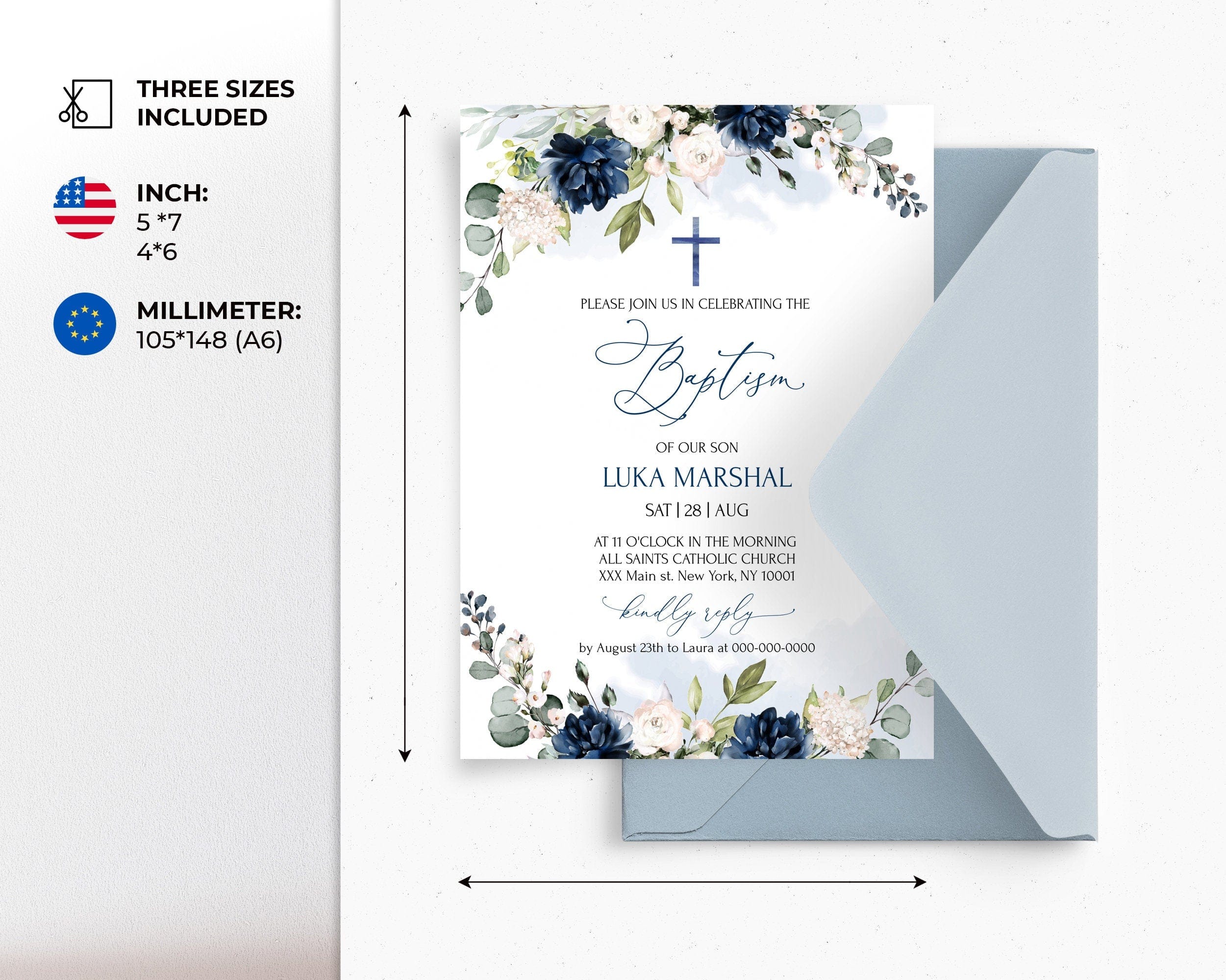 Navy Blue Floral Baptism Invitation | 3 Sizes | Printable Christening Invite