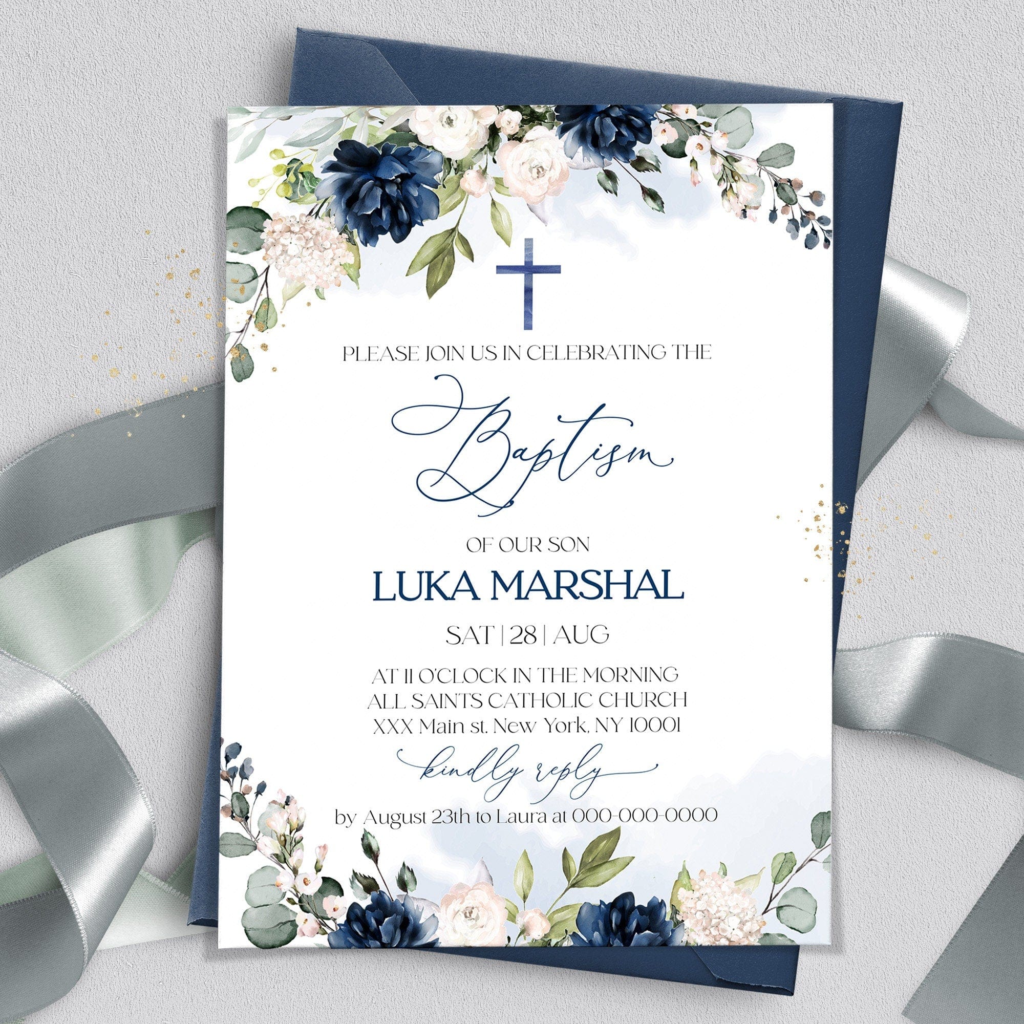 Navy Blue Floral Baptism Invitation, EDITABLE Templates