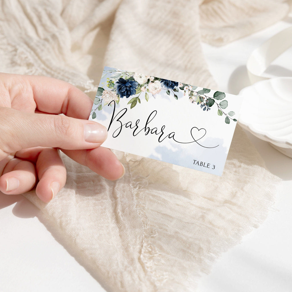 Navy Blue Floral Place Cards, EDITABLE Templates