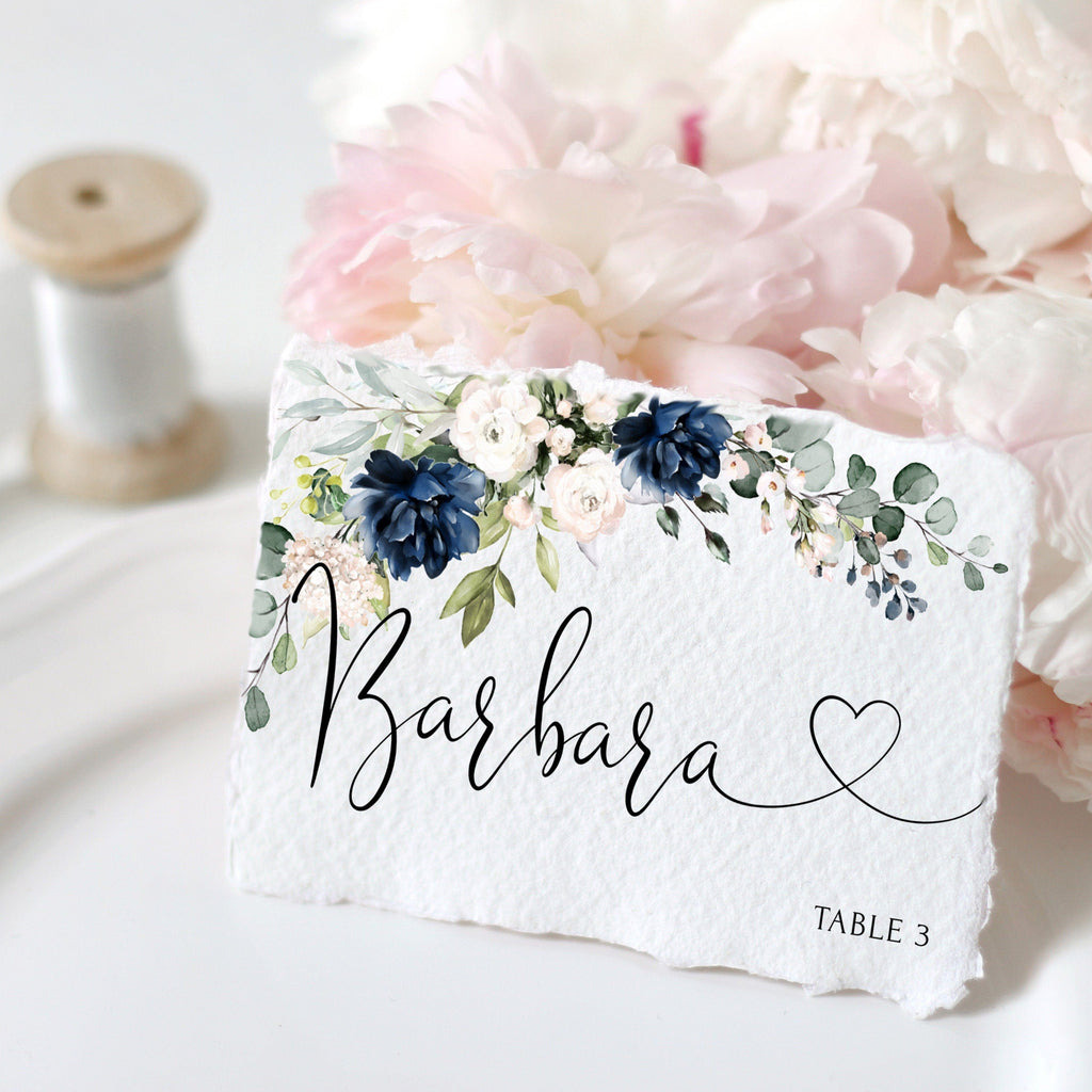 Navy Blue Floral Place Cards | 3 Items | Elegant Wedding Name Cards